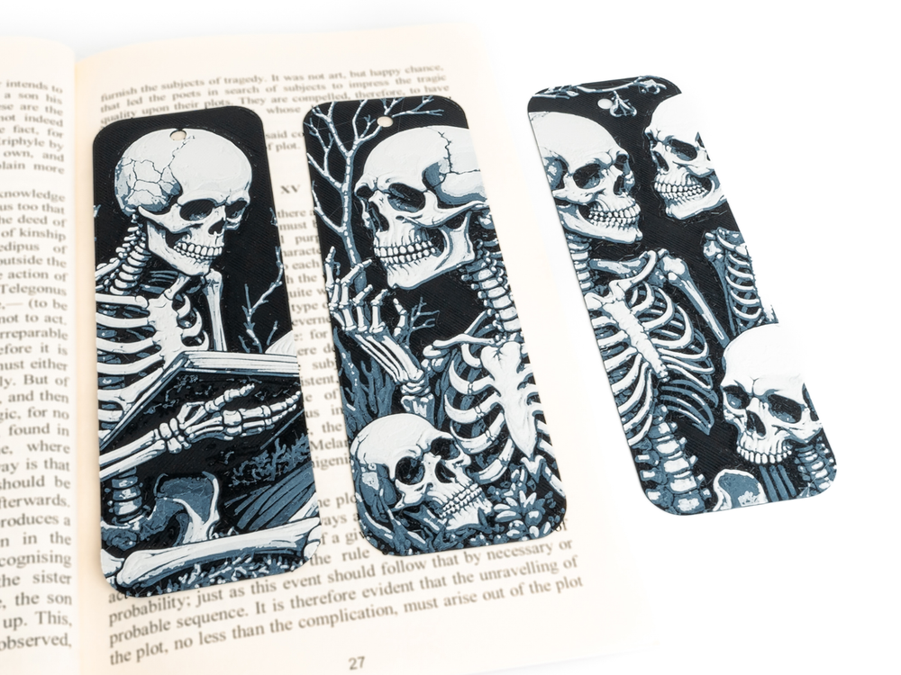 Add a gothic twist to your reading with this Skeleton Bookmark Set. Each set includes three detailed skeleton designs, perfect for horror fans, Halloween lovers, or anyone who enjoys a darker aesthetic. These bookmarks are 3D printed with sharp contrast and intricate detail, making them eye-catching and practical. Ideal for: Horror and gothic book lovers Halloween gifts and stocking fillers Unique bookmarks for everyday reading Collectors of spooky accessories Features: Set of 3 skeleton bookmarks Durable 3D printed design Slim and lightweight for easy use Striking gothic artwork Whether you’re diving into a horror novel or gifting a friend with a taste for the macabre, these bookmarks will keep your place in unforgettable style.