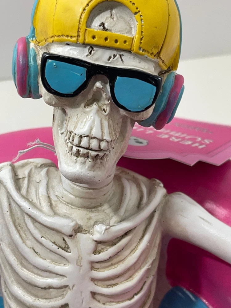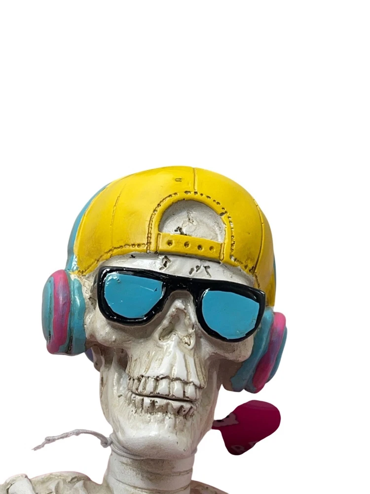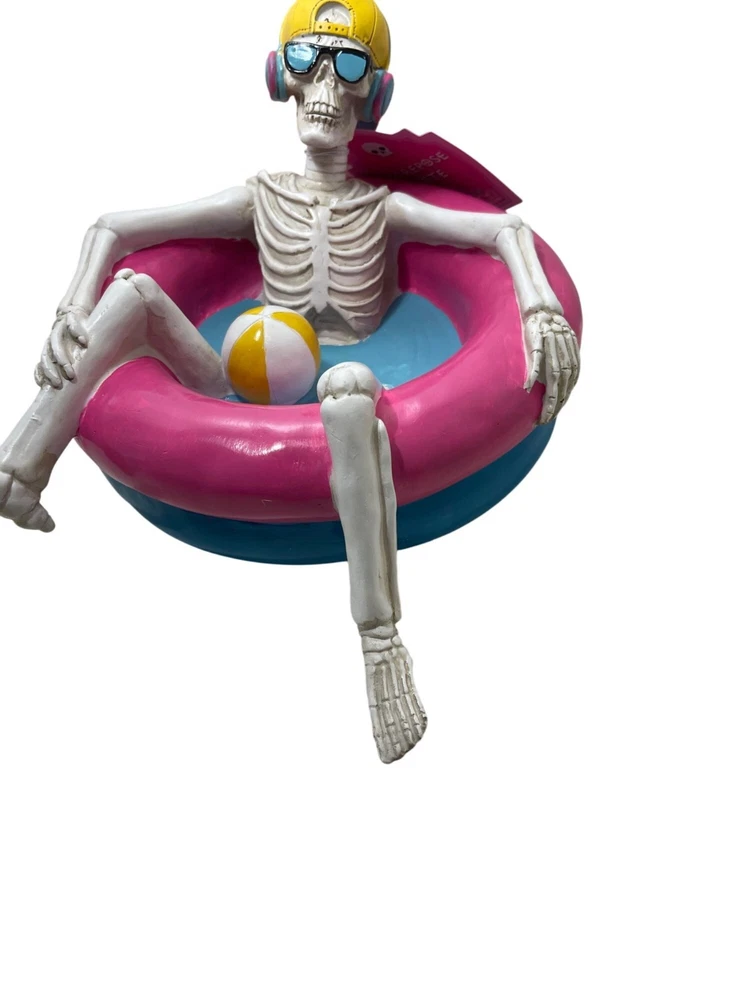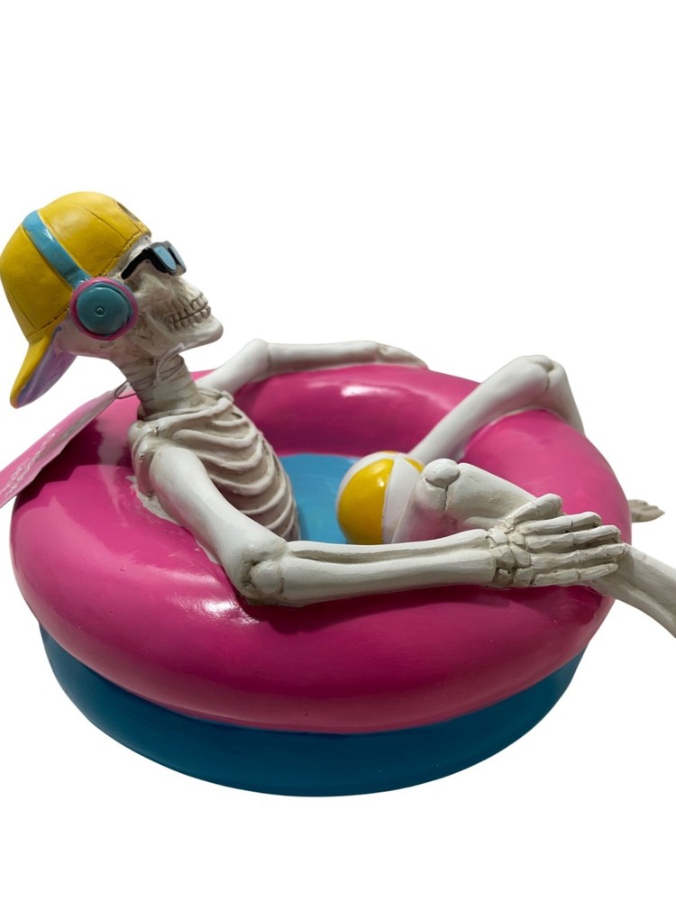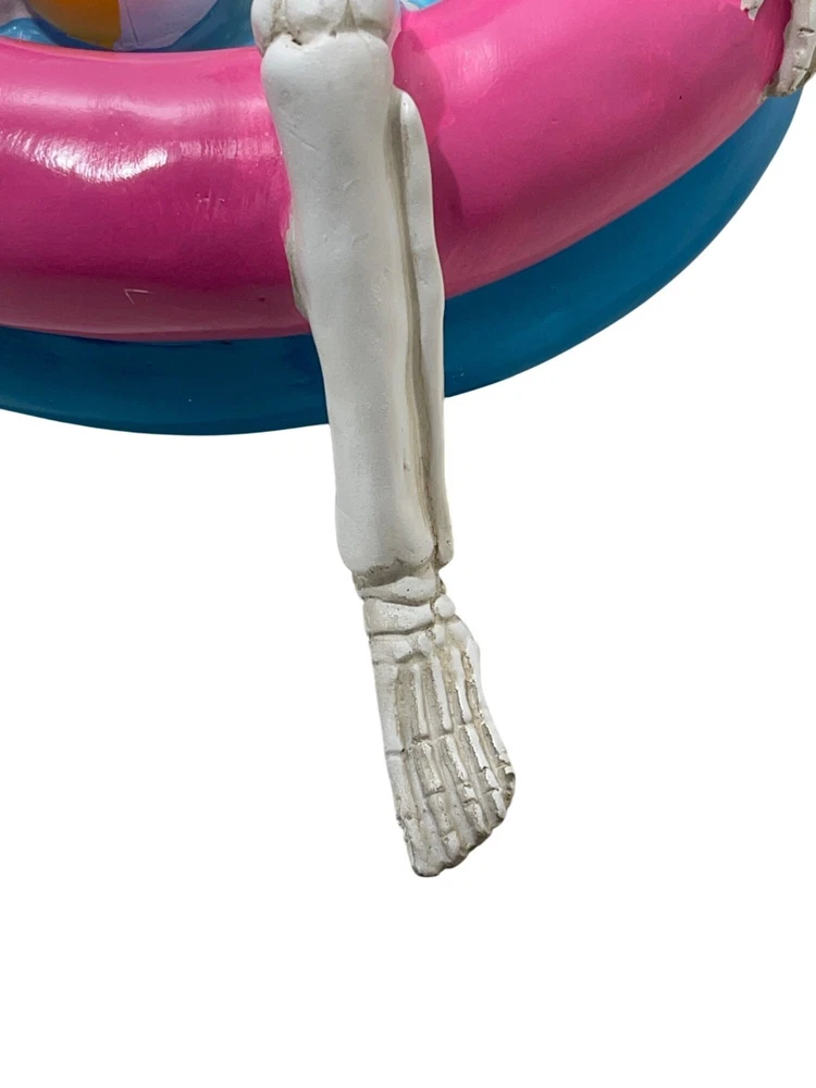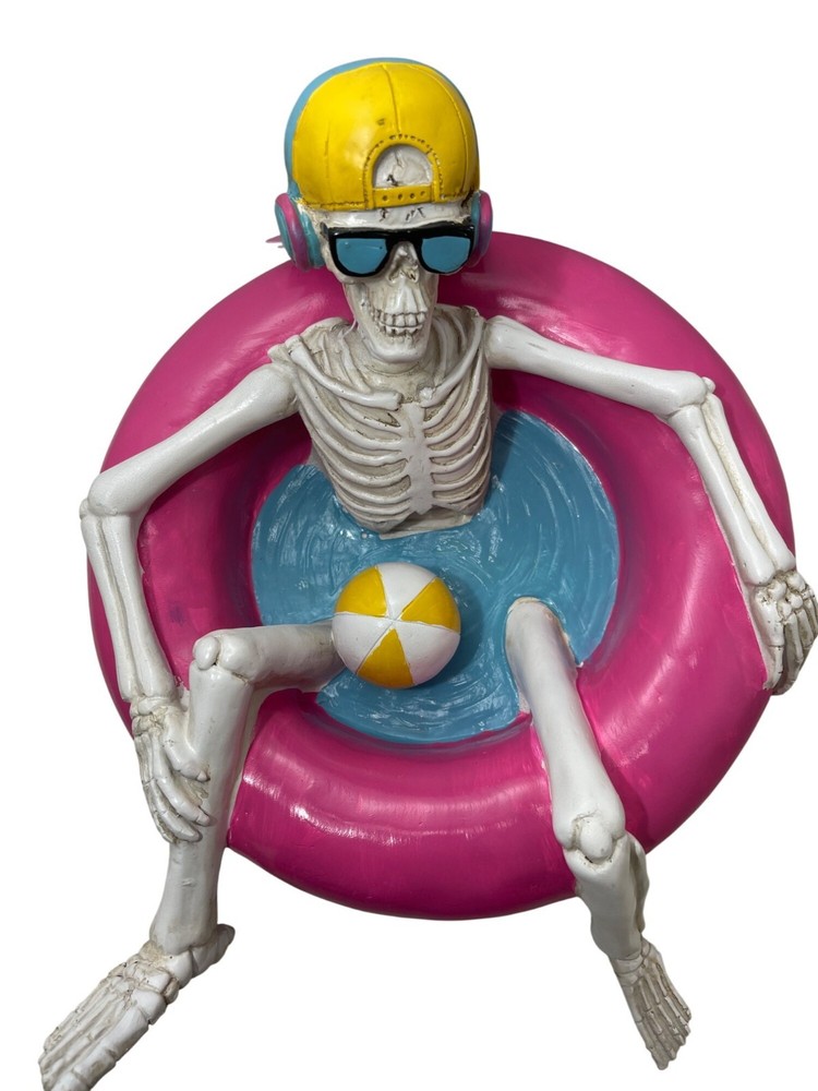 This decorative skeleton figure adds a whimsical touch to seasonal decor. Crafted with vibrant colors, it's designed to bring a unique flair to spaces. • Made of durable resin material • Features a detailed skeleton in a vibrant pool • Includes a beach ball and accessory details • Lightweight and easy to display Height = 12 inches, Width = 10 inches
