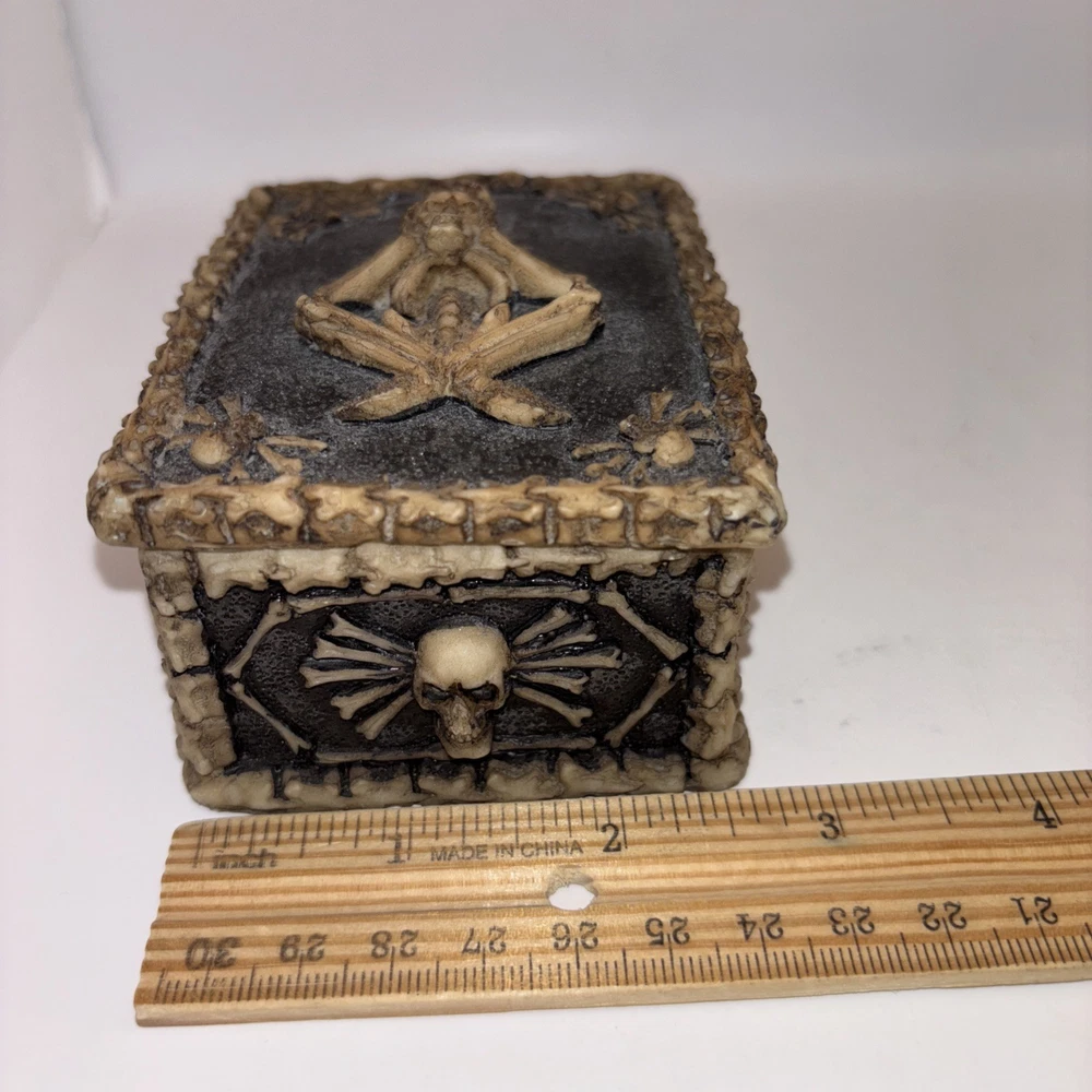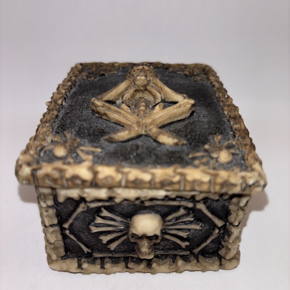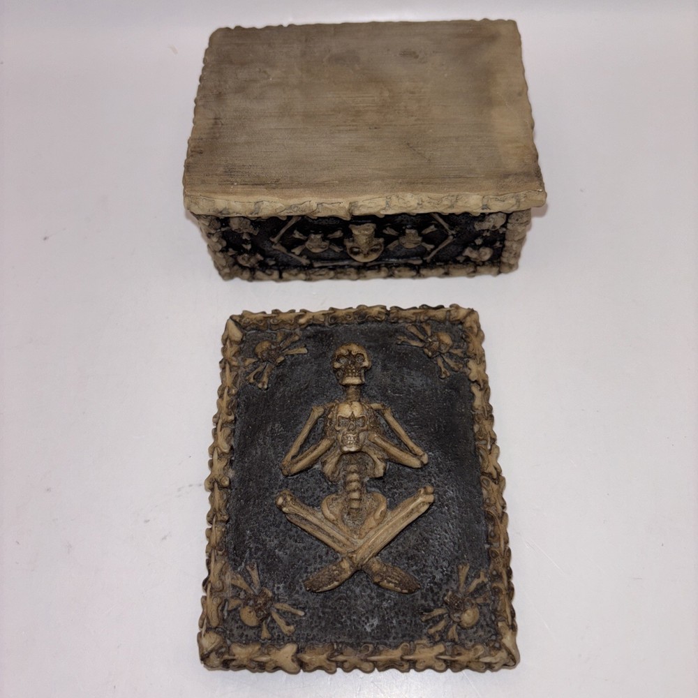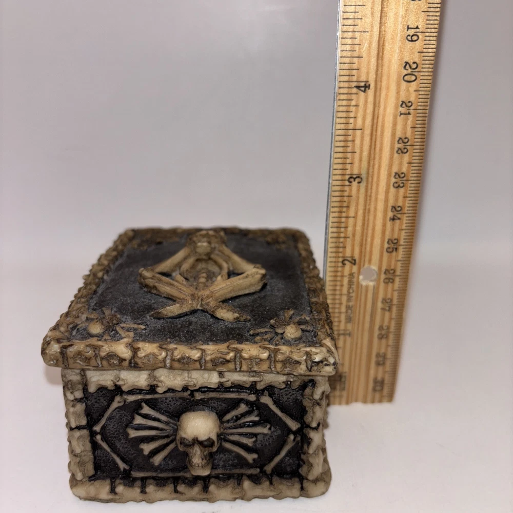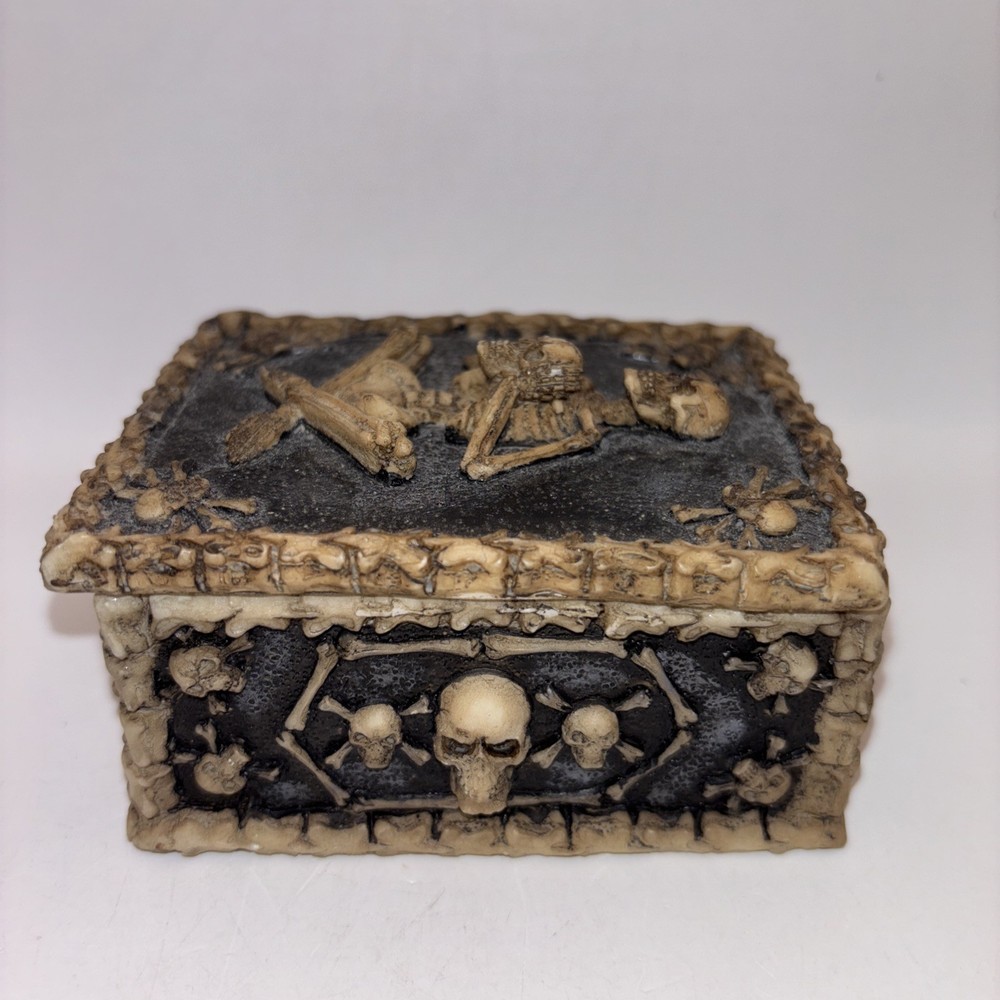 This is a resin trinket box decorated with a skeleton and skulls. Nice Halloween decor.