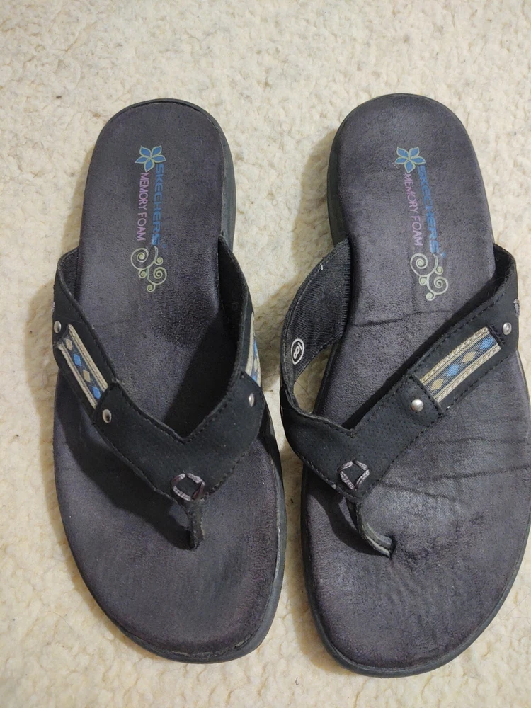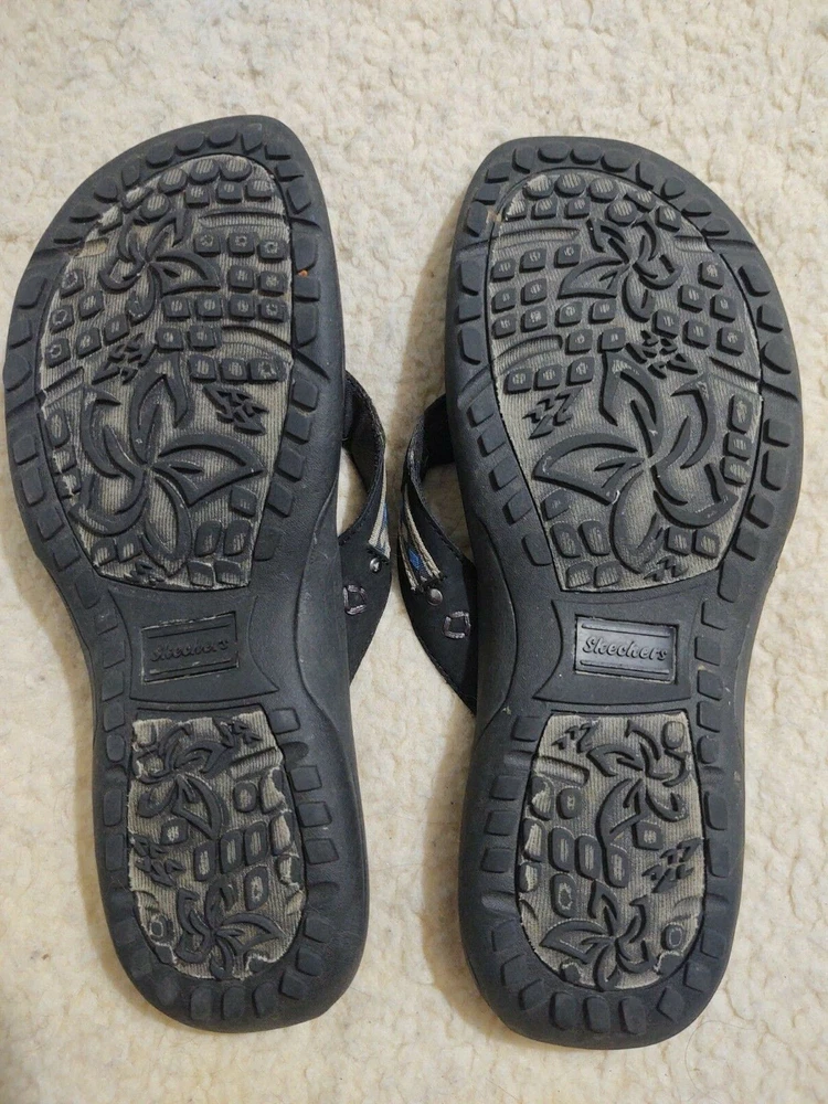 Skechers Memory Foam Flip Flops (inv21) Black with Designs, Size 8 Used but very well cared for. No holes, no tears. Overall in really good condition! From a smoke free home. Please note Iowa buyers have sales tax.