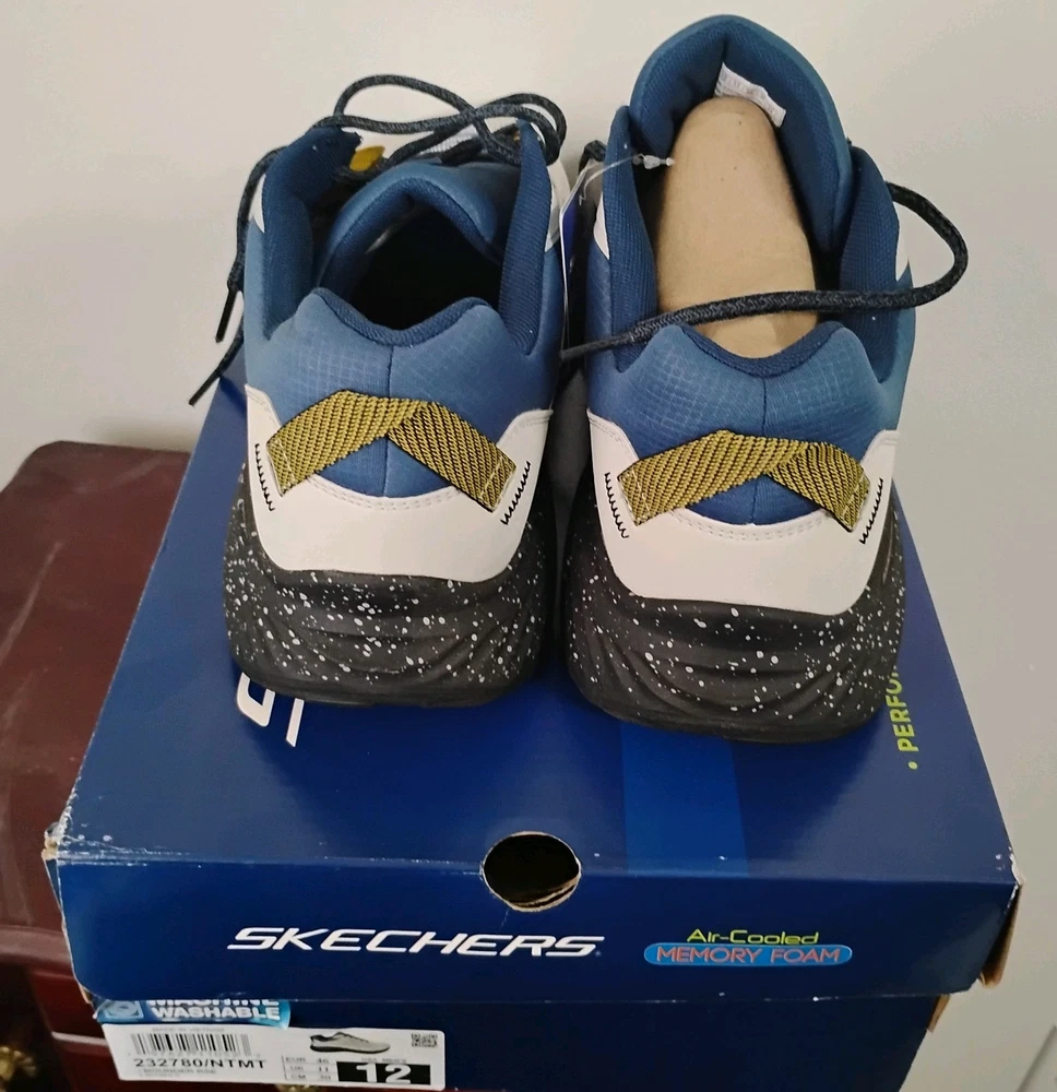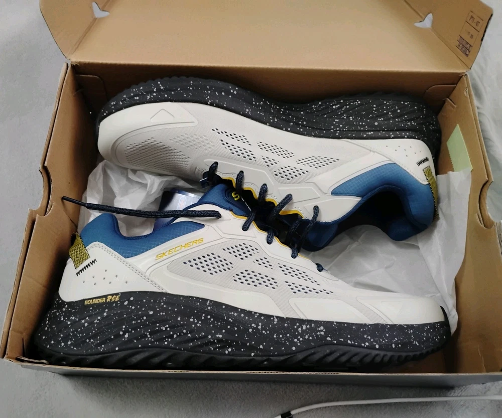 Sleek Skechers sneakers with a white body and navy accents. Features a speckled black sole. Perfect for active wear.The Skechers Bounder RSE Men's Shoes in Natural Stone Gray are versatile sneakers designed for comfort and performance. These athletic shoes feature lace-up closure for a secure fit. With a rubber outsole and fabric lining, they are suitable for various occasions such as activewear or casual wear. The beige color and low-top sneaker style make them ideal for year-round use, while the design adds a touch of classic outdoor appeal. Perfect for walking and everyday activities, these Skechers Bounder shoes offer a blend of style and functionality.