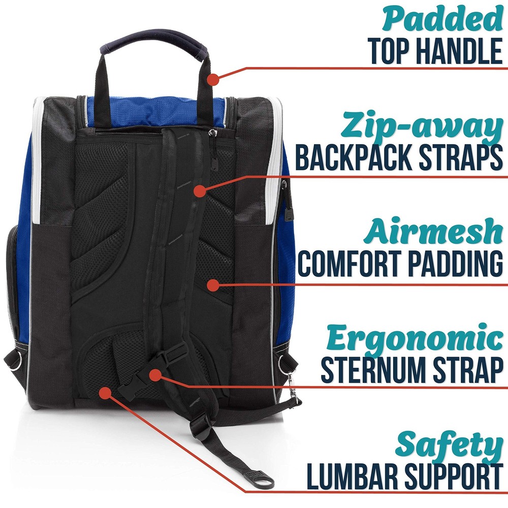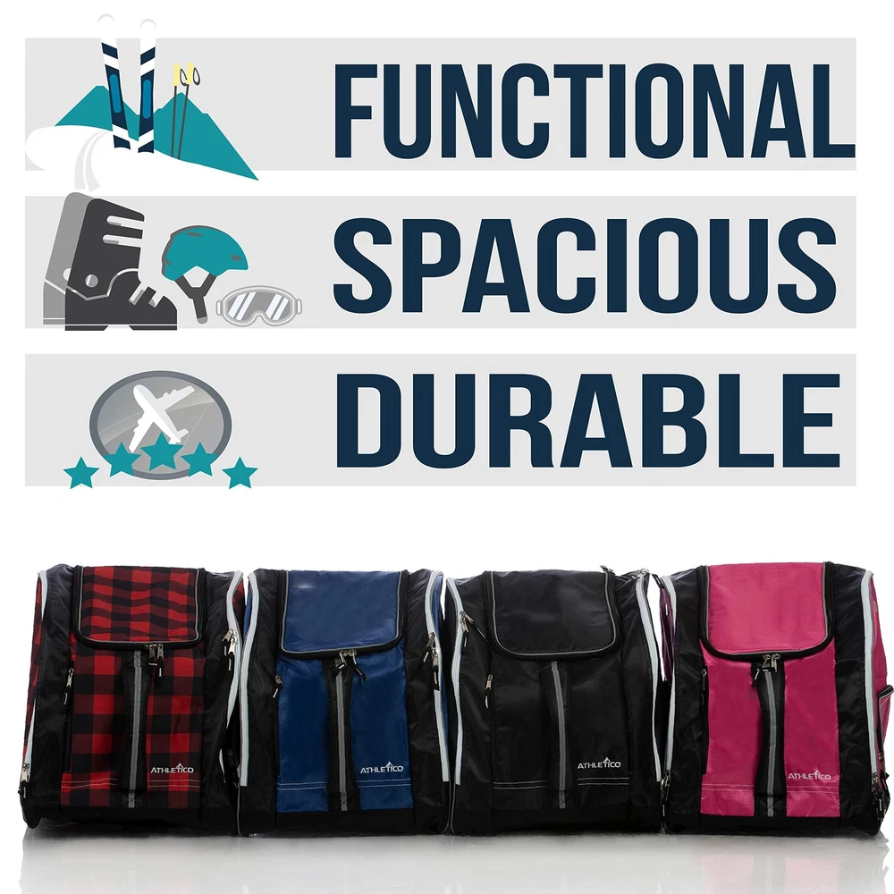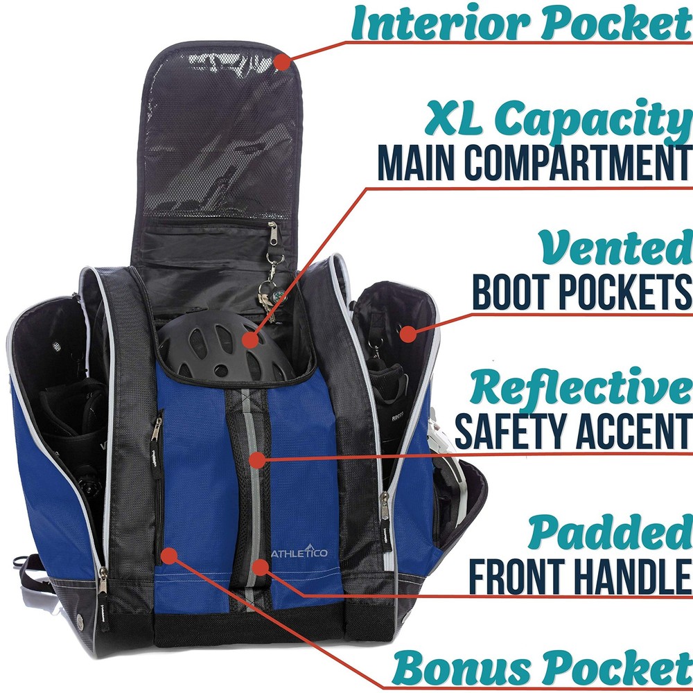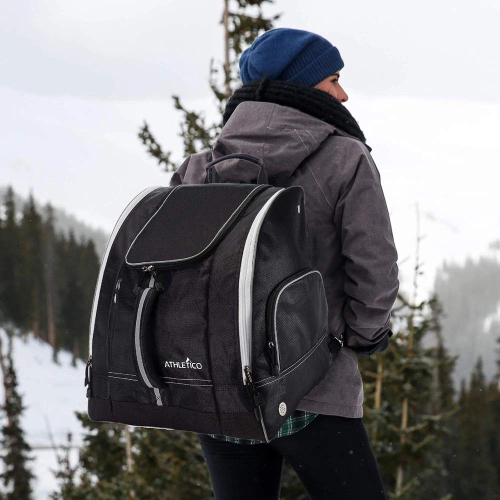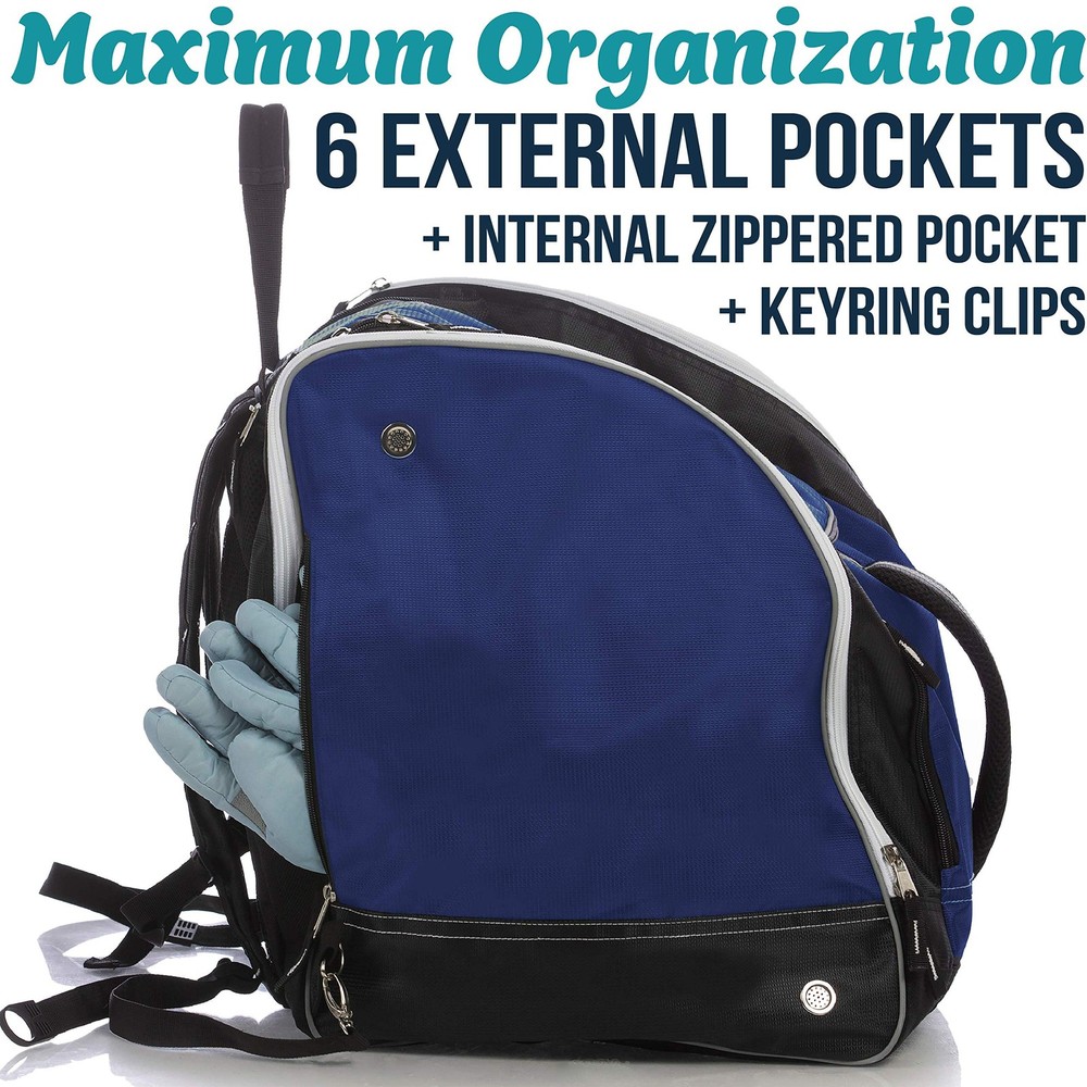 Before you head up the mountain for another run; make sure you keep all your important ski and snowboard gear close at hand with a versatile ski boot bag. Skiing and snowboarding are two of the most fun and popular winter sports in the world. But as anyone on the slopes can tell you, there is some very essential gear you need to keep close before you move from the bunny hill to mogul skiing. That’s why you need the Ski Boot Bag designed to keep all your most important ski equipment dry and within arm’s reach. Tough, Waterproof and Ready for the Snow Crafted with premium water-resistant polyester, our versatile ski bag features individual side-zippered openings to slide your ski or snowboard boots in, a large compartment for gloves, helmets, goggles and other equipment, and even padded lumbar support and shoulder straps to make it all easy to carry. If you’re looking to stay safe on the mountain and keep your essential ski equipment dry and organized, then get the only bag made specifically for ski and snowboard gear—the Ski Boot Bag . Product Details: High-Density Polyester (Waterproof Backing) Side Entry Zippered Storage (Individual Sides) Large Main Compartment Padded Lumbar Back Support Shoulder Straps (Hidden) and Carrying Handles Bungee Cord Front Internal Clips for Keys, Gloves or Small Items Grommets for Venting and Snow Drainage OUTDOOR READY – These rugged boot bags for skiing and snowboarding are great for storing boots, jackets, helmets and ski gear up the snowy slopes. VERSATILE STORAGE – Each ski boot bag offers side-entry zippered storage to store ski/snowboard boots separately, and a large main compartment for gear. TRAVEL FRIENDLY COMFORT – These snowboard boot bags boast padded lumbar back support, hidden straps for carrying, and top/front padded handles. TOUGH, WATERPROOF AND READY FOR THE SNOW - Crafted with premium water-resistant polyester, our versatile ski bag features individual side-zippered openings to slide your ski or snowboard boots in, a large compartment for gloves, helmets, goggles and other equipment, and even padded lumbar support and shoulder straps to make it all easy to carry ADDITIONAL SAFETY – When slopes get foggy or dusk creeps in, the reflective piping on the side and carrying handles helps you be seen more clearly by skiers.