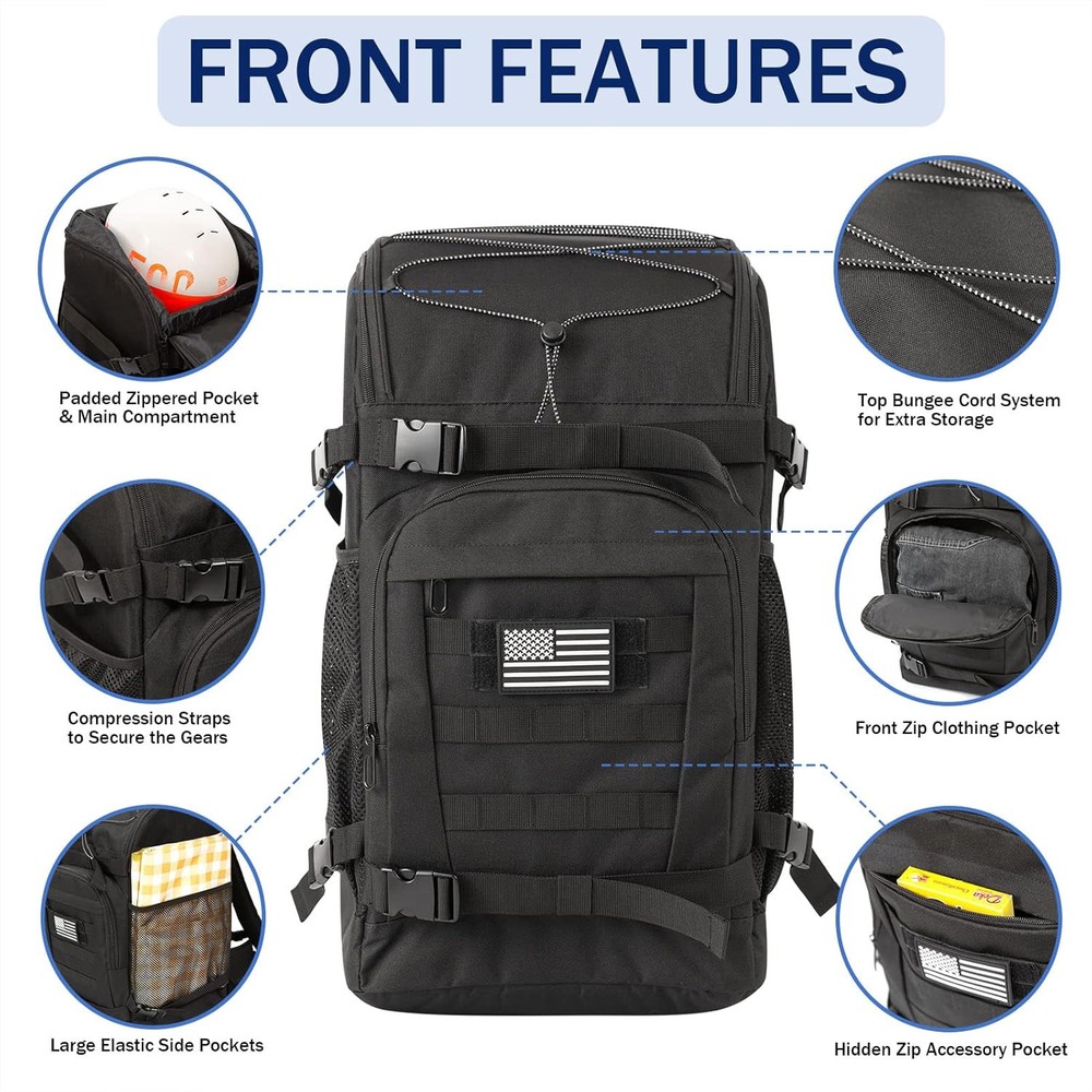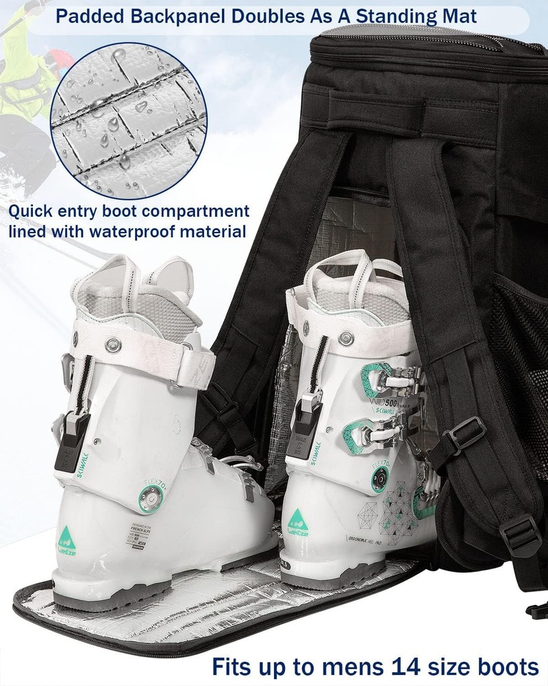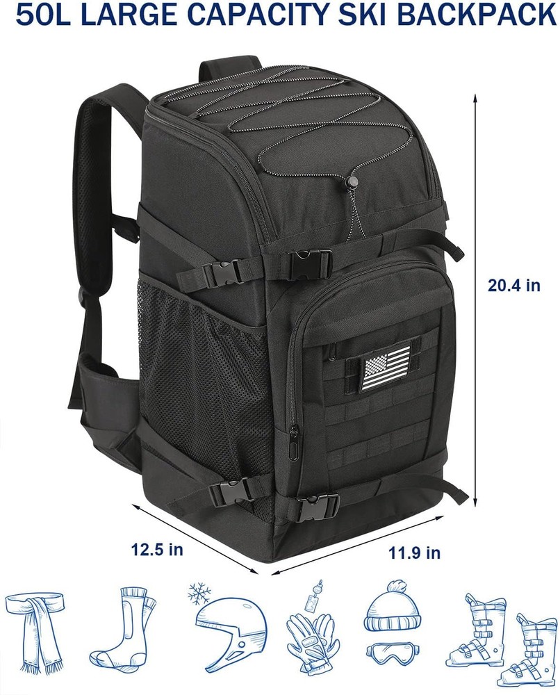 Ski Boot Bag Snowboard and Ski Backpack 50L Padded Travel Boot Bag for Snowboard Boots, Helmet, Goggles, Gloves Durable Unisex Ski Bag Product Details Package Dimensions: 14.5 x 10 x 5 inches Item Weight: 2.35 pounds Department: Unisex Adult Item model number: ZSHXB2022 Number Of Items: 1 Makes You a Better Skier: The DAUSROOB ski boot backpack is a backpack designed for Ski Fans. DAUSROOB has created the ideal personalized product for cross-country and touring skiers, adults and youths.Every DAUSROOB product is the perfect combination of heart, soul and passion, reflecting the expertise and passion of designers. Updated Backpanel Construction: The ski bag is equipped with padded shoulder straps and back panel that make transporting ski accessories even more comfortable.. You can get a great fit with the adjustable shoulder, waist, and chest straps. They all work together so you can wear this padded ski backpack for several hours comfortably. Practical 50L Boot Bag: The main compartment has sufficient storage space for helmet, gloves, hat and clothing; everything is easily accessible thanks to the all-round two-way zip. Additional zipped front pockets for quick access to sunscream, gloves or other small items. Side pockets for extra storage. With Wet Compartment: The functional DAUSROOB winter snowboard bag with separate boot storage. It can be loaded perfectly using the back zip opening.The water-repellent boot compartment is lined with PEVA material which keeps moisture and dirt on the boots separate from the spacious main compartment. Make The Trip Easy : Carry-on size fits most airline overhead compartments; Designed with multiple compression straps so you can tighten your pack down for a great fit that will reduce bounce; An integrated floor mat that ensures dry feet and socks when changing ski boots.
