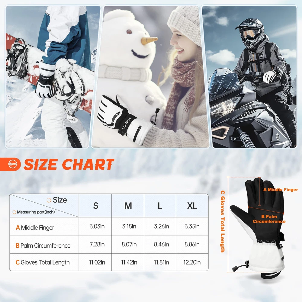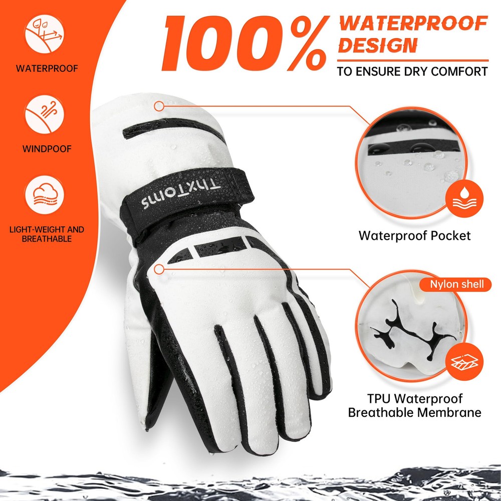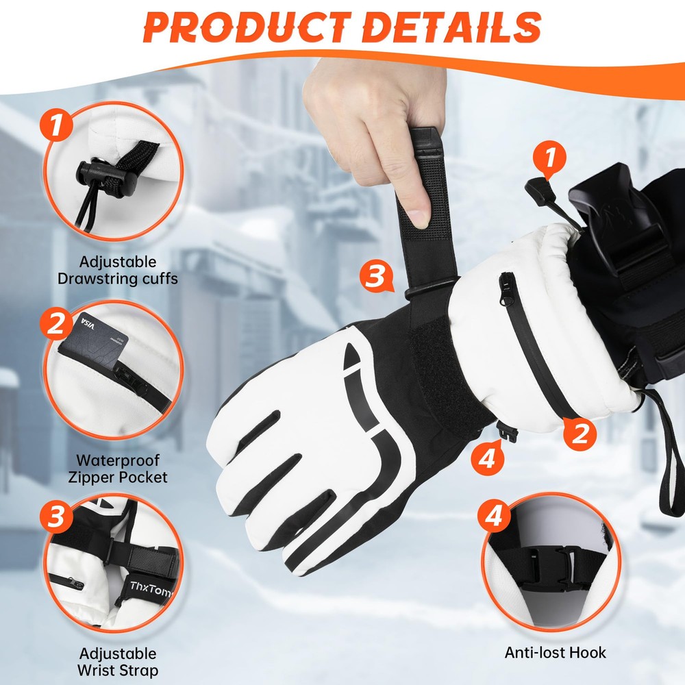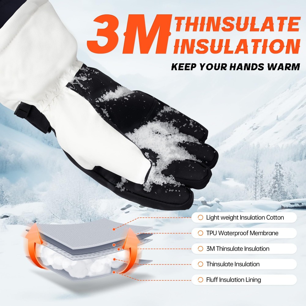 【Superior Warmth】: Our Ski Gloves feature 3M Thinsulate Insulation for exceptional warmth, keeping your hands cozy in cold weather conditions. The spray-bonded cotton provides excellent loft and insulation. 【Waterproof and Breathable】: Equipped with a TPU breathable waterproof membrane, our gloves keep your hands dry and comfortable while allowing moisture to escape. This prevents water infiltration and maintains optimal breathability. 【Enhanced Grip and Durability】: The gloves have a nylon shell with a full palm PU grip, offering exceptional slip resistance and durability. You can have a firm hold on your ski poles or other equipment, even in challenging conditions. 【Innovative Design Features】: Designed with practicality in mind, our gloves include features such as adjustable magic straps for a personalized fit, windproof cuff with drawstring to keep out snow and wind, anti-loss strings to prevent misplacement, and touchscreen compatibility on three fingers for convenient device use. 【Touchscreen Compatibility】: Designed for convenience, the gloves offer three-finger touchscreen capability, with full coverage touch-sensitive fingertips on the index finger for improved sensitivity. Compared to most gloves in the market with single-sided touchscreen compatibility, our gloves provide more sensitive touch response with full coverage.