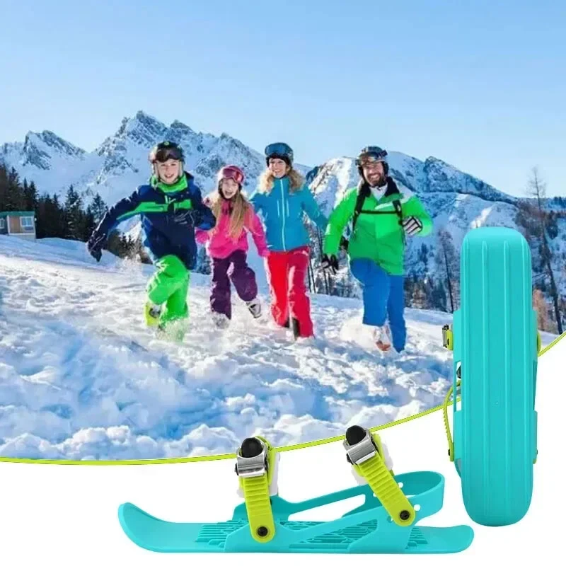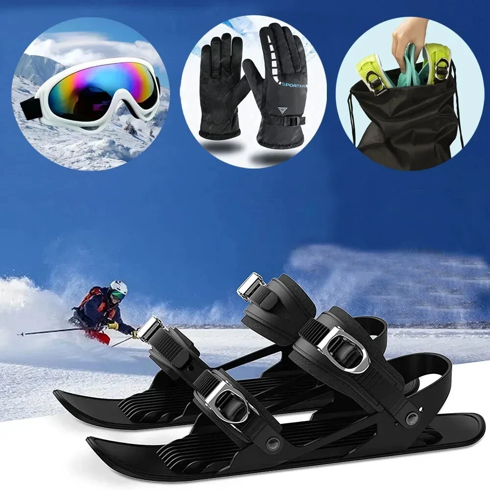 The set includes: 1 pair of shoes, 1 pair of protective goggles, 1 pair of warm gloves, 1 portable bag+color box for shipping Outdoor travel, snow skiing, snowboarding shoes, snow walking, snowboarding [Product Name]: Mini Ski Skates [Product Material]: ABS+Nylon+Aluminum Alloy [Product Color]: Black Green 【 Product Size 】: One size fits US 5-14 EU35-48 [Product size]: 44 * 15 * 13cm 【 Product Weight 】: Box: 1850g Bundle Pocket: 1550g (1 pair) 【 Packaging Size 】: Color box size: 45 * 15 * 13cm [Packing Specification]: 54 * 48 * 48cm 12 pairs/box gross weight 23 kilograms Generation 1: Product weight: Box: 1700g Bundle pocket: 1552g (1 pair) (Packing specifications): 60 * 40 * 38.5cm 12 pairs/box gross weight 20.5kg 50 * 40 * 40cm 10 pairs/box gross weight 18 kilograms Second generation: [Product weight]: Net weight 1052 grams [Product Packaging]: Black Bundle Pocket 45 * 35cm 1085g English color box packaging 37 * 15 * 10cm 1280g 【 Packing Specification 】: Bundle bag packaging 12 pairs/box 50 * 40 * 40cm, approximately 14kg Color box packaging 14 pairs/box 60 * 40 * 38.5cm, approximately 19kg Children's edition: [Product size]: 39 * 12 * 8cm 【 Suitable Size 】: 32-40 [Packaging size]: 39 * 14.5 * 12cm 【 Product Weight 】: Box: 1180g Bundle Pocket: 1000g (1 pair) [Packing Specification]: 60 * 40 * 38.5cm 14 pairs/box gross weight 18 kilograms 60 * 40 * 38.5cm 16 pairs/box gross weight 17 kilograms Children's products need to be shipped in a bundled bag. Please take a box and leave a note A combination of skiing and ice skating. Ski shoe accessories that turn shoes into mini skis Snow feet can be directly fixed to winter shoes or ski boots. Adjustable straps can be connected to any shoe. One size fits all. We recommend wearing snowshoes in sizes 5-14 US/35-48 EU. It can fit into any bag, so you can carry it with you. You don't need ski boots or any other heavy and expensive equipment. Made in Guangdong, China. The product is made of highly durable ABS nylon reinforcement material. The metal skiing edge can be easily stopped. Landslides on slopes, snow parks, hiking trails, or simply enjoying fun in local sleds or backyards.