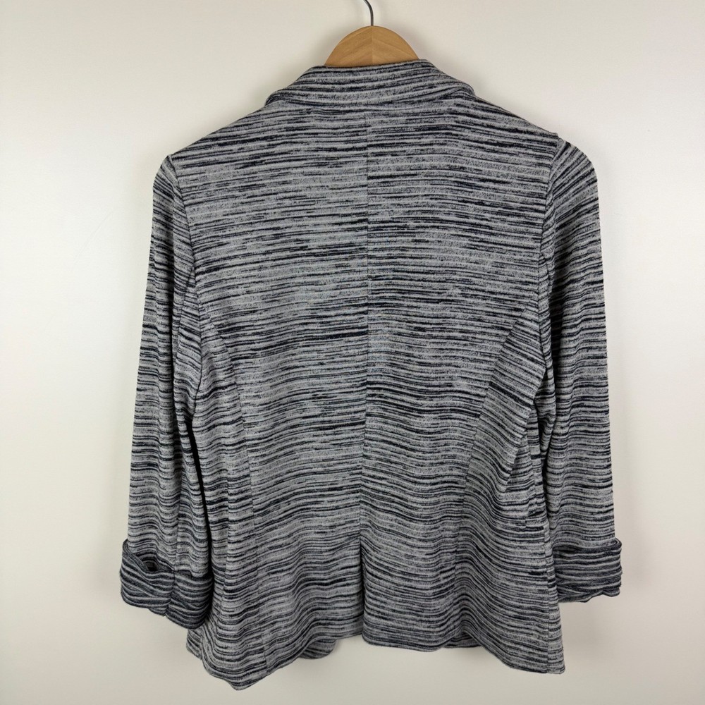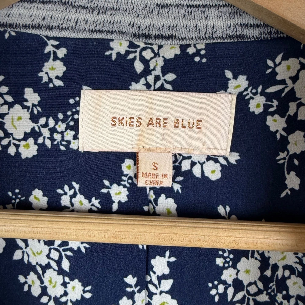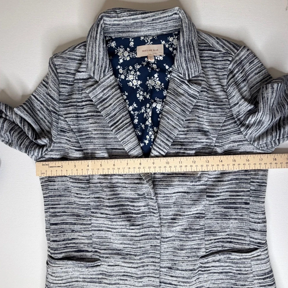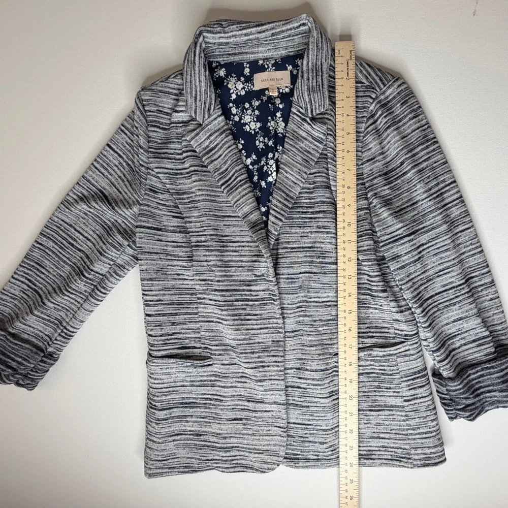Good Pre-Owned Condition (see pics for details) Flaws: Has pilling throughout, including inside lining. A stylish gray striped knit blazer from Skies Are Blue. This blazer features a beautiful navy floral print lining for a pop of color and personality. The rolled cuff sleeves add a touch of casual sophistication. Perfect for layering over tops for a polished look at the office or for a chic evening out. Type: Blazer Outer Shell Material: Polyester Style: Basic Jacket Department: Women Lining Material: Polyester Theme: City, Hipster Accents: Button Features: Pockets, Unlined, Lightweight, Breathable Fabric Type: Knit Pattern: Striped Season: Spring, Fall Occasion: Casual, Workwear Sleeve Length: 3/4 Sleeve Keywords: striped blazer, knit blazer, floral lining, women's blazer, casual blazer, office wear, evening wear, lightweight jacket, rolled cuffs, preppy, business casual, layering piece, sophisticated, Skies Are Blue, Blazer, Knit Blazer, Open Front, Career Jacket, Small, Stretch, Lightweight, Casual Blazer, Officewear, Workwear, Gray Striped Measurements: included in photos. Please compare the measurements to something you already own for a great fit! Fast shipping: Shipped out next business day! Please let us know if you have any questions!