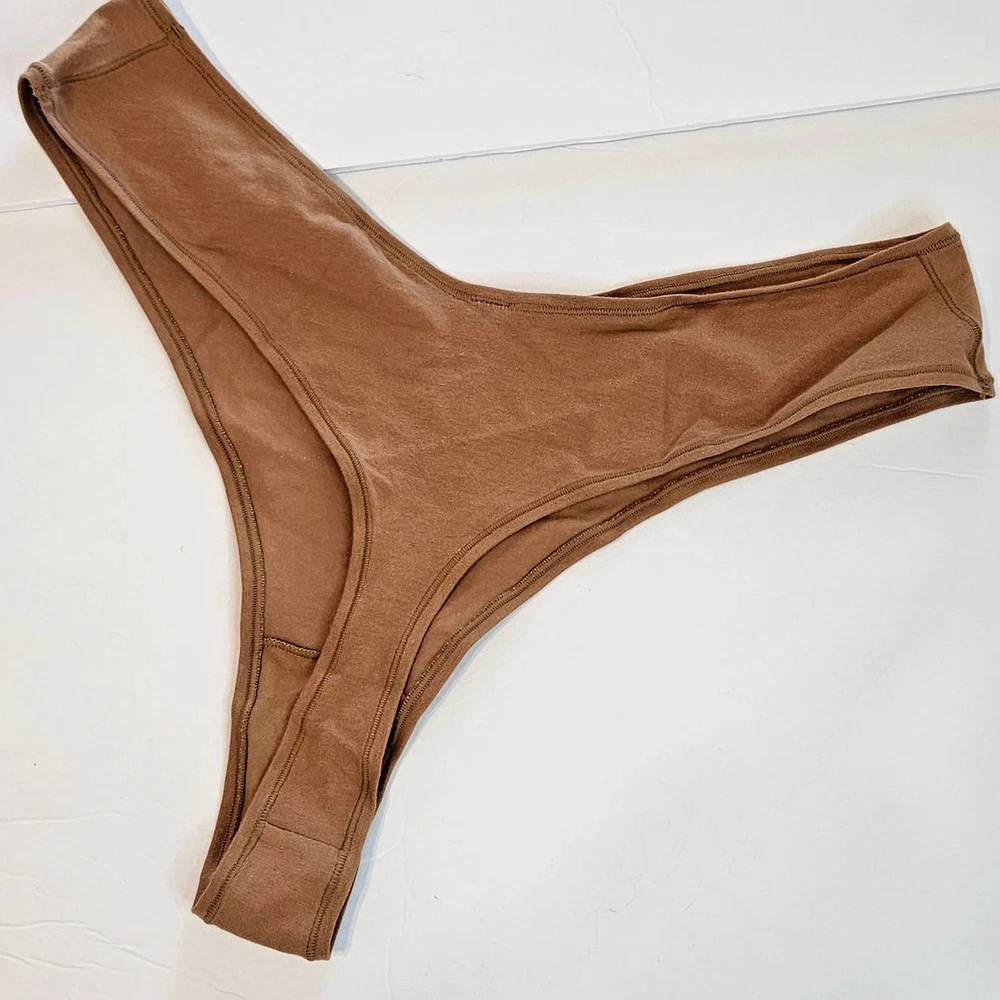 Skims Camel Cotton Jersey Dipped Thong Panty Featuring a dipped front and high cut fit, this flattering throwback thong underwear style is updated in a stretchy cotton material for comfort. Dip Front Thong, Designed To Style To Wearers Preference (High Or Low On Hips), Thong Back For No Visible Panty Lines, 100% Cotton Jersey Gusset Lining, Special Pickstitch On Waist And Leg Opening For Added Design Detail Yumi Is Size 14 And 5’11”, Wearing A Skims 2x 90% Cotton / 10% Spandex Machine Wash Cold pn-dth-0271 Color - Camel Size 4x Approximate Measurement: waistband - 14" across New with tags, no flaws. Stock photo is the same style, different color. Smoke free, dog friendly home.