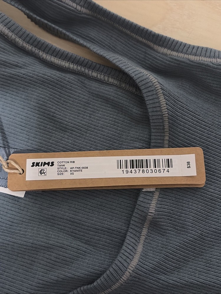 The Skims Cotton Rib Tank in size XS in Kyanite is a stylish and comfortable addition to any woman's wardrobe. Made from soft cotton material, this tank top features a flattering ribbed design and comes in a vibrant kyanite color. Perfect for casual or dressed-up occasions, this tank is a versatile piece that can be easily paired with jeans or a skirt for a fashionable look. The Skims brand is known for its quality and attention to detail, making this tank a must-have for any fashion-forward individual.