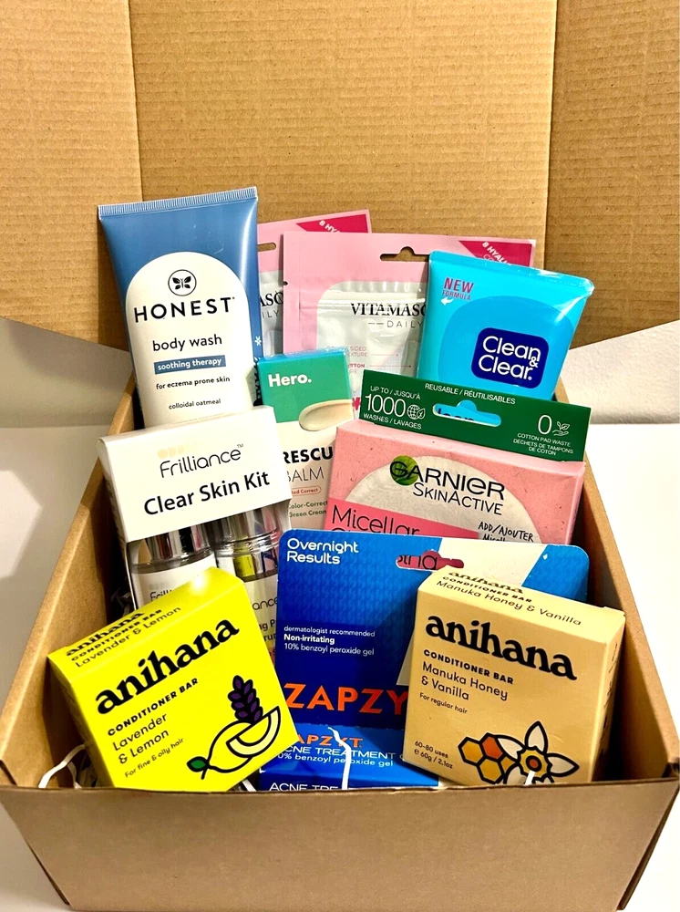 This 10 piece skin care bundle is a great gift idea or a fantastic way to pamper yourself. Replenish, Nourish, Repair, and Hydrate with this 10 piece skin care assortment. *Bundle includes* ($104 Value) Frilliance Clear Skin Kit - Perfecting Primer .5 fl. oz., Refreshing Facial Mist 1.7 fl. oz. for all skin types. Gives skin a refreshing dose of hydration with botanical extracts that fight acne. Honest Advanced Therapy Body Wash 8.0 fl. oz., - gentle moisturizing cream made with prebiotics and natural ingredients like colloidal oat and coconut & safflower oils to help relieve dry skin. Hero Cosmetics Rescue Balm + Red Correct Color Correcting Cream for blemishes 15ml., camouflages redness. Clean & Clear Oil Free Deep Action Cream Cleanser 6.5 fl. oz., with Pro vitamin B5 & BHA, gently cleanses for all skin types. Vitamasques Ultra Hydrate & Radiance Watermelon Pads for all skin types, 2 packs with 10 pads in each, double sided pads for varying levels of exfoliation. Anihana Conditioner Bars Manuka Honey & Vanilla / Lavender & Lemon, 2 bars, soap free, paraben free, leaves hair soft and rejuvenated. Garnier Skinactive Micellar Cleansing Eco Pads includes 3 pads, thoroughly remove makeup and cleanse skin without harsh rubbing, ultra soft and reusable. Zapzyt Maximum Strength 10% Benzoyl Peroxide Acne Treatment Gel 1 oz., all skin types. Micronized non irritating benzoyl peroxide, oil free, odorless gel, water based contains no alcohol to prevent over drying.