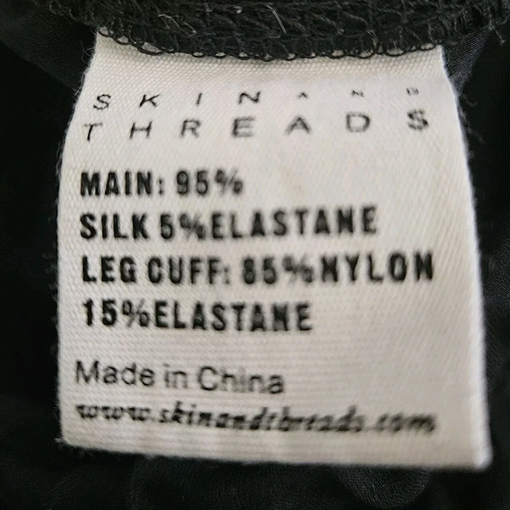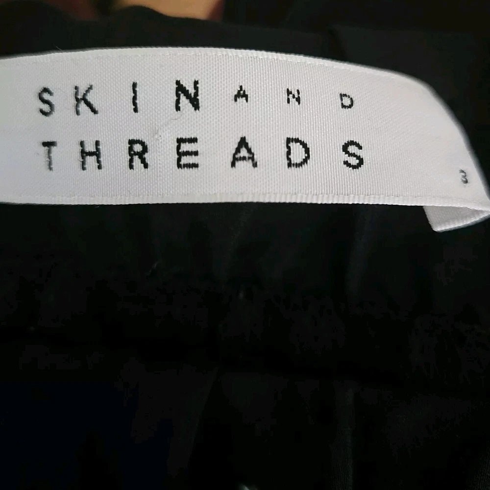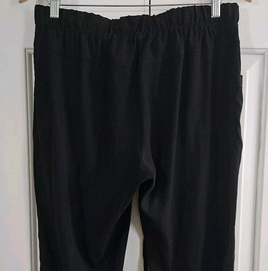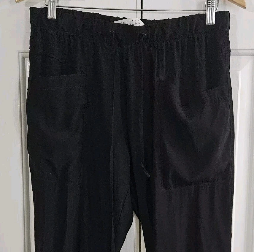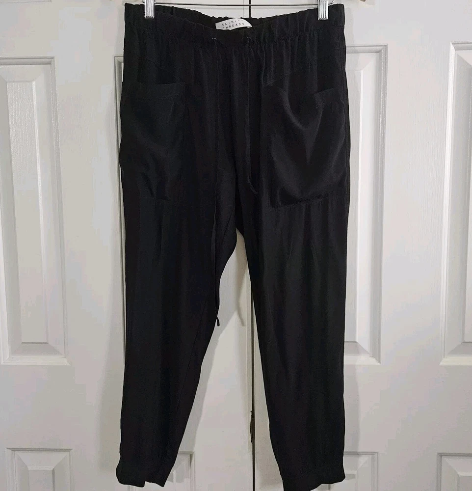 Personalize: No Style: Jogger Closure: Pull On Waist Size: 32 in Occasion: Casual, Travel Features: Elastic Waist, Lightweight, Pockets, Stretch Department: Women Inseam: 25.5 in Material: Silk, Spandex Color: Black Leg Style: Tapered Fabric Type: Satin Brand: Skin and Threads Season: Fall, Spring, Summer Vintage: No Pattern: Solid Type: Pants Size: 3 Rise: High (Greater than 10.5 in) Size Type: Regular Garment Care: Dry Clean Only Handmade: No Seller Notes: “Good pre-owned condition, no flaws”