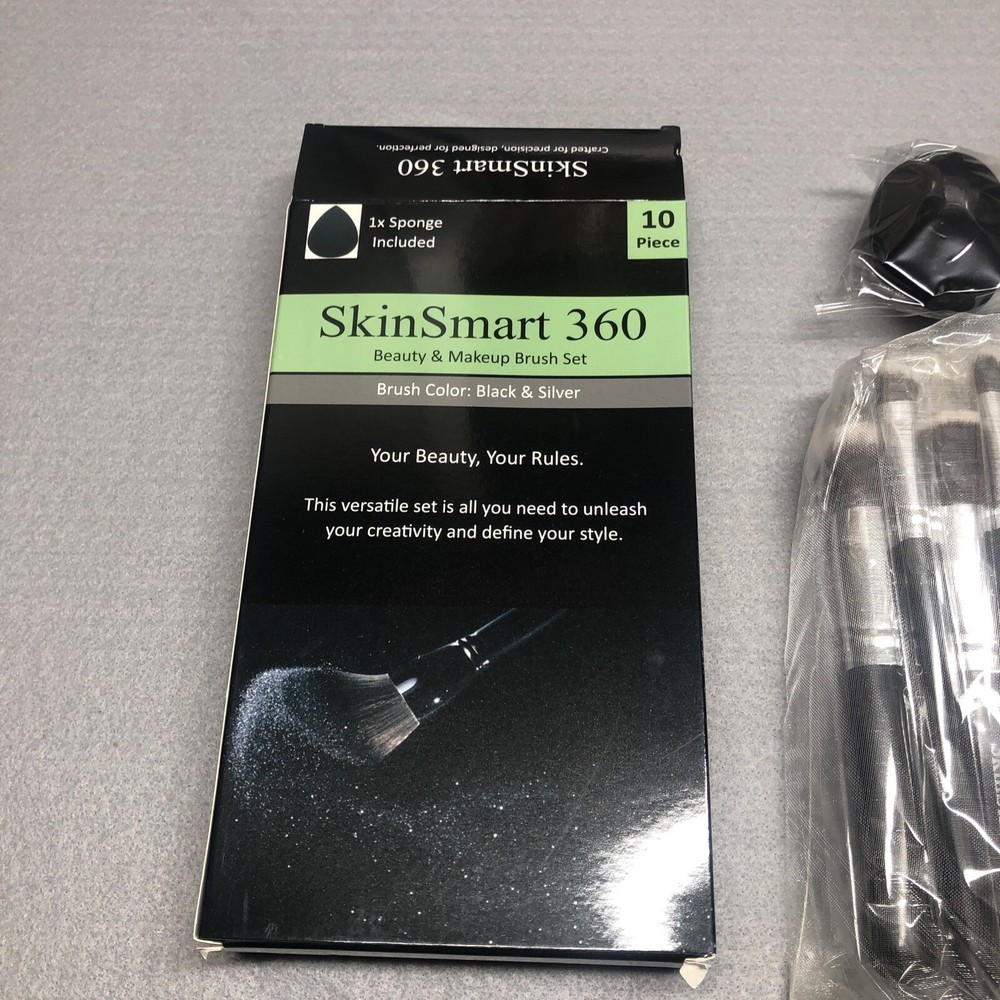 SkinSmart 360 Makeup Brush Set 10 Piece Black & Silver + Sponge Beauty Kit.