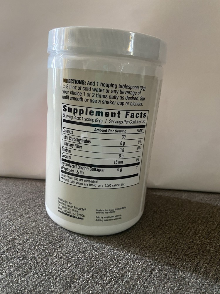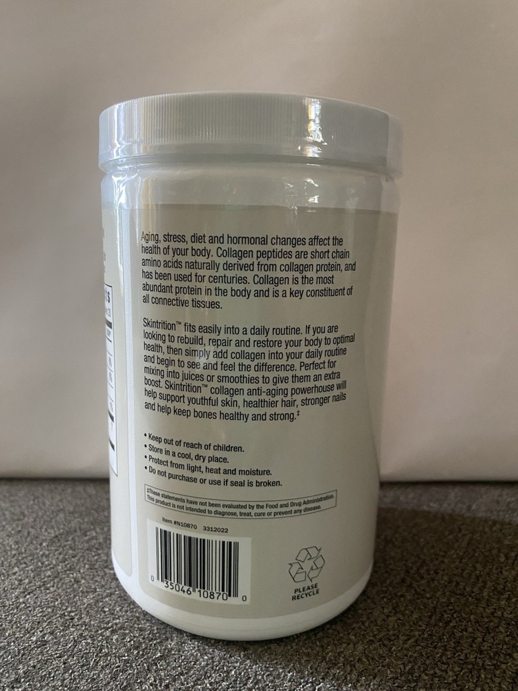 Formulation: Powder Volume: 6.35 oz Main Purpose: Anti-Aging, General Wellness, Hair, Skin & Nail Health Dosage: 1 scoop ( 9g ) Department: Adult, Teens, Unisex Ingredients: Collagen UPC: 0035046108700 Expiration Date: 05/2026 Number of Pills: 20 Serving Is Not A Pill Country/Region of Manufacture: United States Flavor: unflavored Active Ingredients: Collagen, Peptides Type: Vitamin gtin13: 0035046108700 MPN: n/a Brand: Skintrition Features: Unflavored When to Take: 1 or 2 Time Daily As Desired