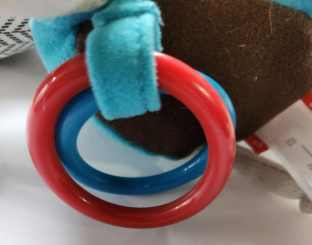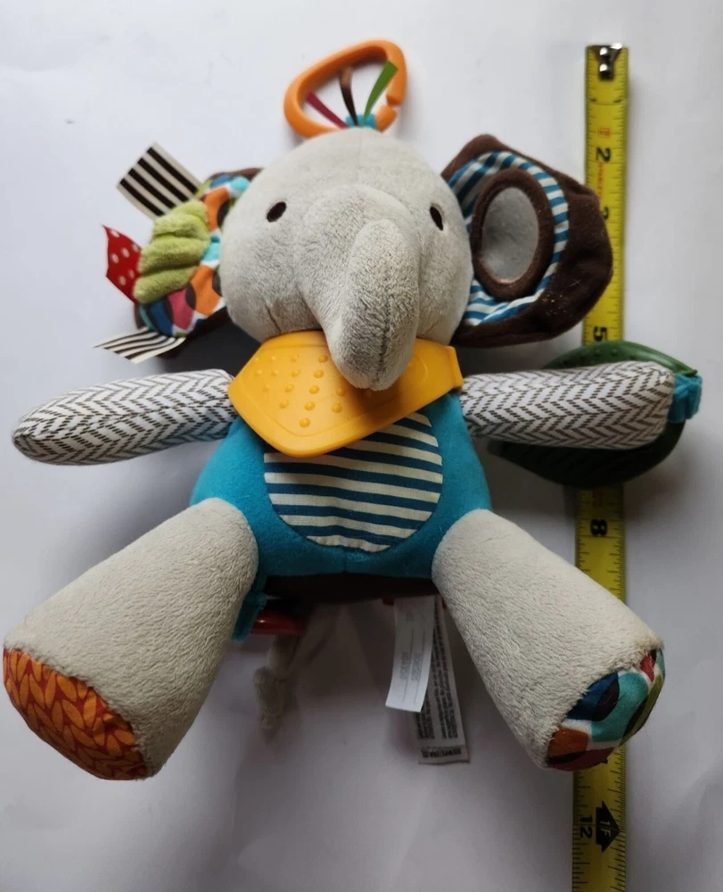 This Skip Hop baby activity elephant toy offers engaging sensory play with its vibrant colors and multiple textures. It features a teether and rings for tactile stimulation, encouraging motor skill development. Designed for durability and safety, it is made from polyester fiber and includes attachment loops for easy hanging. • Teether for soothing gums • Durable polyester fiber • Multiple textures and colors • Easy-to-hang loops • ASTM safety compliant