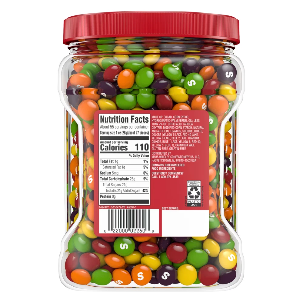 Product Features: Features strawberry, orange, grape, lemon and lime flavors Celebrate special occasions like Easter, Halloween, Christmas and more with the classic taste of Skittles Candy Bulk resealable jar for office kitchens and colorful party fun Stock the your pantry with this bulk jar of Skittles Original Fruity Candy Includes one 54 oz. jar of Skittles Original Fruity Candy