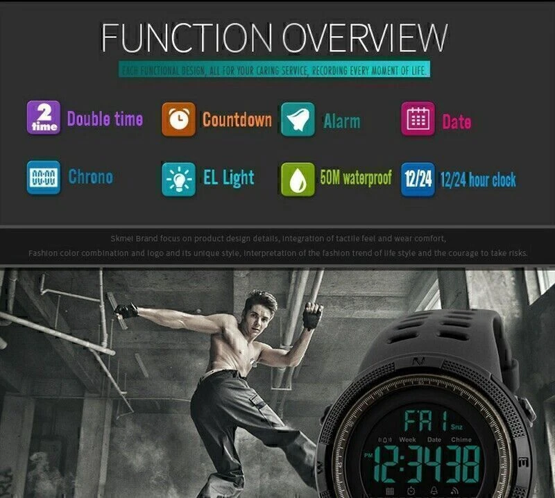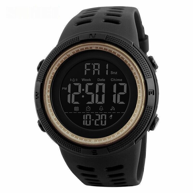 Product Description If you have any questions, please contact customer service first, do not open disputes easily, thank you! Feature: Model: 1251 Movement: Electronic movement with Japanese battery Dial diameter: 49mm Case Thickness: 15mm Strap width: 22mm Wristband Length: 25mm Waterproof depth: 5ATM Material: PC case, PU strap, thickened and hardened resin mirror, stainless steel bottom cover, stainless steel buckle Color: all black, black shell brown circle, black shell blue circle, black shell red circle, brown shell gold circle, gold shell red circle Weight: 60g Functions: Chronograph, Backlight, LED Display, Shock Resistant, Date, Full Calendar, Multiple Time Zones, Alarm The package includes: 1* Men's Sports Watch 1*Instruction Manual About Us We accept all payments authorized by eBay. powered by