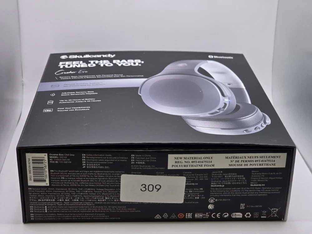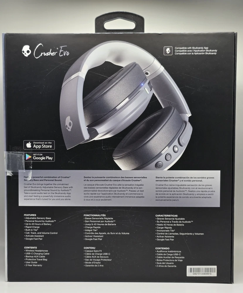 Connectivity:AUX Cable, USB-CBrand:SkullcandyMicrophone Type:Built-InModel:Skullcandy Crusher EvoWireless Technology:BluetoothType:Ear-Cup (Over the Ear)gtin13:0810015587256Seller Notes:“Costumer return, powers on but not tested, box may have labels.”Form Factor:HeadbandColor:GrayMPN:S6EVW-N744Number of Earpieces:DoubleFeatures:Rechargeable Battery, FoldableUPC:0810015587256
