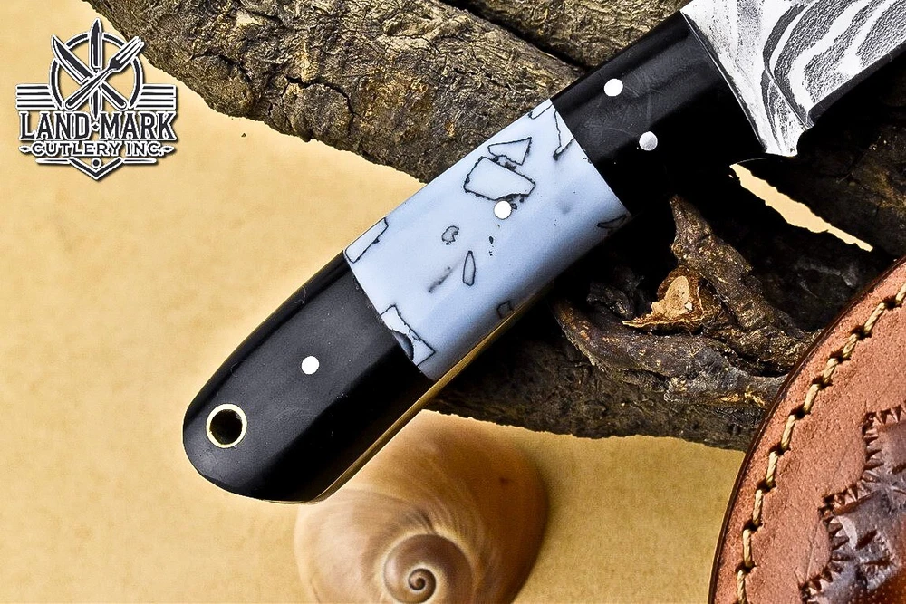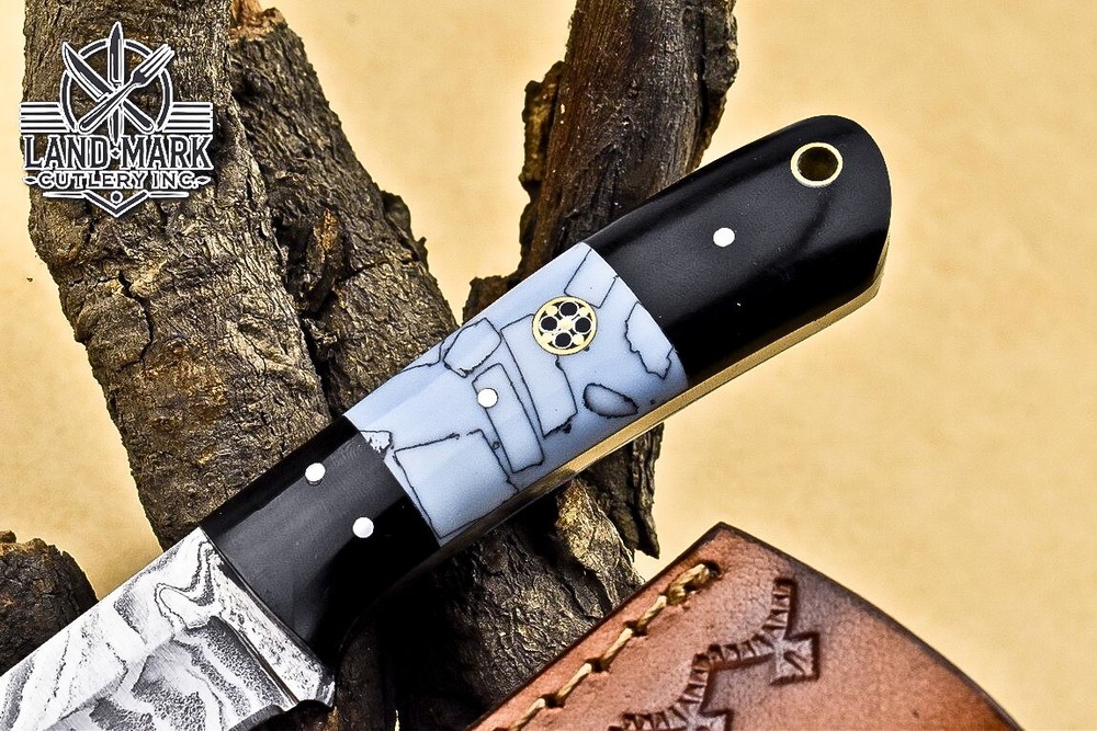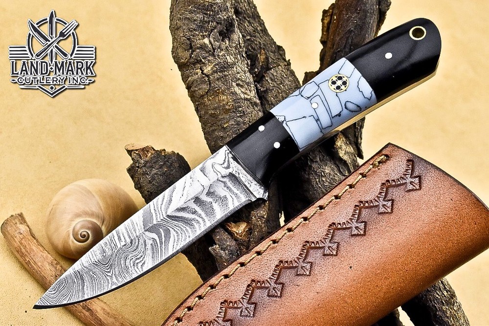 Custom Hand Made DAMASCUS STEEL HUNTING KNIFE WITH RESIN HANDLE We offer a shipping discount for More then one purchased . And discount will be apply on combine invoice, Discount will not apply on separate payment. ITEM DETAILS OVER ALL LENGTH 8.0 inches long (Approx) HANDLE LENGTH 4.0 inches long (Approx) BLADE LENGTH 4.0 inches long (Approx) BLADE HARDNESS 58-60 HRC Which Holds The Sharp Edge For Long Time. HANDLE RESIN COVER LEATHER SHEATH This Awesome custom made KNIFE has a nice hand forged with the combination of 4340 & 1080 steel. HOW OUR DAMASCUS IS MADE: All our Damascus is real and not just an acid etch. Damascus is a mixture of 1080HC and 4340 nickel carbon. You heat them up together and then fold the bar over and over to get the desired layers, ours are 396 layers. Then you burn the blade in acid, and it turns the nickel satin color and the high carbon turns blackish gray. This is how the layers are exposed to show the layers of the new steel created coined "Damascus". All Damascus is acid etched to show the layers. If you high polish the metal it will be shinny satin like all steels. Only after you burn the sides of the blade with acid do you see the layers of the two steels. Makes sense? After we make our knives we high polish the handles and put an edge on the blade. The high polishing buffs off the acid burned layer of the handle, and the blade edge is sharpened and the acid burned edge becomes satin. You can re-burn the tang of the blade near the handles and the edge of the blade and it will show the layers once more. All our knives are hand made, durable and unique ***** YOU WILL RECEIVED THE SAME KNIFE Qality Standards Our Damascus blades are made from high quality non-stainless steels which rival or exceed any Damascus blade made from the 10 series with 4340. Our Damascus combination has taken years to perfect and has been tested under a variety of application which will offer professional performance in categories of toughness, strength (lateral stress) and edge honing and holding ability. In a 5 spot Rockwell test our blades will average near or close to 58 which offers a perfect balances between its toughness and strength.Our blades due to carbon content need to be regularly treated with wax and/or 3 in 1 oil to maintain its superior quality. Questions if you have any question feel free to send us message we aim to answer all questions within 24 hours Feedback If you are not satisfied with our service please contact us before leaving any negative or natural feedback. We will resolve all issues as quickly as possible. Disclaimer We are not responsible for any injuries associated with the use of our tools. Our products are intended for legal use only by responsible buyers. Therefore, we will not sell our products to anyone under the age of 18. Before bidding please check your country laws as some countries Custom don't allow this. If your purchase is held by Custom Authorities in your country/State we will not be responsible for that and no refund will be issued Shipping We offer a 20% shipping discount for More then one purchased . And discount will be apply on combine invoice, Discount will not apply on separate payment We ship within 24 hours after receiving complete payment but this can be delayed due to week ends or Governments and Religious Festivals . . This is beyond our control and we apologize for this inconvenience. Precautions Our Tools are very sharp so open and use them very carefully We are not responsible for any injuries associated with the use of our tools Tips to Care knife 1. NEVER STORE YOUR KNIFE FOR LONG TIME IN LEATHER SHEATH. 2. LEATHER CAN ABSORB WATER, WHICH WILL RUST THE KNIFE. 3. ALWAYS CLEAN THE BLADE AFTER USING WITH OIL OR WAX