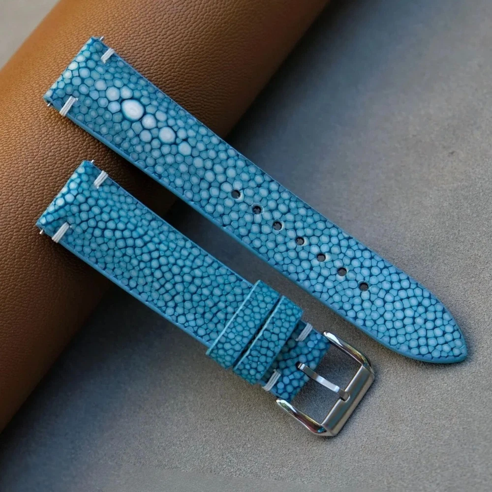 DESCRIPTION Condition: New 100% Color : Sky Blue with White Stitching Surface material: Stingray skin Species : Potamotrygon scobina Inside material: Genuine Epsom leather Size: Lug/Buckle width: 24mm/22mm, 22mm/20mm, 21mm/18mm, 20mm/18mm, 19mm/16mm, 18mm/16mm, 16mm/14mm (For another size please contact us) ex: 21/19mm or 20/20mm.... Long strap length: 125mm - Short strap length: 75mm