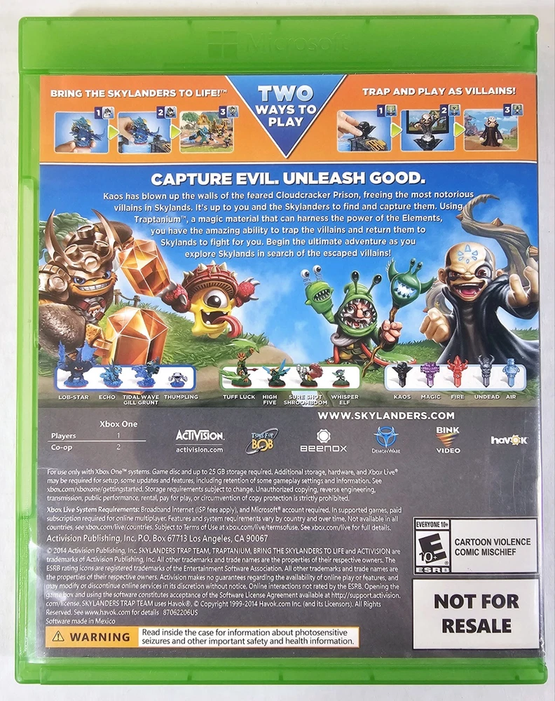 Embark on an epic adventure with the Skylanders Trap Team game for Microsoft Xbox One. This action-packed title delivers an immersive experience as players battle their way through foes and solve puzzles in a quest to save Skylands. The game comes in its original case, ensuring that fans of the franchise can enjoy the familiar packaging they know and love. With a rating of E10+ and featuring multiplayer options, this game promises hours of family-friendly entertainment. The Region Code is NTSC-U/C, indicating compatibility with systems in the US and Canada. Published by Microsoft and manufactured in Mexico, this unit is ready to bring the excitement of the Skylanders universe right to your living room.