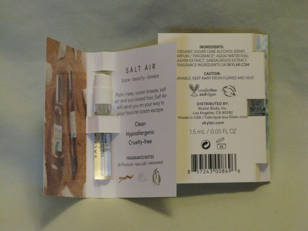 Welcome to my Auction! Up for bidding is a set of 2 new .05oz spray vials of the beautiful fresh fragrance 'Salt Air' by Skylar. Perfect for your travel bag or purse - super fresh and authentic. Key Notes: Driftwood, Sea Salt, Seaweed Fragrance Description: Salt Air is the fragrance of a perfect seascape with notes of sea salt to give you a fresh-out-the-water feeling. Grounding driftwood and green seaweed mingle with light floral notes of water lily for a perfume that smells of endless summers and breezy, beachy days. Please ask all questions before bidding - serious buyers only. I will report non-paid items to ebay. Please be considerate and make sure you can complete your sale. Returns are accepted only in cases of items not being as described or wrong item sent. I cannot accept returns of used cosmetics. I am an individual seller - not a department store. Processing returns is time-consuming and costly. Ebay takes a percentage of every sale, so I cannot refund shipping costs. Be sure you like the color, check the size, ask questions etc. to ensure you will be pleased with your purchase. Thank you for visiting and good luck!