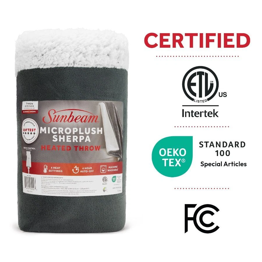 Sunbeam Slate Microplush Sherpa/Faux Shearling Heated Throw wraps you in luxurious warmth, perfect for those chilly cold nights. Imagine sinking into the rich and ultra-cozy microplush with reverse Sherpa/Faux Shearling fabric, keeping you toasty and comfortable while you relax. The stylish 50" x 60" electric blanket makes a great accessory while relaxing on the couch, bed or your favourite chair and the slate color adds a stylish to any décor. This throw features an easy-to-use push-button controller with 4 adjustable heat settings, so you can find your perfect temperature. The 4-hour auto shut-off function ensures added peace of mind. Premium heated wires are equipped with advanced technology to ensure continuous even heat distribution. When it’s time to clean, simply detach the controller from the throw and place in the washing machine and dryer for easy care. It stays silky soft wash after wash. Sunbeam is an American brand trusted for over 125 years in electric home appliances. All Sunbeam electric bedding products are ETL certified. On Dec 26, 2024 at 18:49:37 PST, seller added the following information: