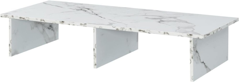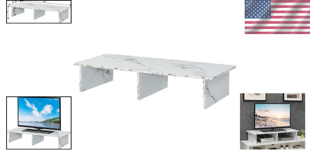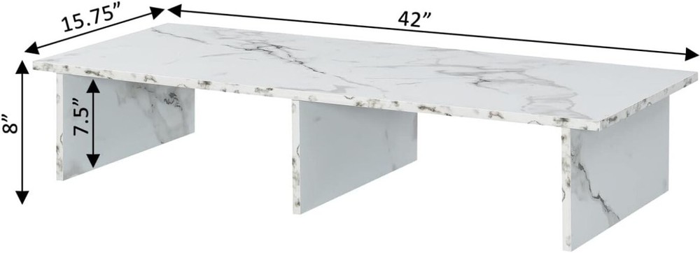 Item Weight: 15 Pounds Door Style: Flat Panel Global Trade Identification Number: 00095285434114 Frame Material Type: Wood Maximum Screen Size Fitment: 46 in UPC: Does Not Apply Is Electric: No Product Dimensions: 42"d X 15.75"w X 8"h Material Type: Melamine Veneer Additional Features: Portable Maximum Weight Fitment: 15 lb Type: Stand Base Item Dimensions D X W X H: 42"d X 15.75"w X 8"h Special Feature: Portable Included Components: Designs2go Large Tv/monitor Riser Recommended Uses For Product: Unspecified Number Of Levels: 1 Top Material Type: Wood Base Type: Legs Mounting Type: Floor Mount Number Of Shelves: 2 Installation Type: Freestanding Number Of Compartments: 2 Unit Count: 1.0 Count Number Of Pieces: 1 Required Assembly: Yes Finish Types: Wood Back Material Type: Unspecified Color: White Faux Marble Size: Unspecified Item Height: 8 Inches Brand: Unbranded Room Type: Living Room Is Customizable?: No Style Name: Unspecified Ground To Item Distance: 8 Inches Features: spacious shelving gtin13: Does Not Apply Shape: Rectangular