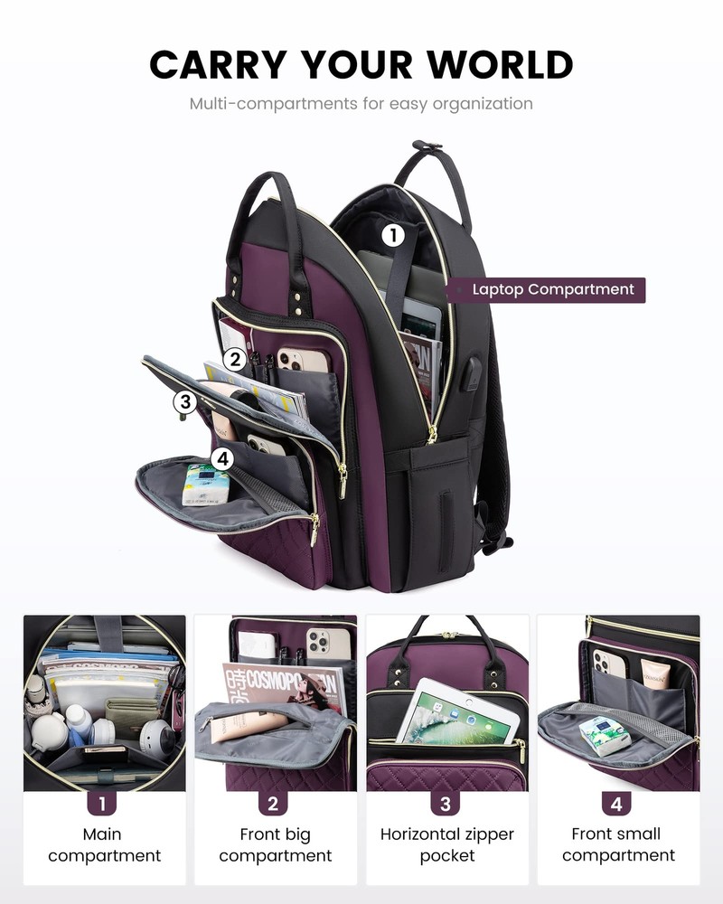 1. This stylish and functional backpack is a game-changerโ€”perfect for work or travel! The durable, water-resistant material keeps my laptop safe, while the built-in USB port is super convenient for on-the-go charging. Itโ€™s surprisingly lightweight yet roomy enough for all my essentials, and the sleek design looks professional without sacrificing comfort. The quality craftsmanship is clear, and the customer service is excellent. Highly recommend for any woman needing a reliable, chic bag!