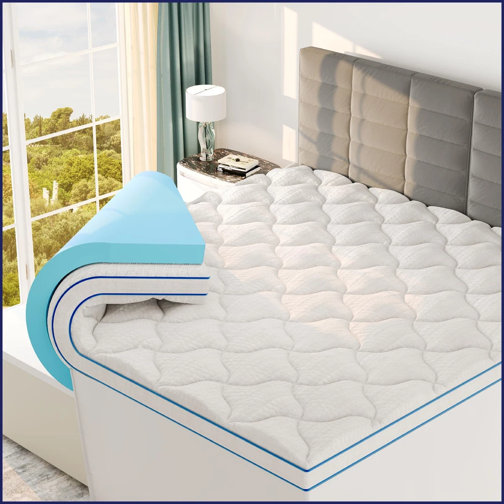 Luxurious Comfort and Quality – Experience ultimate comfort with our dual-layer 4-inch topper, featuring a 2-inch gel memory foam and a 2-inch quilted pillow top. This cooling bed topper provides luxurious softness and support. Designed with premium microfiber and high-quality materials, the cooling mattress topper king ensures durability. Enjoy the plush feel of our king size pillow top mattress topper, whether you need a hospital bed mattress topper for added comfort or extra cushioning. Enhanced Sleep Quality – Transform your sleep with our king mattress topper 4 inch. Featuring slow rebound gel memory foam and an ergonomic design, it offers optimal support and comfort. Ideal as a 2 inch mattress topper, it ensures you wake up refreshed and rejuvenated. This mattress topper king for back pain is perfect for both sofa beds and regular beds, providing a cozy and supportive surface. Enhance your sleep with a matress pads that adapts to your body’s contours. Cool and Highly Breathable with Super Cooling Effect – Stay cool and comfortable all night with our bed cooling system king and its breathable design. The soft surface and stress-relief features of best mattress topper for back pain help maintain a comfortable sleep, reducing tossing and turning. The special cool-to-the-touch feel of puffy mattress topper provides immediate comfort upon contact, enhancing your sleep with instant coolness and cooling comfort. Convenient and Eco-Friendly – Enjoy the convenience of easy care with our eco-friendly mattress topper king. The machine washable pillow top makes maintenance a breeze. This pillow top mattress topper king features high-quality materials for durability. The rv king mattress topper ensures a comfortable sleep experience. Use the king mattress topper memory foam for added protection and comfort. Our foam mattress topper king offer versatility and ease of use. Optimal Fit and Long-Term Warranty – Our deep pocket design ensures the topper holds the mattress perfectly, providing adjustable comfort and a secure fit. The skin-friendly fiber-fill pillow top adds softness. This extra thick mattress topper offers unmatched support. Ideal for a travel mattress topper bed, it’s one of the best king bed mattress topper. The thick mattress topper king enhances comfort, making it a great 2 inch foam mattress topper, backed by a 10-year warranty.