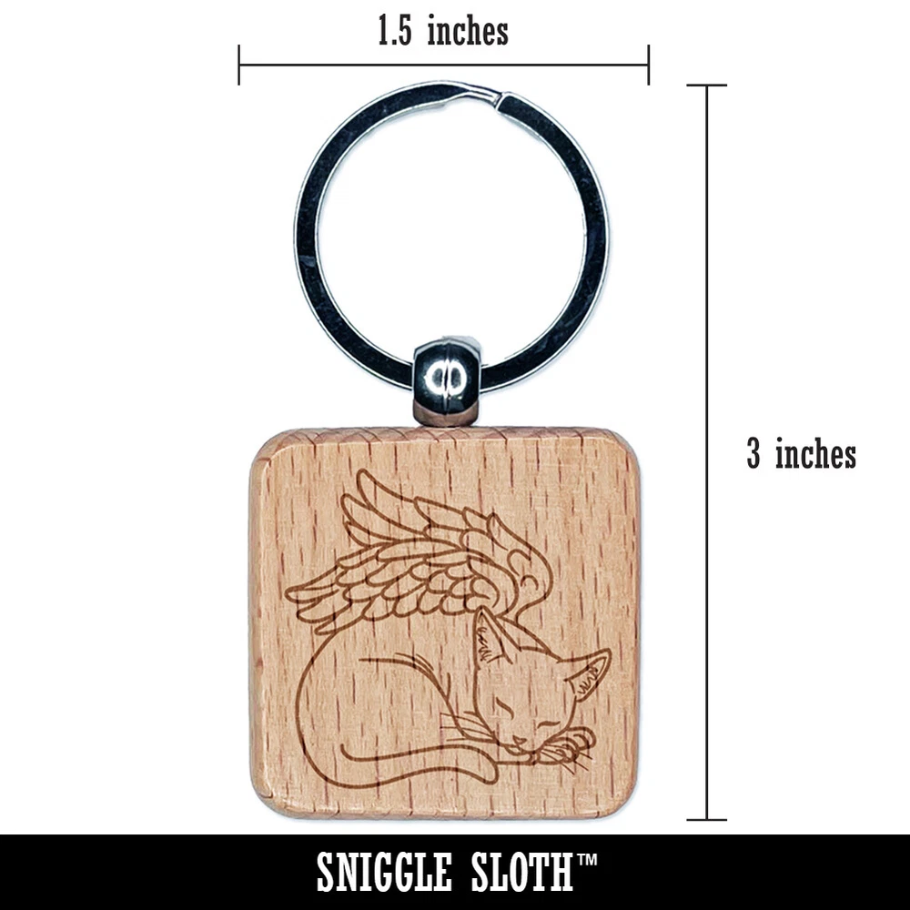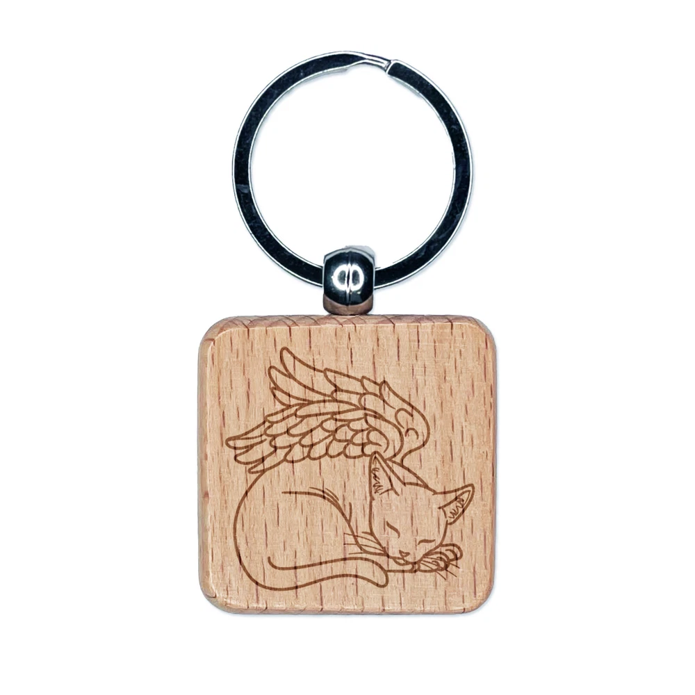 Sleeping Angel Cat Loss of Pet Engraved Wood Square Keychain Tag Charm