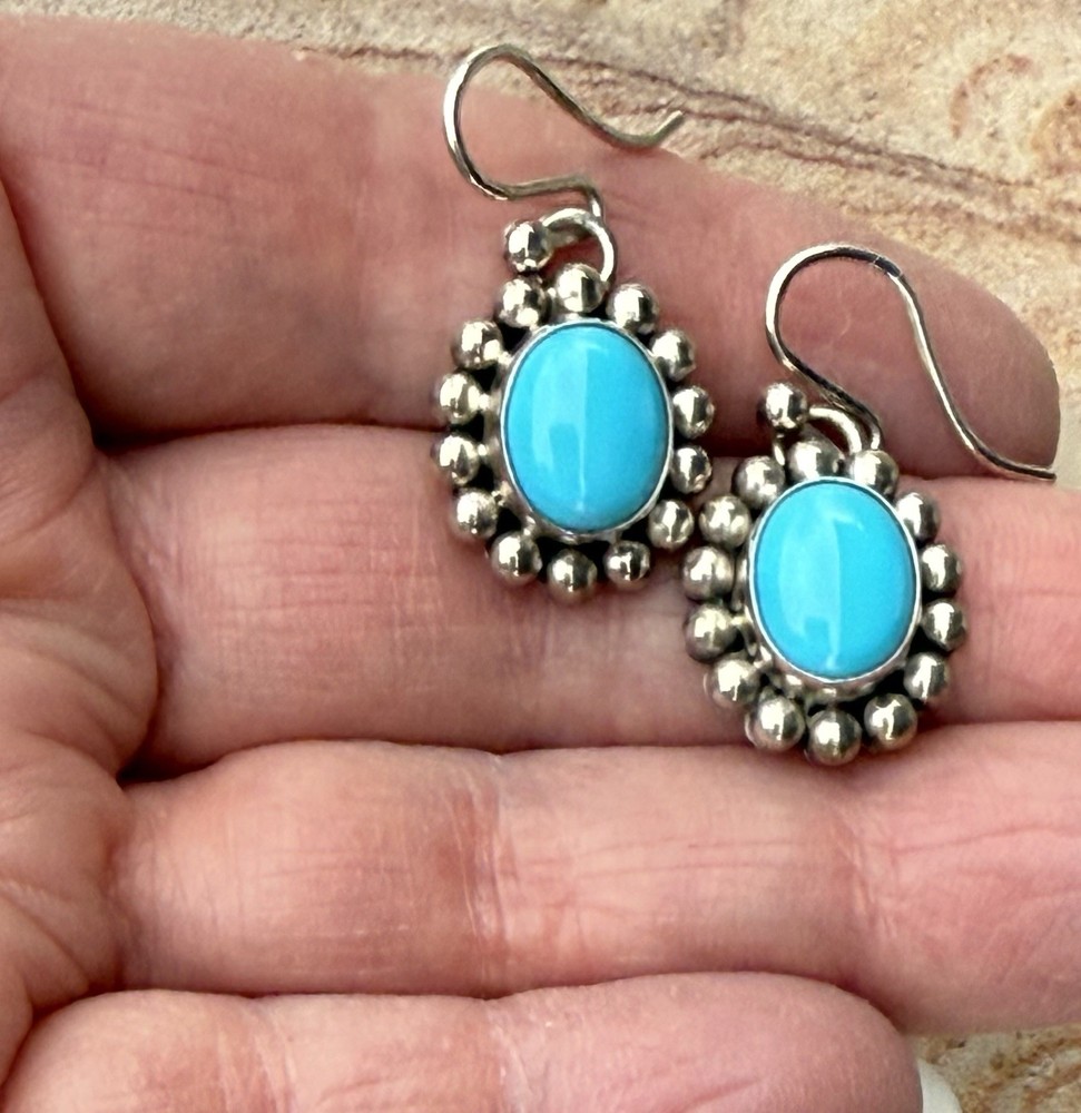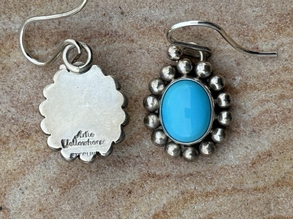 Like new out of the case. Rare wear. Approximately 5/8” long setting plus the hook drop. Stone approximately 8mm by 5mm. See the photos for the inch and the centimeter (millimeters) tape measures. These are also your description to details. Sleeping Beauty turquoise from the AZ Mine is increasingly scarce and collectible. The hooks are 0.925 sterling silver also and the earrings are stamped. Setting composed of individually hand made beads which is unique to Artie Yellowhorse and her signature “rising sun” design.