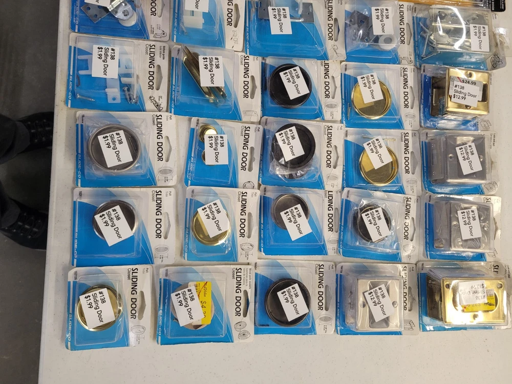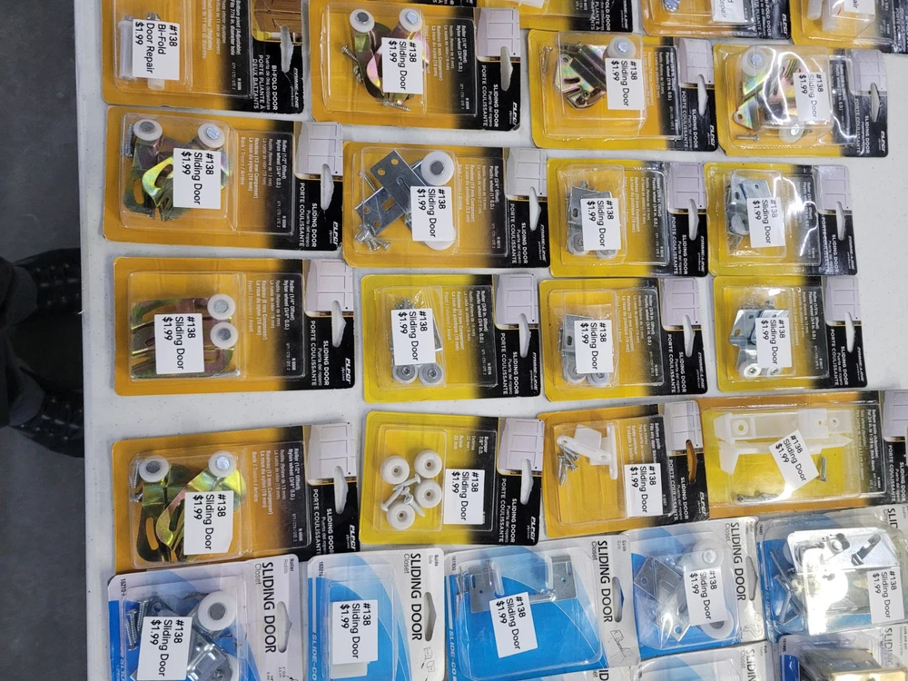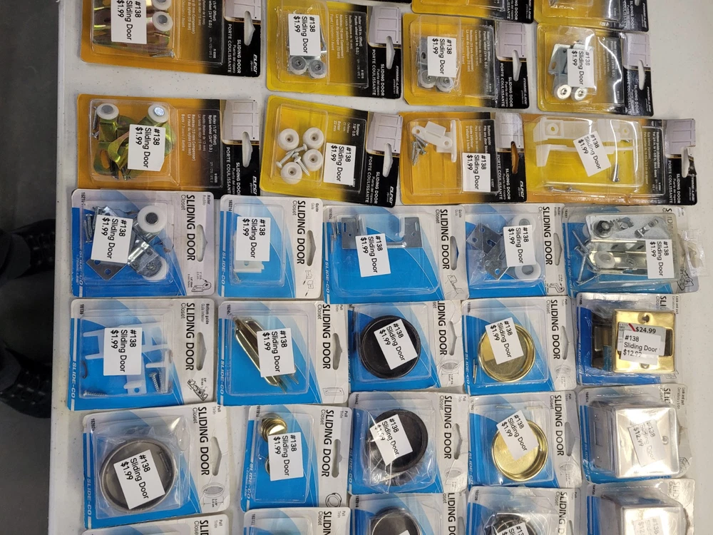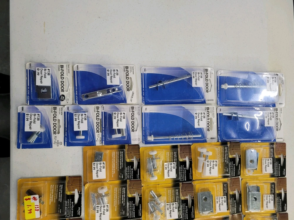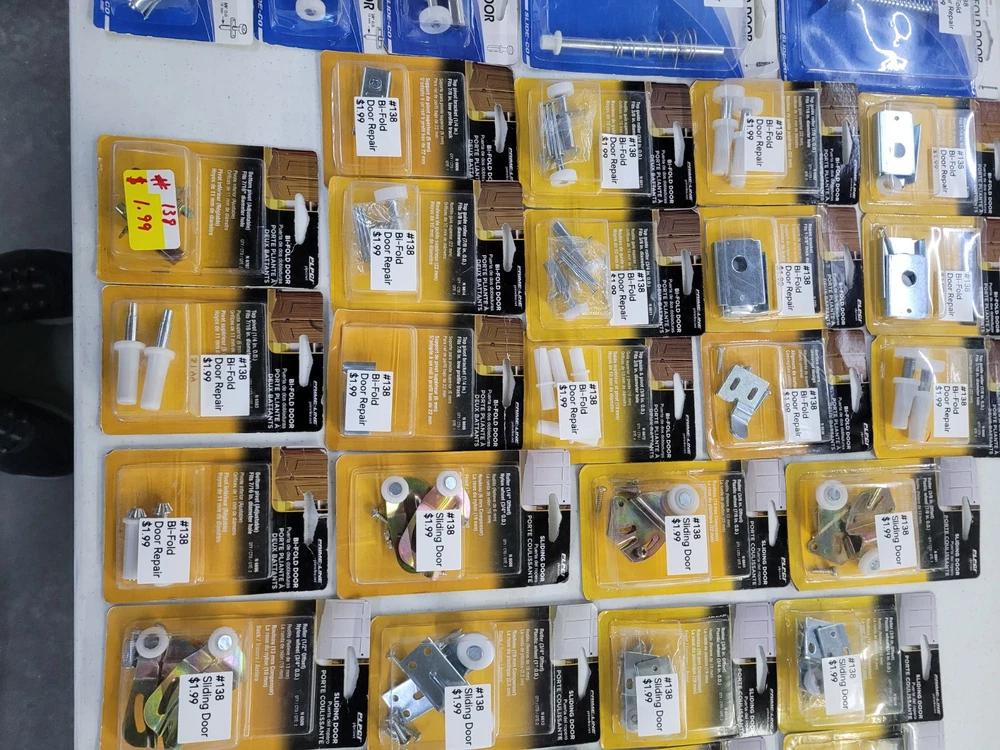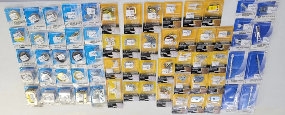 This product is a lot of 64 packages of sliding door and bi-fold door repair items from Prime Line Products and Slide-Co.