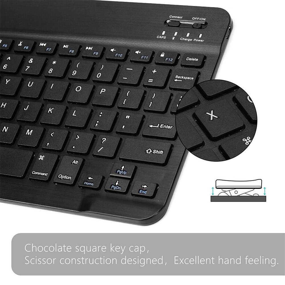 Product Description Features: --Bluetooth technology provides a cable-free & clutter-free connection. -- Compatible with the iPad and all Bluetooth-enabled tablets, laptops, and computers. --Ultra Slim, sleek profile (0.23in thin) easily stows in a backpack, messenger bag, or case. -- Standard keyboard without any wrong code and keys. --A high quality wireless bluetooth keyboard designed for smart phones and tablet PC. --Floating chocolate keyboard structure promises a silenced operation of the keyboard. --Built-in 200mAh Rechargeable Battery. --The keyboard adopts stable Bluetooth 3.0 technology, the working distance is up to 10m Specification: Material: ABS Plastic size :24.6X14.8X0.6cm(9.68x5.82x0.23in) Standard Bluetooth 3.0 Effective distance 10 meters Standby time: 100 days Continuous working time: 70 hours Charging time: 4-5 hours Lithium battery capacity: 200mAh Lithium battery life: 3 years Button life: 5 million times Working temperature; minus 10 degrees to 55 degrees Compatible with Apple iPad Air, iPad mini with Retina Display, iPad 2, iPad 3, iPad 4, iPad mini; iPhone 4 & 4S, iPhone 5; iPod Touch. Bluetooth-enabled PCs or Laptops with Windows XP/Vista/7/8. Bluetooth-enabled iMac / Macbooks with Mac OS X 10.2.8 or above. Smartphones or tablets with Android 3.0 and above. Windows Mobile 5.0 and above. Not compatible Mac mini. Package Include: 1* Wireless Keyboard 1* USB Charging Cable 1* Instruction Manual