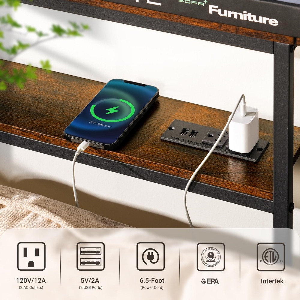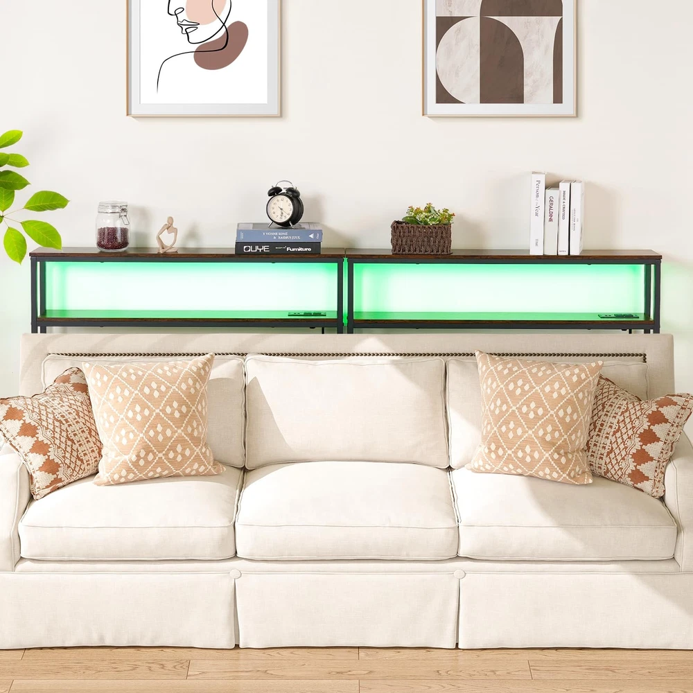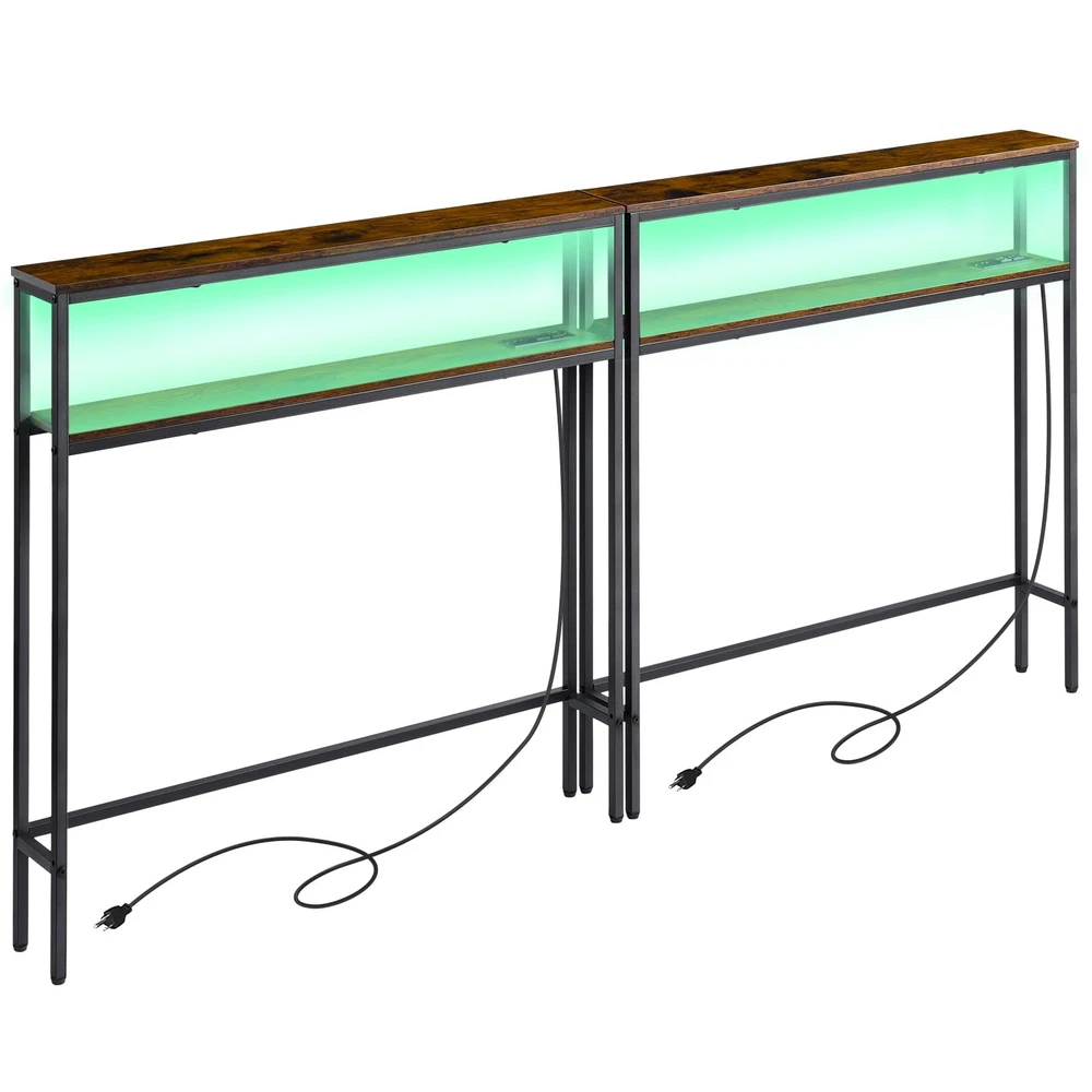 Sometimes the sofa will block the socket on the original wall, resulting in a waste of resources. This hallway table is designed to serve both commercial/home decoration and functionality purposes. With the size of 39.4"L x 5.9"W x 39.4"H, works greatly as a console table, plant stand end table, lamp table or entry table. Appropriate size makes this console table perfect for living room, dining room, study, balcony, office, hallways and so on. Sightly simple design and low-key industrial style can perfectly match any decoration style. Smart Solution for Utilizing Space Behind Sofa: Measuring 5.9" Dx39.4”Wx39.4”H, this sleek design effortlessly fits into narrow gaps between your sofa and the wall, leaving ample room for wall vents, moreover, its integrated 2-tier shelf provides convenient storage space for showcasing your cherished items in the living room Sofa Table with Built-in Outlets: Equipped with 2 standard 120VAC outlets and 2 USB ports on each side, along with a 6.5’ long power cord, this console table is designed to rescue you from the inconvenience of an inaccessible outlet behind your sofa, and then you can effortlessly power up your phone, tablet, headphones, and more—all within arm's reach, allowing you to fully indulge in your leisure time on the sofa Customizable LED Illumination: Elevate your ambiance with our adjustable LED light strip. Simply connect it to the USB port, and immerse yourself in a spectrum of 15 dimmable color options and 4 dynamic modes, all controlled via remote, tailor the lighting to suit your mood or occasion, transforming your living room into a captivating and dynamic space that reflects your style Timeless Fusion of Styles: Blending retro charm with modern flair, our design effortlessly marries rustic brown boards with sturdy metal tubes, a timeless aesthetic that exudes sophistication and warmth; complemented by vibrant LED lighting, this fusion of styles creates an inviting and versatile environment that perfectly reflects your unique taste and personality Quick and Hassle-Free Installation: Assembling the narrow sofa table is a breeze, requiring no additional tools, the provided screws and tools guide you through the installation process, delivering a sturdy and reliable table in just a few minutes