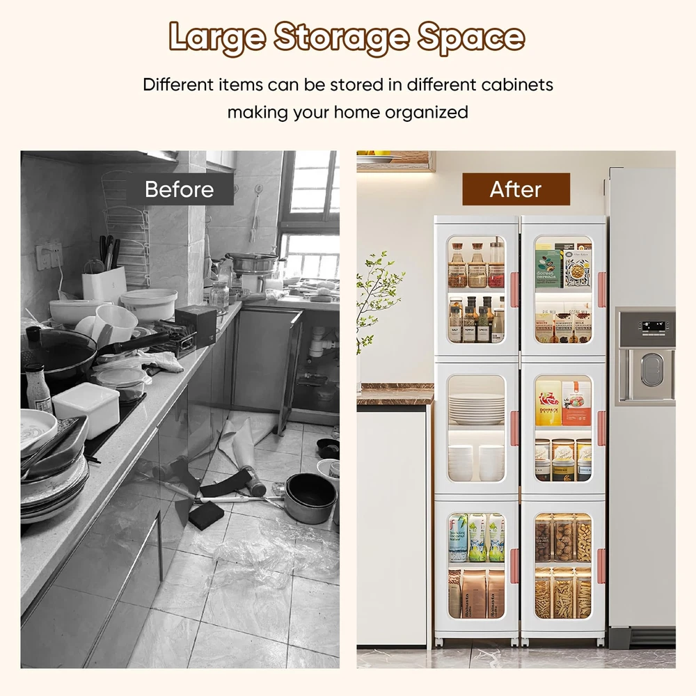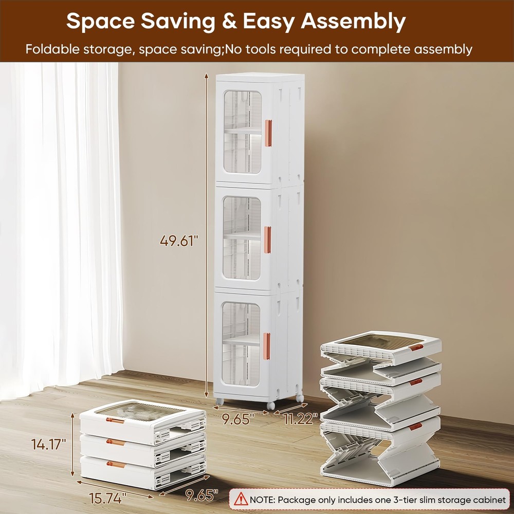 slim kitchen pantry storage cabinet with doors and shelves is designed for storing a various of items in the bathroom, kitchen, pantry, living room, bedroom, laundry room, and other space. Features adjustable shelves with 3 different heights to meet your storage needs. This kitchen pantry storage cabinet is made of ABS & PP materials; Fasten buckle on both sides, keep the cabinet structure more stable and reliable; Strong load-bearing capacity, no tilting or deformation. Magnetic enclosed doors provides good sealing performance, waterproof; Easy to open; Easy to clean; Large storage space to store daily necessities easily, help to keep your living space organized. The narrow bathroom storage with compact design which easily fit into corners or narrow spaces; Doesn't take up much floor space, space saving. Easy Asembly & Easy to Use: Easy to assemble with no installation tools required; Easy to move, protecting the floor from scratches Multi-purpose Stackable Storage Cabinet: Elegant in appearance, slim kitchen pantry storage cabinets with doors and shelves can be adapted to various style of house; Ideal for storing a various of items in the bathroom, kitchen, pantry, living room, bedroom and other space; Features 3 adjustable shelves with 3 heights options to meet your storage needs, keep your home neat and organized Sturdy & Safe: This narrow storage cabinet is made of ABS & PP materials; Fasten buckle on both sides that keep the pantry cabinet structure more stable; Strong load-bearing capacity, remains stable without tilting or deforming when fully loaded; The sleek curved edge design to reduce the risk of bumps and injuries for children or the elderly Waterproof & Easy to Clean: The kitchen storage cabinet with magnetic enclosed doors provides good sealing performance, waterproof; Smooth & flat surface that can be cleaned with just a wet rag for easy maintenance Large Capacity & Space Saving: With 2-tiers stacked dimensions of 11.2" x 9.65" x 33.86" (height included wheels); Provide large storage space to store daily necessities easily, keep your belongings organized and your living space tidy; The slim storage cabinet with compact design that fits nicely into corners or narrow spaces; This slim bathroom storage has a small cross-section and doesn't take up much floor space, space saving and improve space utilisation Easy Asembly & Easy to Use: Easy to assemble, no installation tools required to complete the freestanding cabinet assembly; Visual cabinet doors allow you to easily see where items are located, saving you time in reaching for them; The universal wheels allow you to move easily, protecting the floor from scratches