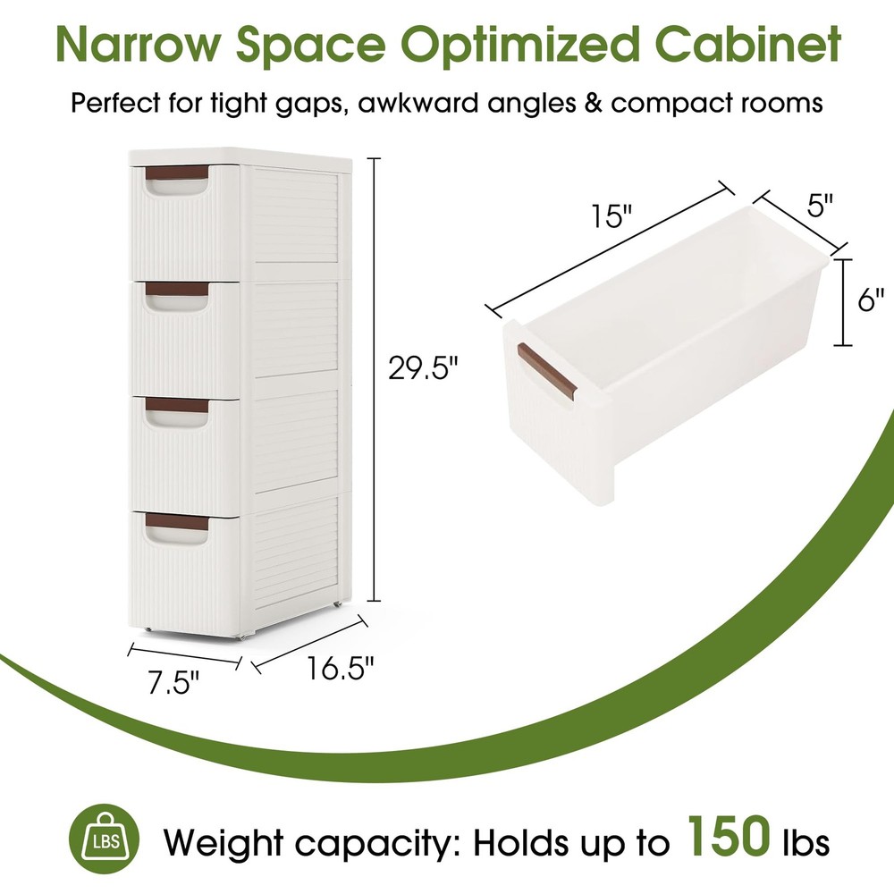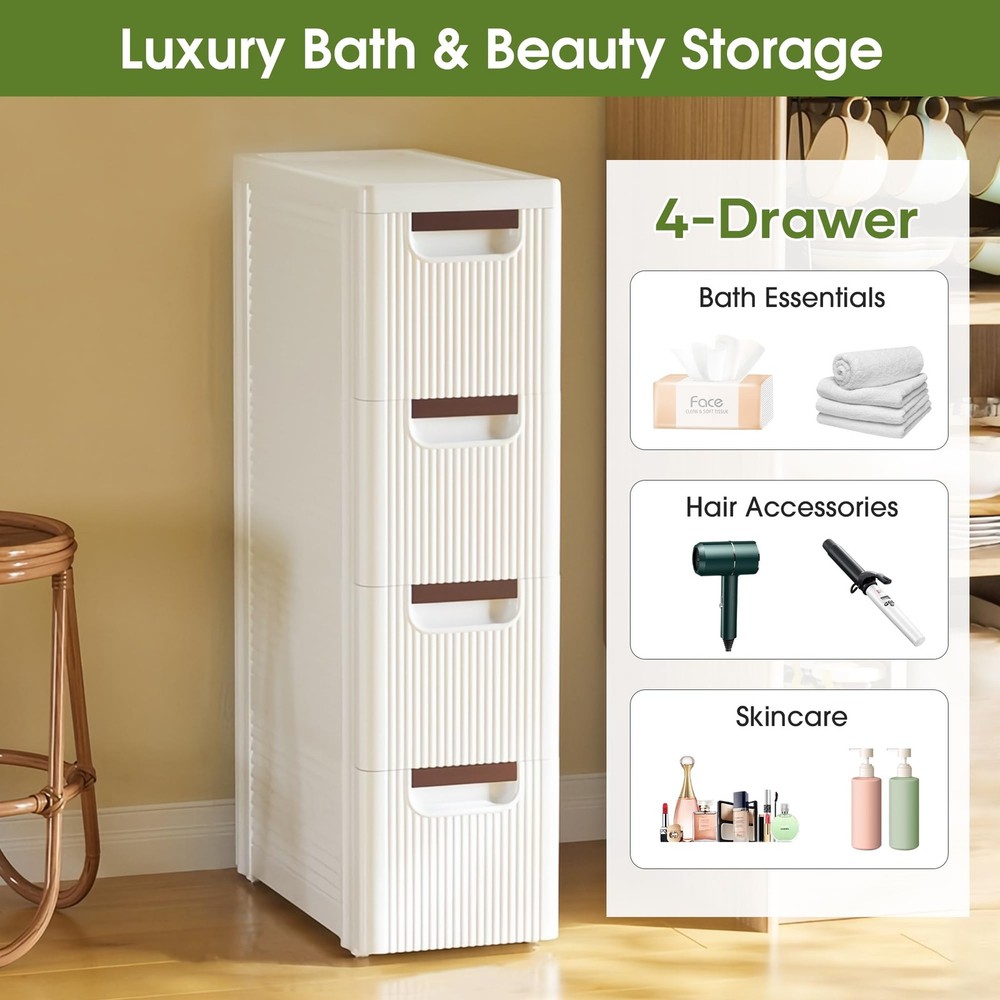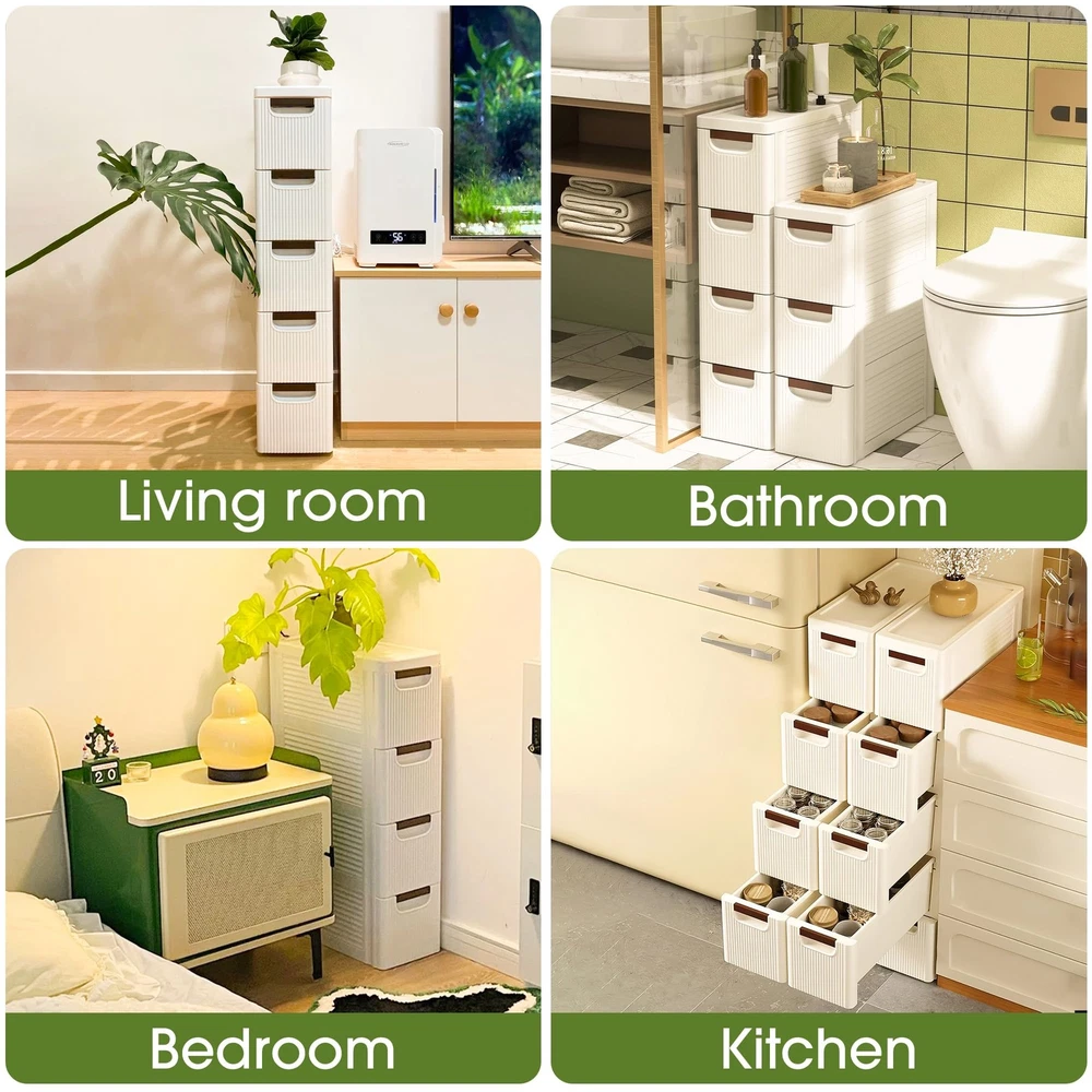 Narrow Storage Cabinet for Home [Compact & Space-Efficient] Designed to fit in corners and tight spaces, this storage cabinet optimizes your area with its dimensions of 16.5 inches long and 7.5 inches wide (42cm x 19cm), making it ideal for kitchens, bathrooms, and living rooms. [Versatile & Spacious] This slim storage cabinet features multiple drawers, offering ample storage for various items to keep your space organized. Its elegant design complements any room style, serving as a bathroom cabinet, kitchen storage, or living room side cabinet for essentials like towels, cosmetics, and toiletries. [Robust & Safe] Crafted from high-quality PP material, this narrow storage cabinet boasts exceptional sturdiness and load-bearing capacity, ensuring stability without tilting or deformation. The smooth, rounded edges enhance safety for children and the elderly. [Water-Resistant & Low Maintenance] Unlike wooden cabinets, this plastic narrow storage cabinet variant is perfect for humid environments. Its superior sealing protects against water and dust, while the smooth surface allows for easy cleaning with a damp cloth. [Simple Assembly & Mobility] The storage cabinet comes with a comprehensive English manual for effortless assembly—no tools required, and it can be set up in minutes. Silent wheels facilitate easy movement for cleaning while protecting your floors from scratches.