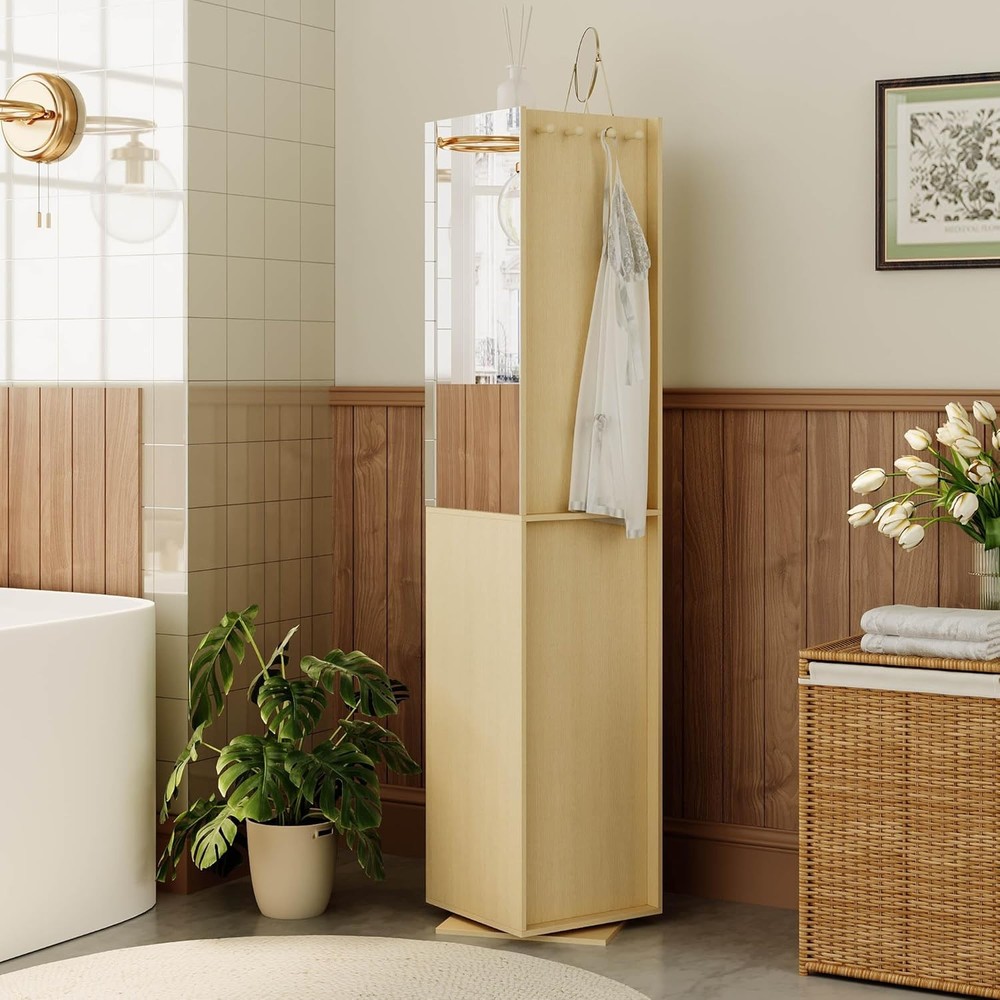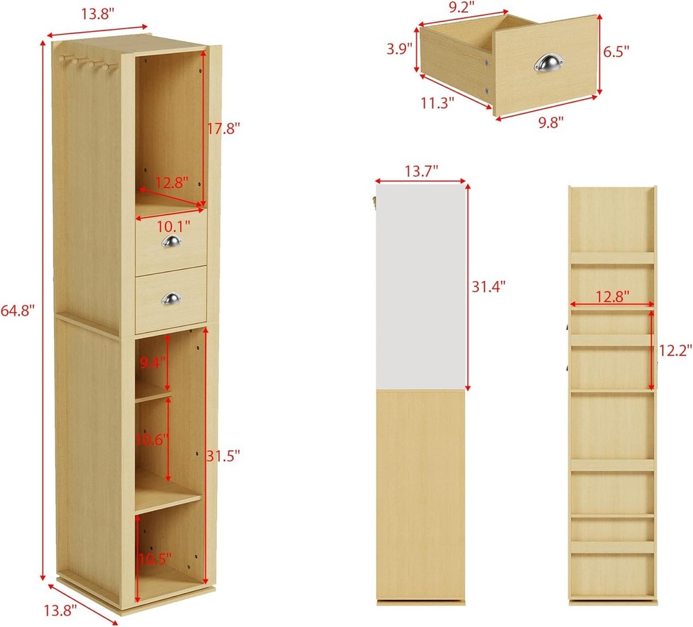Product Description About this item Multi-functional Cabinet: This light-wood-finished bathroom storage cabinet boasts a tall, narrow vertical design and a 360-degree swivel function. The natural tone radiates warmth and simplicity, and its vertically-stretched, tall form suits small spaces. It integrates mirror, clothing-hanging, magazine-organizing, and storage functions, being both practical and good-looking Ample Storage Space: This cabinet measures 13.8"L x 13.8"W x 64.8"H. 2 drawers (ideal for personal items such as cosmetics) provide closed storage; 4 open shelves for towels and toiletries; 4 hanging rods for hanging bath towels or clothes; 4 magazine organizers for magazines, photo albums. Keep your items reasonably placed Sturdy Construction: This thin cabinet is made of high-quality PB board, which is durable and sturdy. The drawers are equipped with metal handles, enhancing the texture. The wooden hanging rods can bear more weight, making it convenient to hang various items Versatile: This skinny cabinet has a compact design, making it suitable for use in bathrooms and entryways. Its multi-tiered open design offers ample storage space for towels and bathroom essentials. The mirror on the side of the cabinet allows for quick grooming before heading out Simple to Assemble: Each assembly part of the narrow bathroom storage cabinet is numbered accordingly, just follow the instructions step by step to get a storage cabinet with modern design Tall Bathroom Cabinet Modern, Robust, Practical This multi-functional organizer with simple and practical design is suitable for bathrooms and entryways, making your home life more tidy and organized. Metal Handles Magazine Organizers Hanging Rods Open Shelves Tall Bathroom Cabinet Color Natural Overall Dimensions 13.8"D x 13.8"W x 64.8"H Material PB Package Includes Tall Bathroom Cabine tX 1; Stool X 1; Instruction X 1 On Aug 15, 2025 at 01:10:30 PDT, seller added the following information: