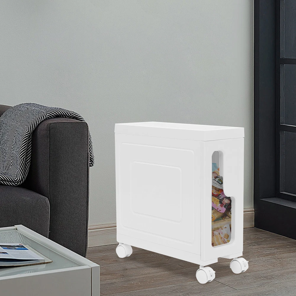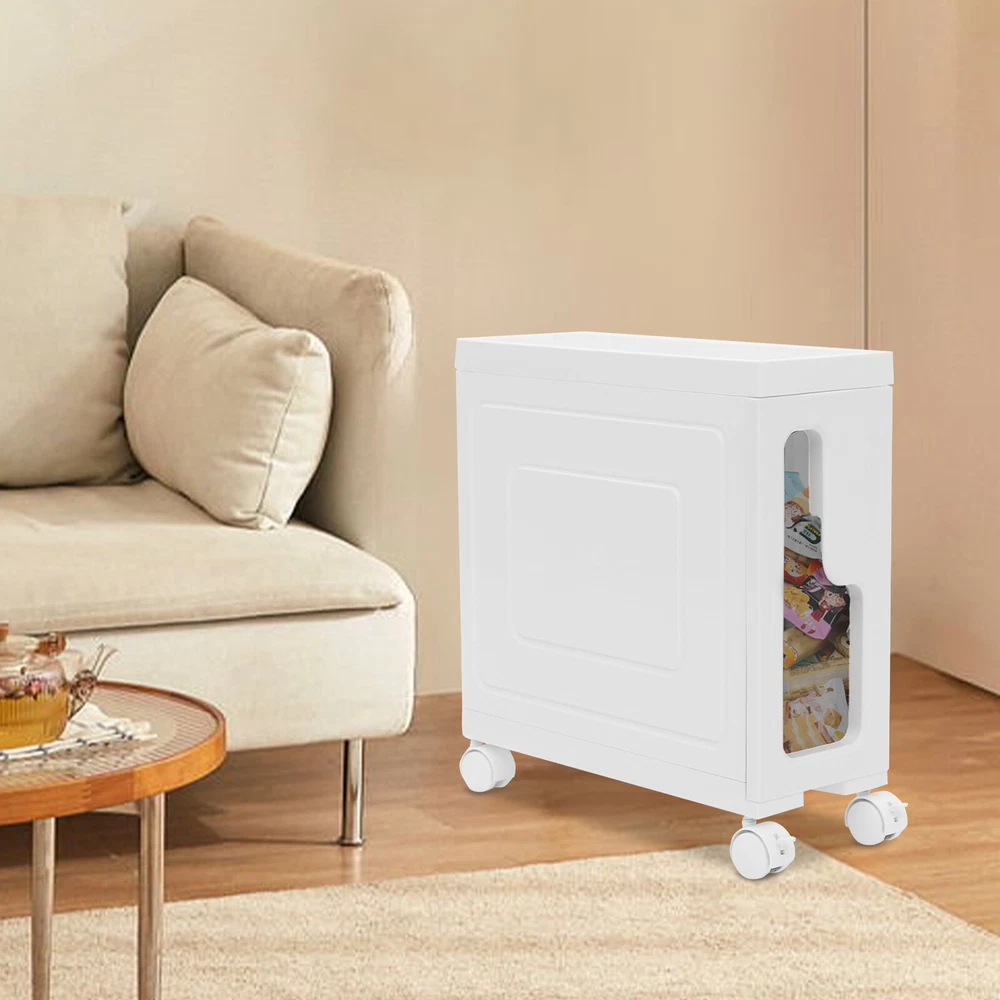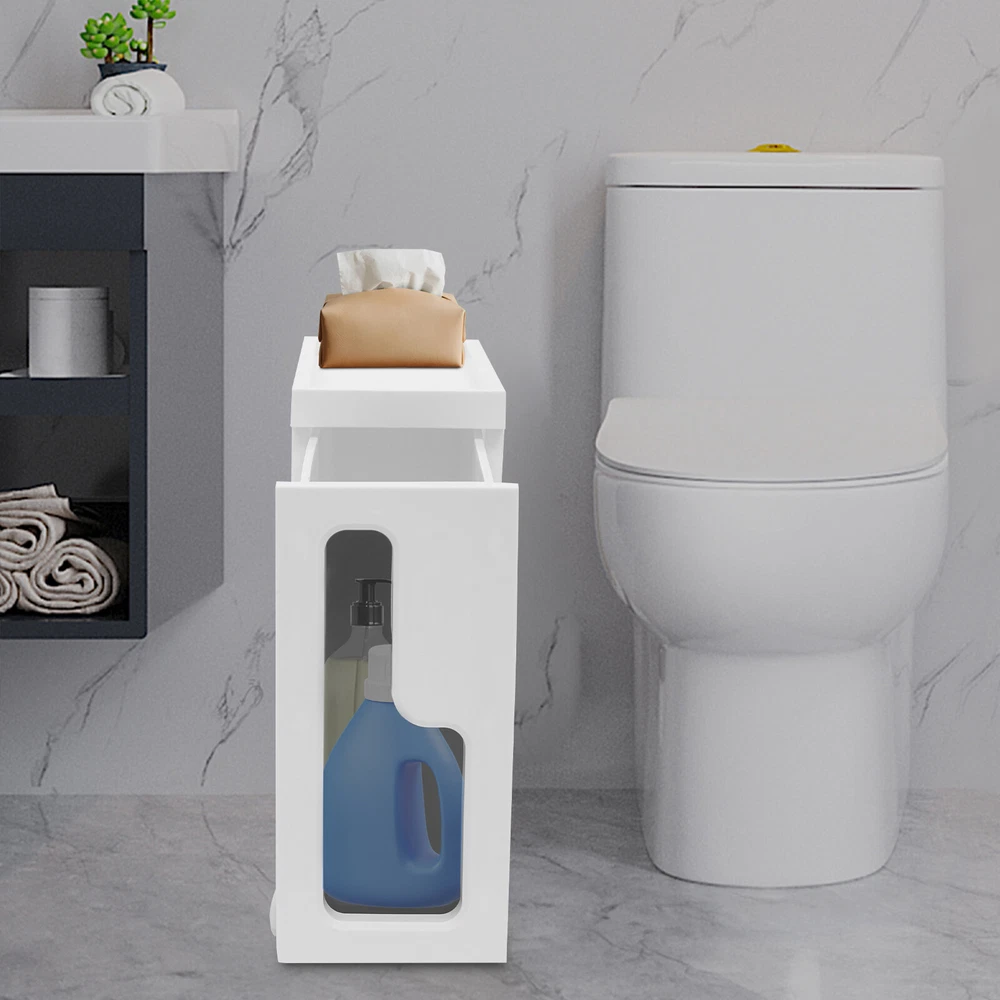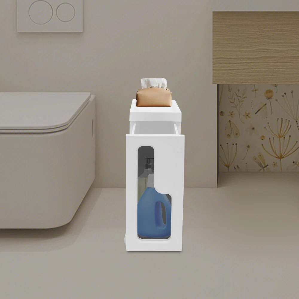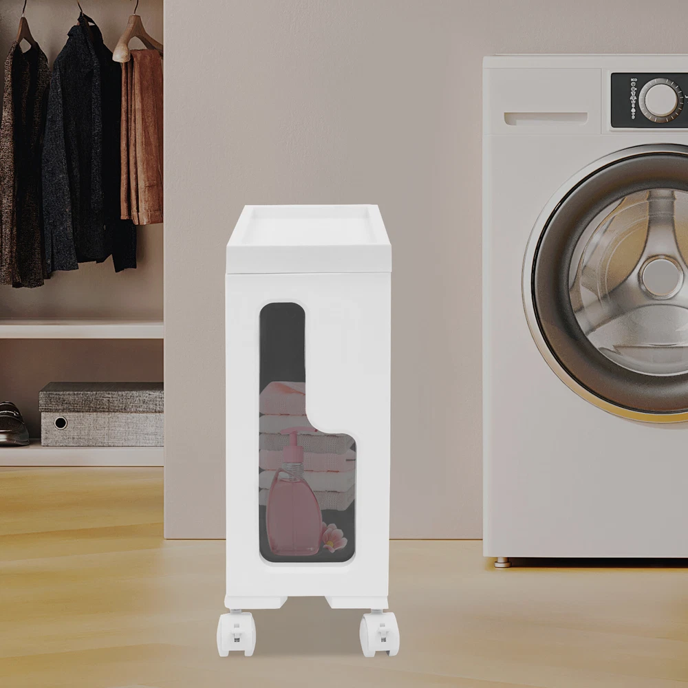 This slim storage cabinet is a game-changer for small spaces! The sturdy build holds all my bathroom essentials without taking up much room, and the smooth-rolling wheels make rearranging a breeze. It keeps everything tidy while adding a modern touch—perfect for anyone needing extra storage that looks great!
