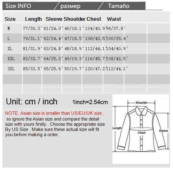 Product Description * Condition: 100% Brand New * Color:Navy、Gray、Camel * Size: Asian M-3XL * Package:1pic coat(without any accessories ) Asian S = US 2XS Asian M = US XS Asian L = US S Asian XL = US M Asian 2XL = US L Asian 3XL = US XL Asian 4XL = US 2XL Asian 5XL = US 3XL Asian 6XL = US 4XL Asian 7XL = US 5XL Please note: 1.Please allow a little error due to manual measurement. 2.The color maybe a little difference because of the light,screen reflection etc. 3.If you are not sure what size to choose, you can tell us your height and weight, we will recommend the right size for you. Shipping 1. Your Item(s) will be shipped within 5-15 business days once payment received. 2. Standard shipping to US/UK,you may can get it in 10-20 Business days. Standard Shipping for Airmail via Post Office 11-30 business Days Come(approximately within 30 days) ship to other country. 3.if you want faster shipping (Express,DHL or EMS),Please contact us. Contact Us We are doing eBay business in an HONEST manner. No cheating,only fair trading.Trust us ! and you will get more. About us 1. 30 days return ! Buy with confidence 2. If you find the item has quality problem after receiving the item, please contact us .We will refund YOUR FULL WINNING BID AMOUNT or item exchange.it's up to you. 3. If the item is lost in transit. Or damaged. Bear all the losses by the seller.We 100% guaranteed quality. If you have any questions, please feel free to contact us. We will do our best for you! Thank you for looking and enjoy your shopping! Feedback 1. We strive to maintain the highest standards of excellence for shopping experience and 100% customer satisfaction! Positive feedback is very important to us. We sincerely request that you contact us immediately BEFORE you give us neutral or negative feedback, so that we can satisfactorily solve your concerns. 2. Please buy only if you agree with the above terms.