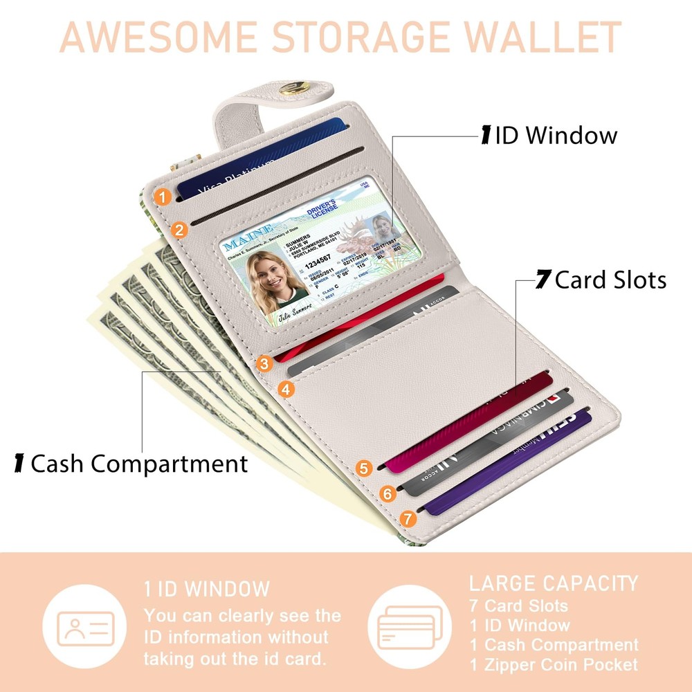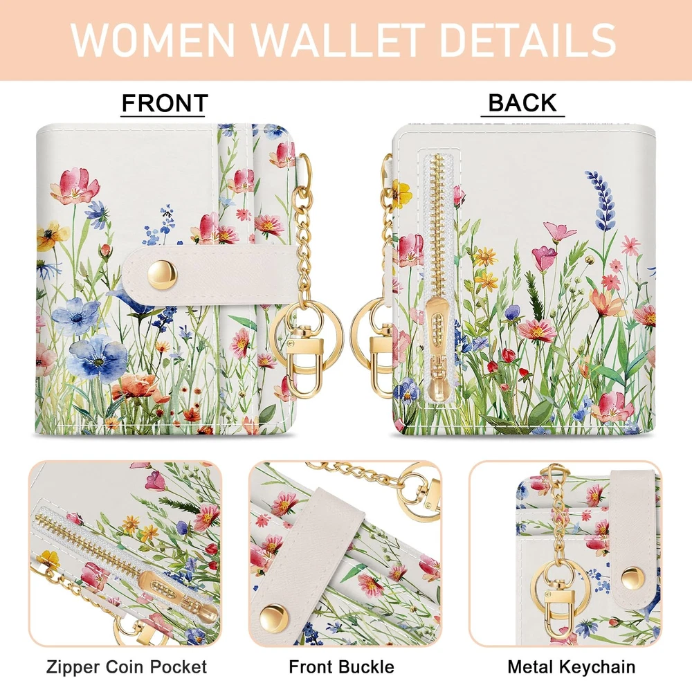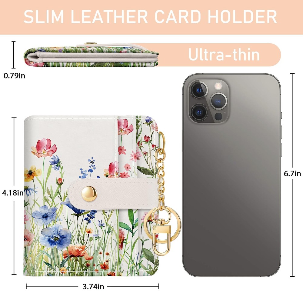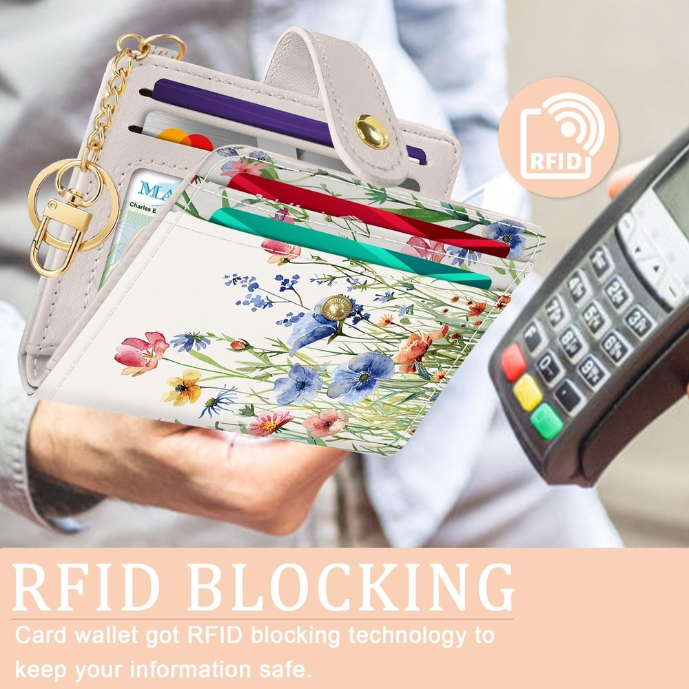 Floral Flowers Rfid Ladies Wallet, Small Slim Thin Compact Credit Card Women Wallet, PU Leather Bifold Cash Wallet, Zipper Coin Pocket & ID Window, Female Wallet Large Capacity: The slim women wallet offers 8 RFID blocking credit card slots, 1 clear ID window, 1 cash compartment, and 1 side zipper coin pocket; The exterior of the leather credit card holder also features two card slots for easy access to your frequently used cards; It's large enough to hold all your essentials and outdoor gear Unique Design: The small card wallet features flowers and plants pattern, showcasing your personality and adding a touch of fashion to any outfit; It comes with a front buckle and a zipper pocket, providing convenient and secure storage; Its compact design makes it easy to slip into front pockets, backpacks, and crossbody bags Multifunctional Wallet: This cash wallet is made of PU leather, offering a comfortable touch; The thin bifold wallet design with button buckle and zipper pocket keeps your cards, cash, coins and keys neatly organized and secure; Additionally, this coin purse comes with a metal keychain that allows you to manage your keys and even hang it in your bag to free up your hands RFID Blocking Technology: The RFID wallet for women is equipped with advanced RFID blocking technology; With a protective layer, this keychain wallet can effectively block RFID chip signals, preventing illegal scanning by RFID scanners and readers; Keep your important information safe from electronic theft and enjoy peace of mind wherever you go For Loved Ones: The super vibrant patterns on the ladies wallet with zipper will undoubtedly showcase your personality, making it a good choice for any occasion like Valentine's Day, Thanksgiving, Mother's Day, New Year, Christmas, birthdays, anniversaries, weddings, and more; Surprise your girlfriend, daughter, friend, lover, or family members with this awesome and unique wallet