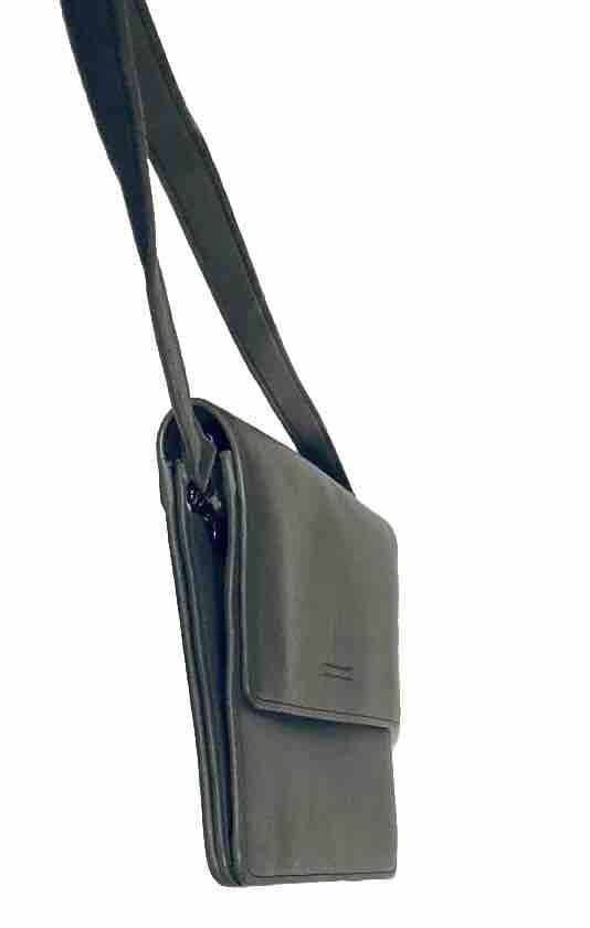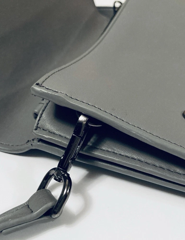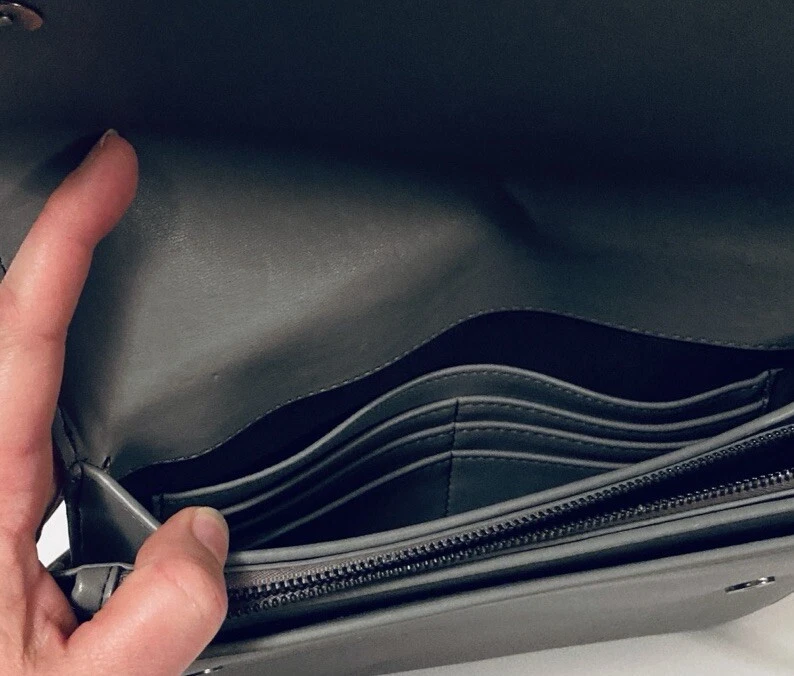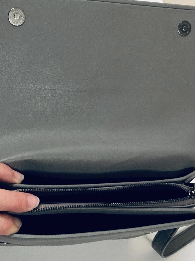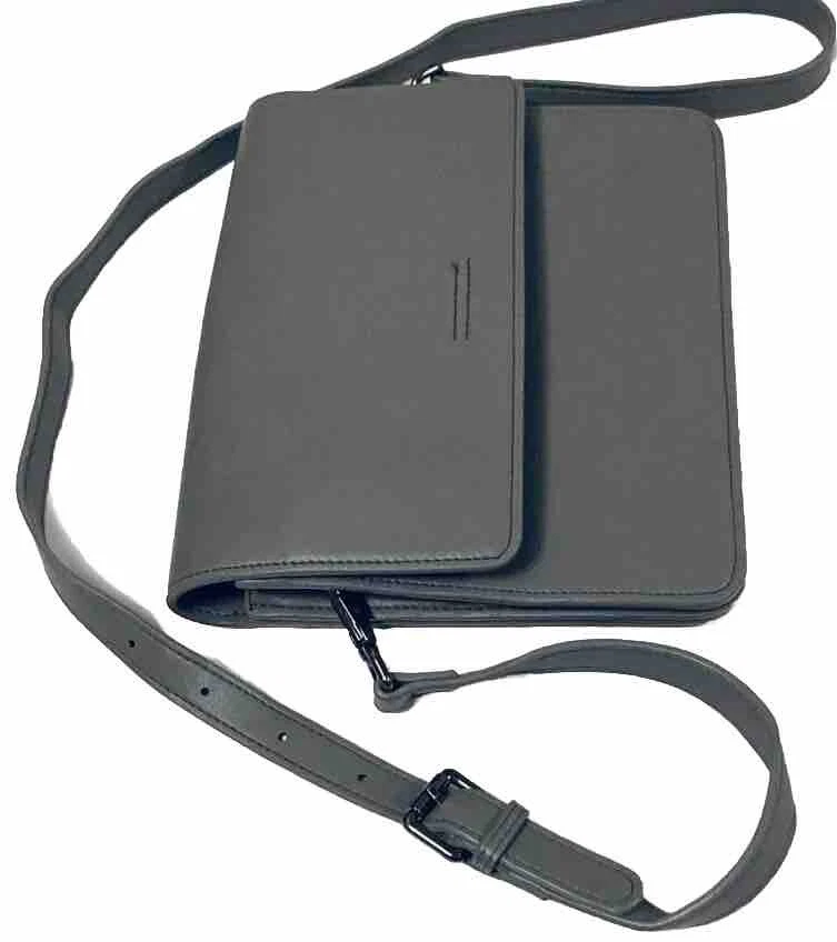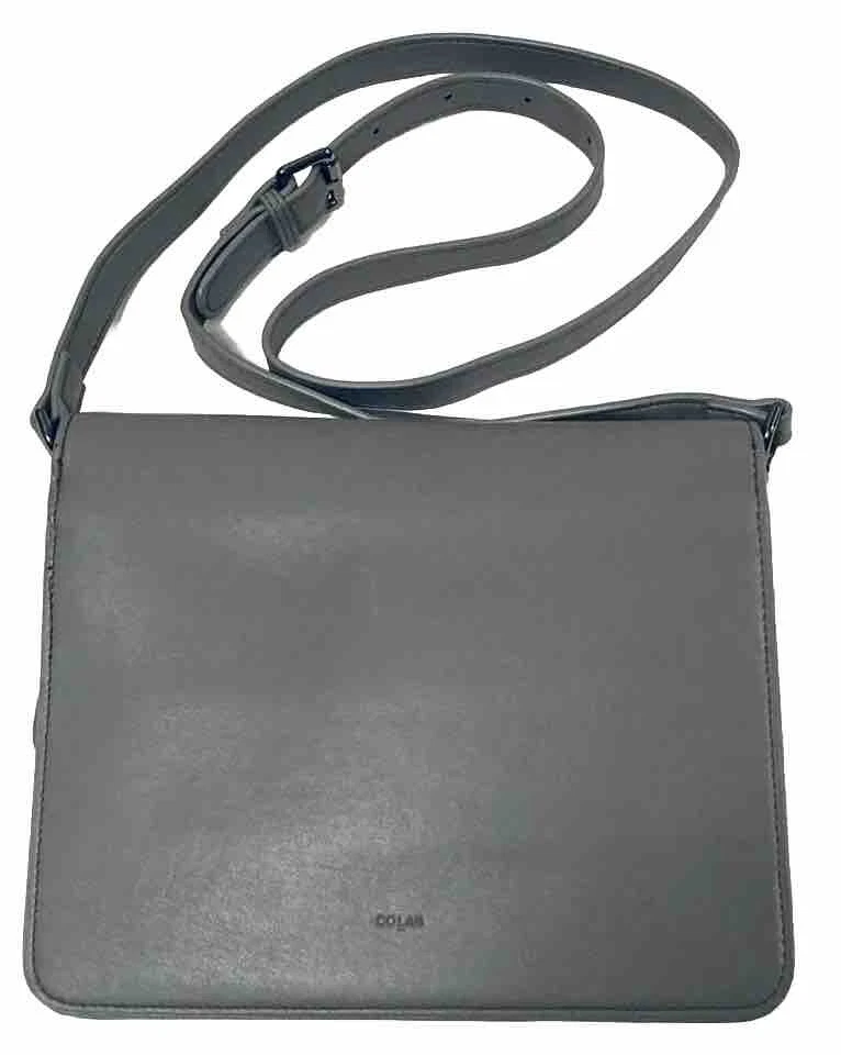 COLAB (Montreal) Vegan Leather Crossbody Bag Purse Grey Envelope Style Multiple Pockets PETA-Approved high-quality vegan leather. Ethical, Cruelty-Free. Designed in Montreal since 2007 Bag measures 7-1/2” x 9”. Adjustable strap, multiple compartments and snap closure for secure storage. Overall good condition. Fast shipper.
