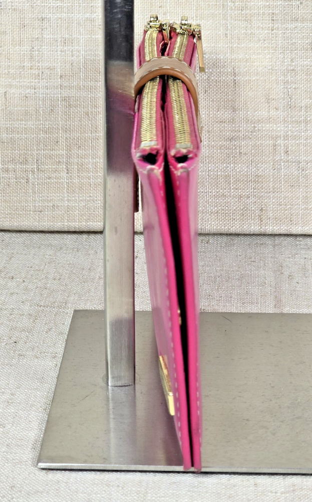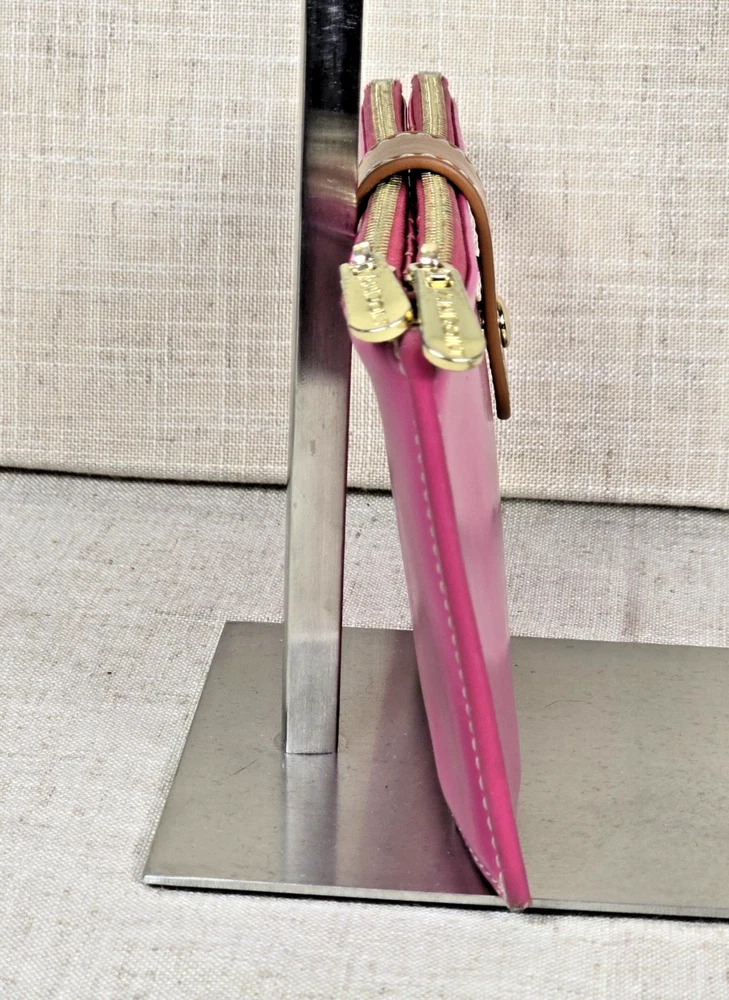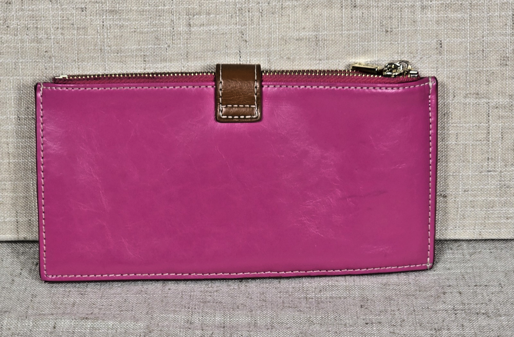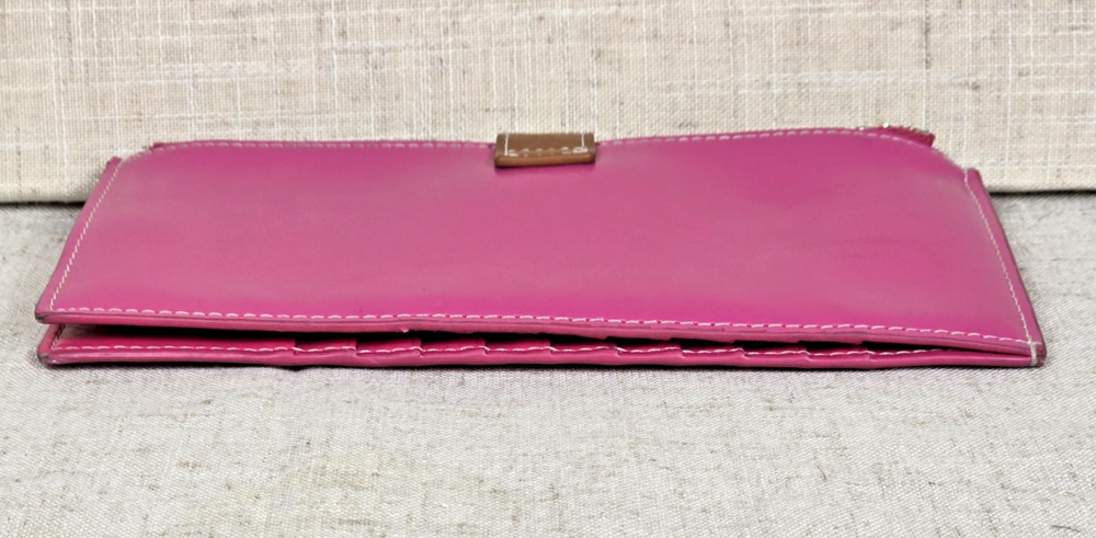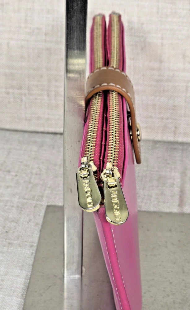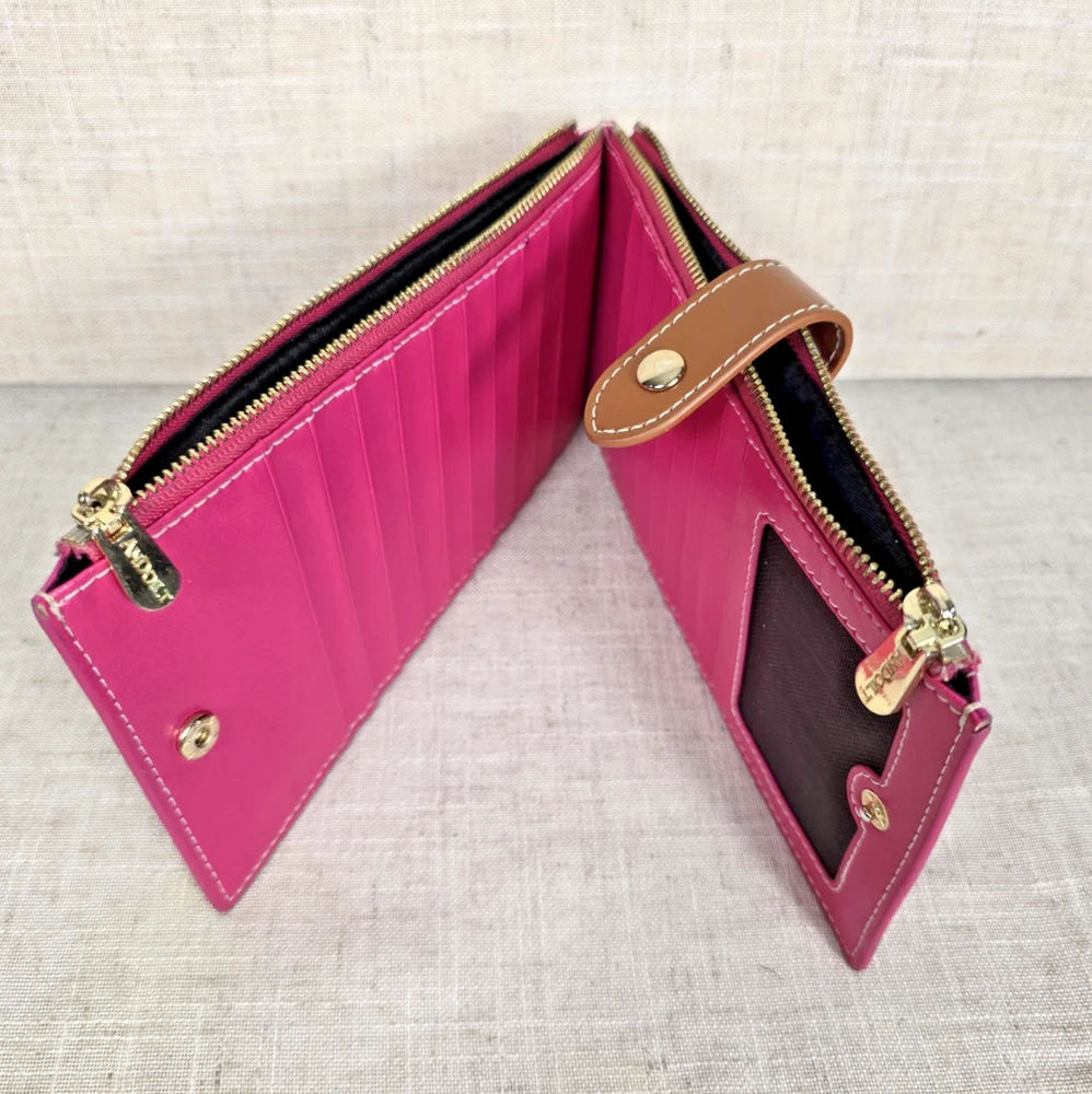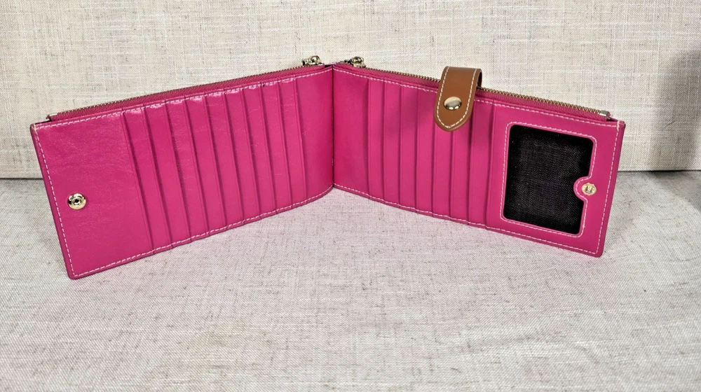 Andoilt Thin Pink Leather Wallet With Zippers This wallet will hold 17 cards There is an ID window, 2 larger zippered compartments, and snap closures