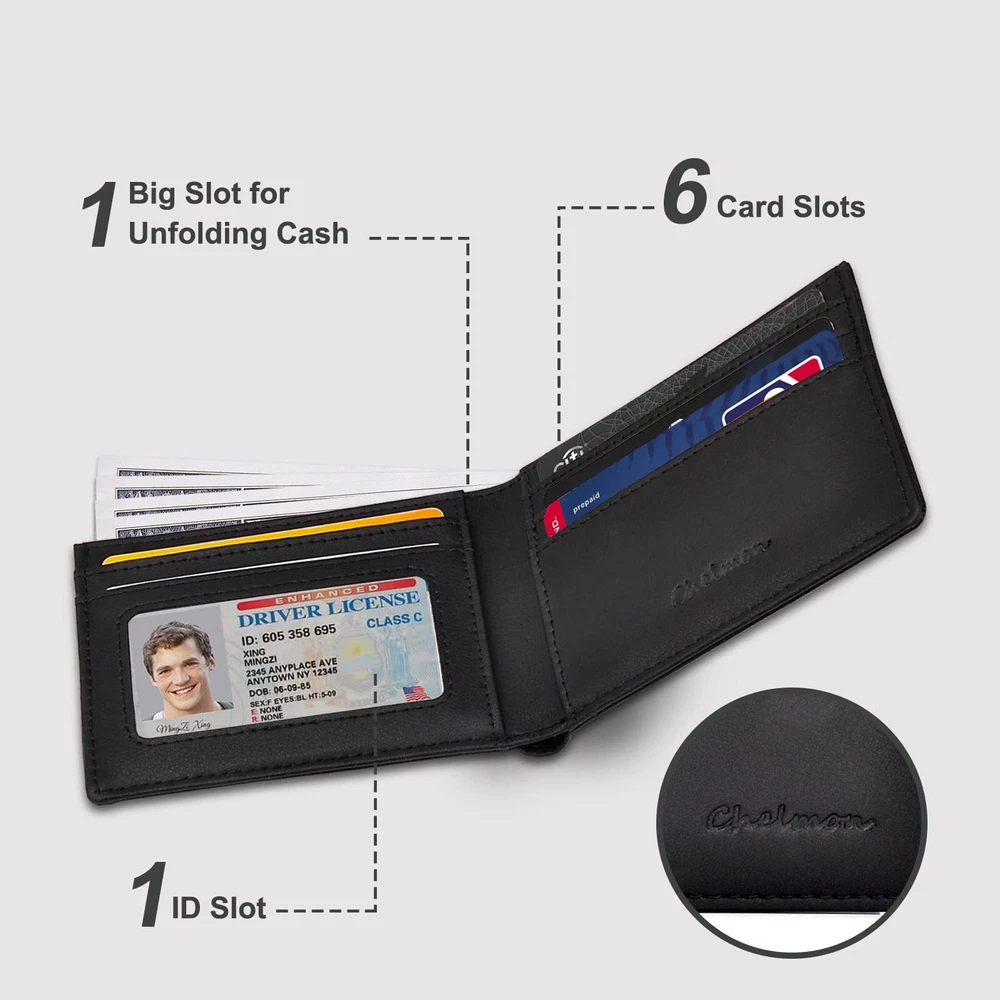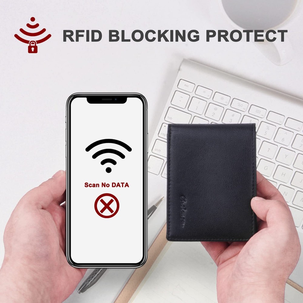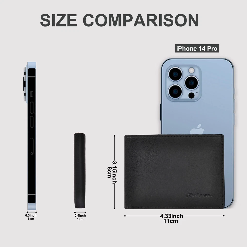 Chelmon Slim Wallet for Men ID Window with RFID Blocking Front Pocket Minimalist Features: ★ULTIMATE SLIM:The measurement size is only 4.33‘’ x3.15‘’ x 0.4''. Chelmon minimalist wallet can perfectly fits in the pants / front pocket,handbag,backpack and etc, which do not make your suit or your pants overstuffed. It is easily for carrying business cards, credit and debit cards, bills etc. ★FUNCTIONAL DESIGH:Including 1 ID slot, 6 card slots (2 hidden card slots), 1 big slot for unfolding cash.It can simultaneously meet your fashion and practicability requirements. ★GENUINE LEATHER & RFID BLOCKING SECURITY:High quality crazy horse leather, soft and durable. You can get Super high quality products for cheap for Chelmon. Our wallet lining also has advanced RFID Blocking Secure Technology, any RFID signal working at a frequency of 13.56 MHz will be blocked. Your credit cards, debit cards, driving license and ID cards will be protected effectively. ★IDEAL GIFT FOR MEN:Choose Chelmon wallet for yourself, your Dad, Grandpa, Friend, Brother, Boyfriend, In Law or Husband. It will be a meaningful and ideal gift for men. ★1 YEAR WARRANTY:Customer satisfaction is our first priority, 1 year warranty service will be provided. If you have any questions, please do not hesitate to contact us. We will reply you and deal with the problem within 24 hours. Features: ★ULTIMATE SLIM:The measurement size is only 4.33‘’ x3.15‘’ x 0.4''. Chelmon minimalist wallet can perfectly fits in the pants / front pocket,handbag,backpack and etc, which do not make your suit or your pants overstuffed. It is easily for carrying business cards, credit and debit cards, bills etc. ★FUNCTIONAL DESIGH:Including 1 ID slot, 6 card slots (2 hidden card slots), 1 big slot for unfolding cash.It can simultaneously meet your fashion and practicability requirements. ★GENUINE LEATHER & RFID BLOCKING SECURITY:High quality crazy horse leather, soft and durable. You can get Super high quality products for cheap for Chelmon. Our wallet lining also has advanced RFID Blocking Secure Technology, any RFID signal working at a frequency of 13.56 MHz will be blocked. Your credit cards, debit cards, driving license and ID cards will be protected effectively. ★IDEAL GIFT FOR MEN:Choose Chelmon wallet for yourself, your Dad, Grandpa, Friend, Brother, Boyfriend, In Law or Husband. It will be a meaningful and ideal gift for men. ★1 YEAR WARRANTY:Customer satisfaction is our first priority, 1 year warranty service will be provided. If you have any questions, please do not hesitate to contact us. We will reply you and deal with the problem within 24 hours. eBay integration by