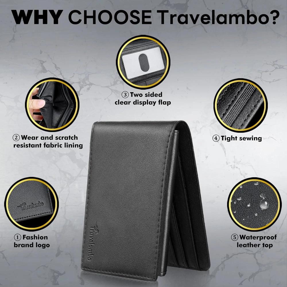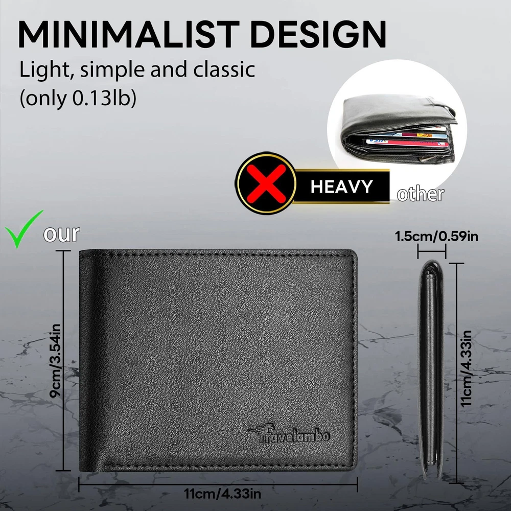 Wallet for Men, Premium Classic Mens Wallet Minimalist Slim Bifold Wallet, RFID Features: 3 IN 1 Large-Capacity Wallet: Slim and roomy, this minimalist wallet for men boasts 10 card slots, 2 cash slots, and 2 ID windows, effortlessly holds all your cards without adding bulk to your pocket, helps you stay organized, efficient yet elegant The Superior Craftsmanship: This mens wallet is meticulously hand-sewn from high-quality, thick leather; The stitching is straight and tight; The smooth surface has no cracks or notches; Surface waterproof is not easy to damage the interior;Durable and cost-effective. Advanced RFID Blocking:Our Travelambo Bifold wallet employs cutting-edge RFID Wave Blocking technology composite material that blocks RFID signals at 13.56 MHz or higher frequencies; Perfectly protects your privacy, travel with peace of mind Showcase Men's Charm: Selecting a superior compact wallet is a crucial element of a refined man's discerning taste; This exquisite texture not only exudes an air of aristocracy but also create a unique and exclusive temperament that is uniquely yours; You're Worth It The Surprise is on the Way: A distinctive present (anniversary, weddings, birthdays, Father's Day, Valentine's Day) for grandpa, boyfriend, husband and father; Each time he uses this unique RFID wallet, it will evoke cherished memories Details: Description Get Your Hands on Our SLEEK Men’s Wallets We have such a large variety of SLEEK men’s wallets that you’re going to have a hard time choosing your favorite. Lucky for you – and because we love you so much – these accessories feature delicious details, high performing functionality and classic silhouettes that will easily fit right into your life and style. It’s ready to keep your look fresh wherever your day takes you. Carry one of our fashion wallets with you to the gym; they easily fit inside of your locker without getting lost or taking up a lot of space. Then you can easily grab your juice on the way out or stop by the coffee shop before going home to clean up. When you’re ready to start your day, slip one of these beauties into your purse and head into the office without missing a beat. On the weekends, you’ll love grabbing one of our Travelambo mens wallet in the morning and heading out for a day of shopping with girlfriends, running errands and then back with girlfriends for a night out on the town. You’ll love how versatile these wallets are and the ease they add to your routine. Features: 3 IN 1 Large-Capacity Wallet: Slim and roomy, this minimalist wallet for men boasts 10 card slots, 2 cash slots, and 2 ID windows, effortlessly holds all your cards without adding bulk to your pocket, helps you stay organized, efficient yet elegant The Superior Craftsmanship: This mens wallet is meticulously hand-sewn from high-quality, thick leather; The stitching is straight and tight; The smooth surface has no cracks or notches; Surface waterproof is not easy to damage the interior;Durable and cost-effective. Advanced RFID Blocking:Our Travelambo Bifold wallet employs cutting-edge RFID Wave Blocking technology composite material that blocks RFID signals at 13.56 MHz or higher frequencies; Perfectly protects your privacy, travel with peace of mind Showcase Men's Charm: Selecting a superior compact wallet is a crucial element of a refined man's discerning taste; This exquisite texture not only exudes an air of aristocracy but also create a unique and exclusive temperament that is uniquely yours; You're Worth It The Surprise is on the Way: A distinctive present (anniversary, weddings, birthdays, Father's Day, Valentine's Day) for grandpa, boyfriend, husband and father; Each time he uses this unique RFID wallet, it will evoke cherished memories Details: Description Get Your Hands on Our SLEEK Men’s Wallets We have such a large variety of SLEEK men’s wallets that you’re going to have a hard time choosing your favorite. Lucky for you – and because we love you so much – these accessories feature delicious details, high performing functionality and classic silhouettes that will easily fit right into your life and style. It’s ready to keep your look fresh wherever your day takes you. Carry one of our fashion wallets with you to the gym; they easily fit inside of your locker without getting lost or taking up a lot of space. Then you can easily grab your juice on the way out or stop by the coffee shop before going home to clean up. When you’re ready to start your day, slip one of these beauties into your purse and head into the office without missing a beat. On the weekends, you’ll love grabbing one of our Travelambo mens wallet in the morning and heading out for a day of shopping with girlfriends, running errands and then back with girlfriends for a night out on the town. You’ll love how versatile these wallets are and the ease they add to your routine. eBay integration by