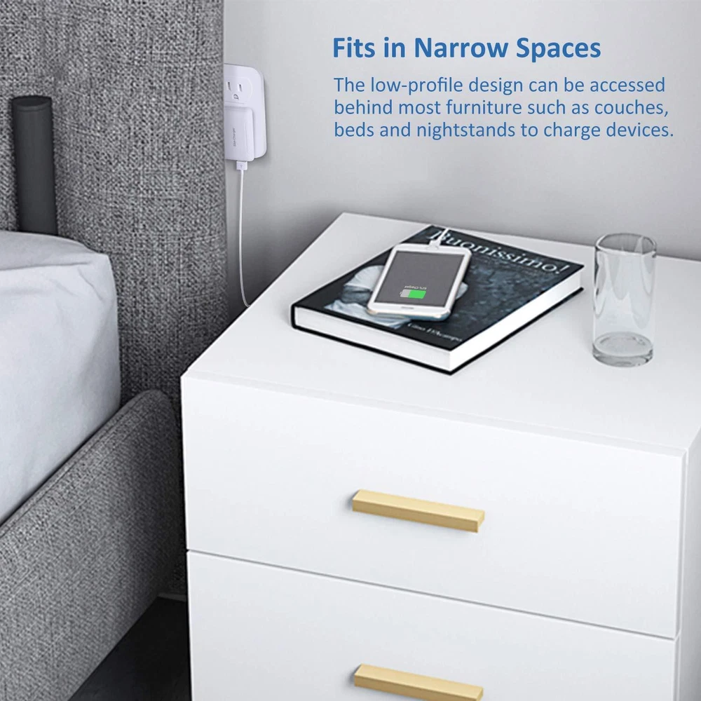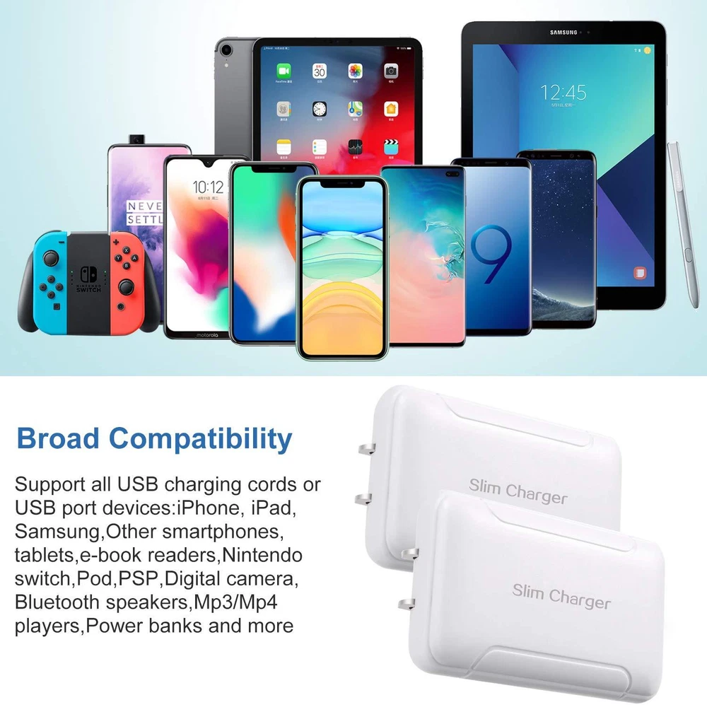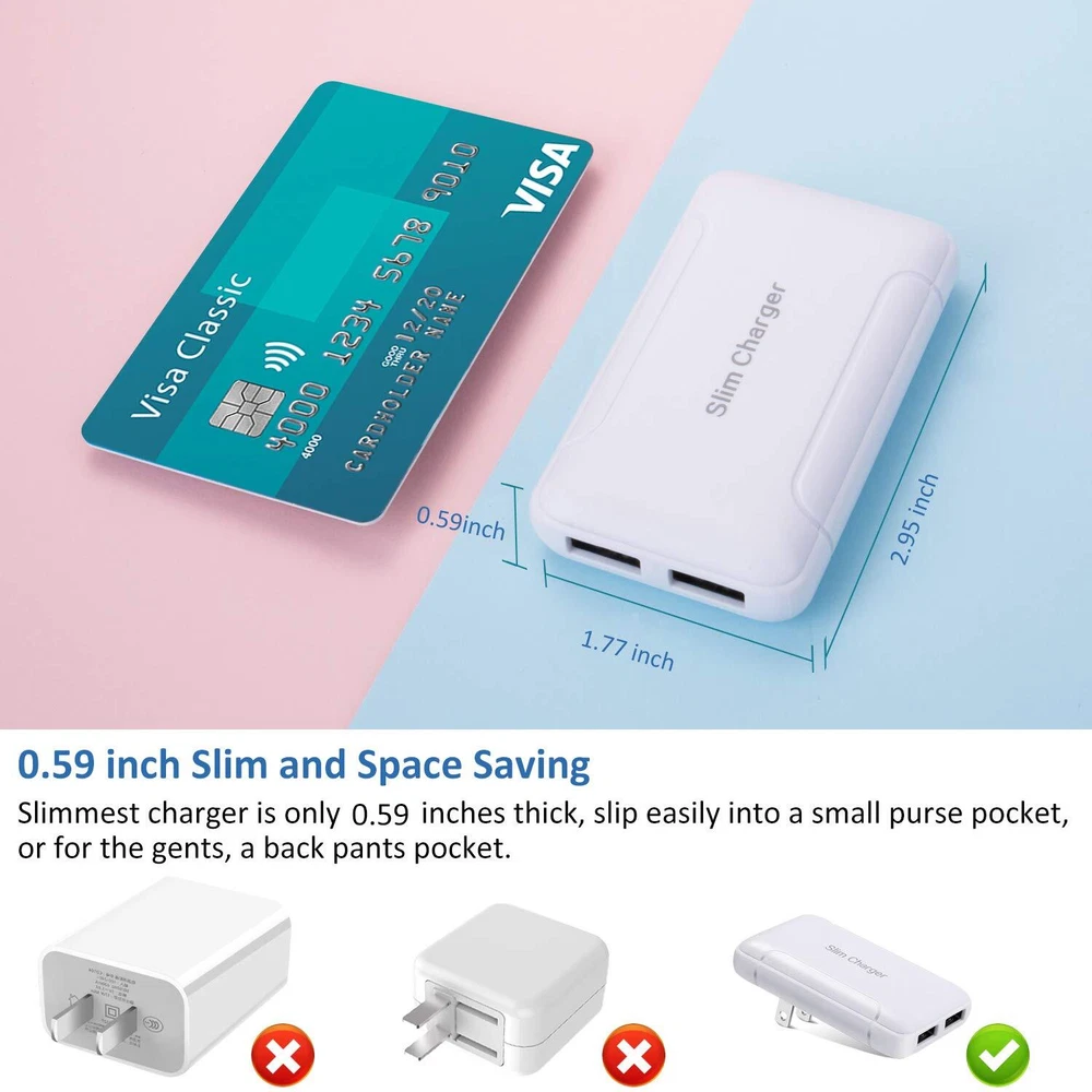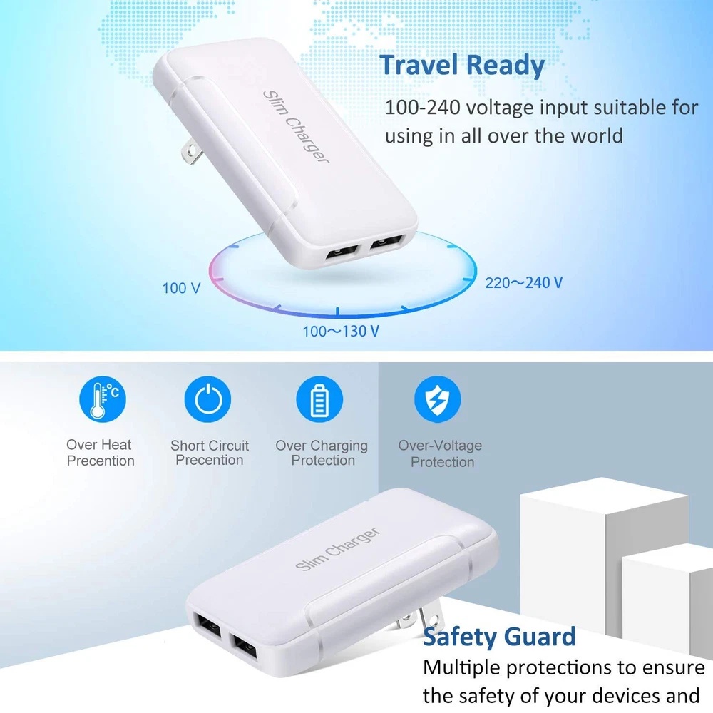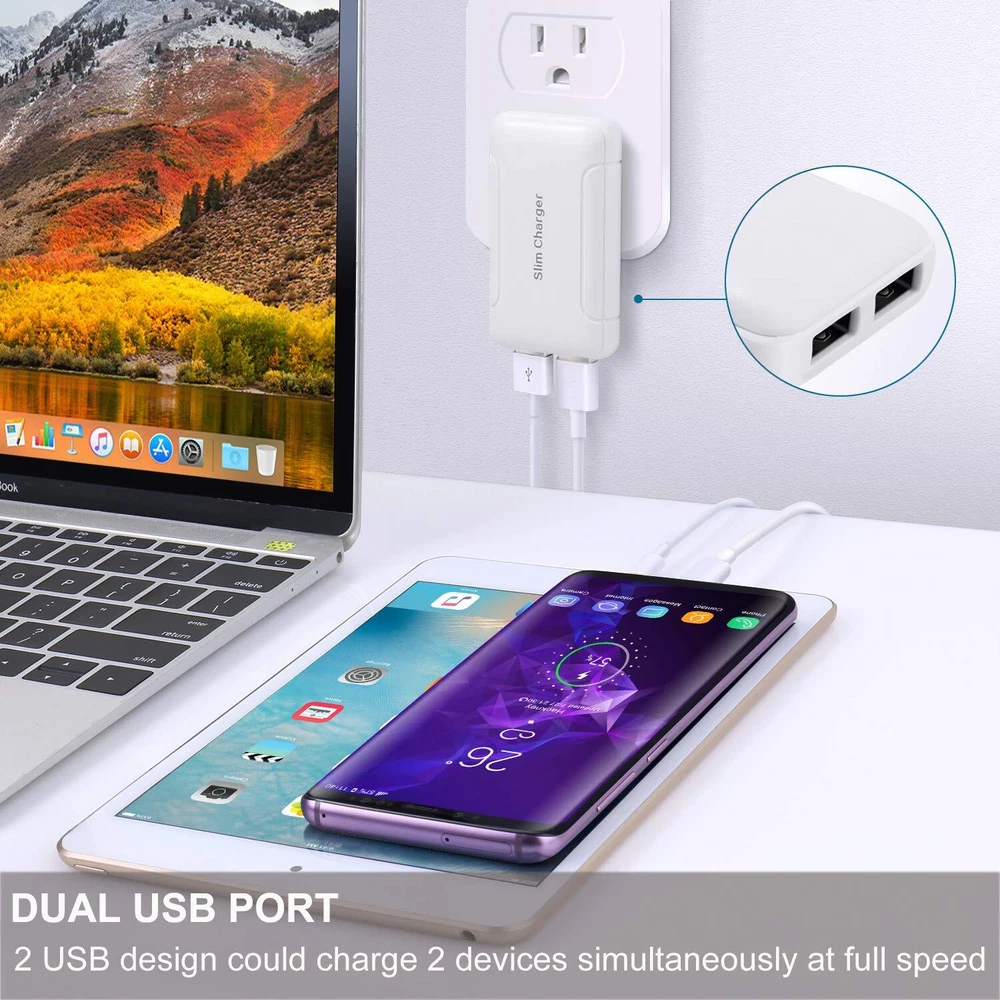 [2-Port Fast Charging & Smart IC technology]: Dual USB output with total current 3.0A(max)/5V and input with 100-240V enables you to charge 2 mobile devices simultaneously at high speed, Maximum output 3.0A(★Does not support Qualcomm Quick Charge★). i-Smart technology automatically detects and provides optimal charging current for connected devices to ensure the fastest, safest, and most efficient charging experience. [Slim for Narrow Space & Cable Friendly]: Features a beautiful, glossy ultra thin design, 0.59 inch is slim enough to use in those awkward, hard-to-reach wall sockets behind furnitures such as couches, beds and night stands to charge devices. The USB ports come out the bottom so the cables will naturally extend to follow the wall instead of sticking straight out, which will allow the cable to last longer with less wear and tear. [Compact Design & Foldable Plug]: It has portable size (2.95 x 1.77 x 0.59 inches) and weighs at 56g. And optional 110v-220v input, which is perfect for home, business, and travel. The foldable plug allows the USB wall charger to slide easily into your pocket,whether you are on vacation or on a business trip. [Wide Compatible]: USB wall charger is compatible with various electronic devices and phone models, from iPad, iPhones, Samsung Galaxy, HTC Nexus, Nokia, Blackberries, One plus, LG, Moto, Mp3 Players, Kindle, PS4, Xbox, Bluetooth speakers, headsets, power banks and other USB-enabled devices. [Premium Materials & Protection System]:Built with high-quality ABS Shells and premium interior components, this fire-resistant wall charger ensures perfect performance. Multi-Protection safety system ensures a comprehensive protection for users and their devices. This greatly prevents the charger from overheating, overloading, or overcharging.