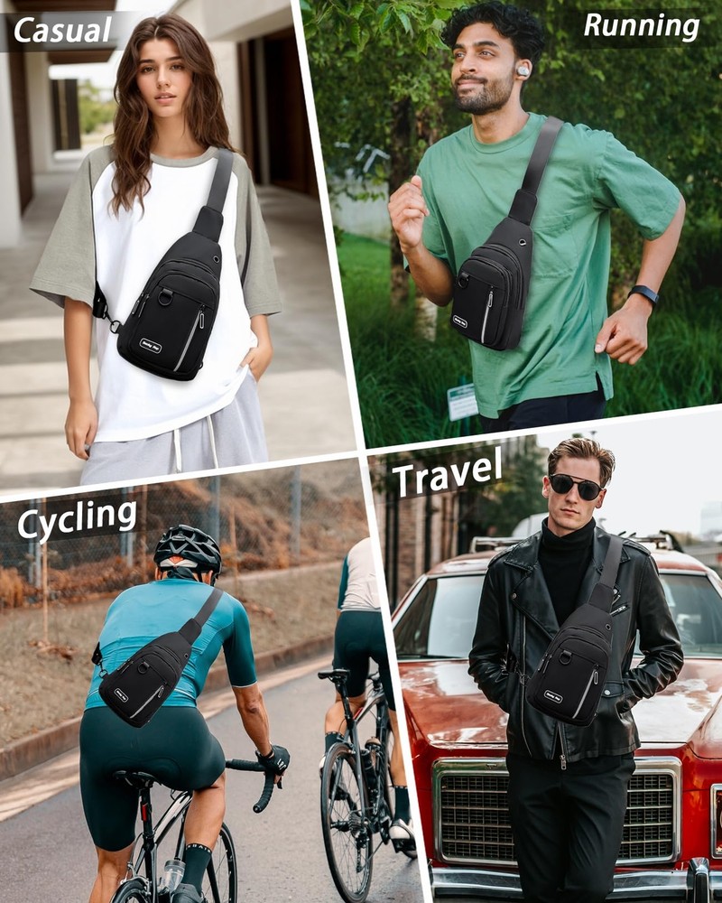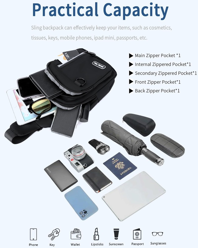 【Reversible Sling Bag】Ths sling bag is perfect for men and women. The straps are flexible and adjustable, and you can also adjust the left and right shoulders to suit your own habits. 【Large Capacity】Size(L x W x H): 6.69 x 3.15 x 11.41 inches. Cross bady bag with multiple pockets including a Internal security zip pocket. Sling backpack can effectively keep your items, such as cosmetics, tissues, keys, mobile phones, ipad mini, passports, etc. 【Nice Materials】Sling Backpack is made of nylon material, which is durable, scratch-resistant, waterproof and lightweight. 【Safety Pockets】 The back of the chest bag has a zippered pocket for important items to prevent pickpocketing, easy to travel. 【Multipurpose Crossbody Bags】The chest bag that can be used as sling backpack, shoulder bag, work bags, purse, casual daypack, fanny pack, business bag, perfect for travel, hiking, cycling, music festival, outdoor activities and other occasions. It’s lightweight and comfortable, enjoy an easier and happier life!