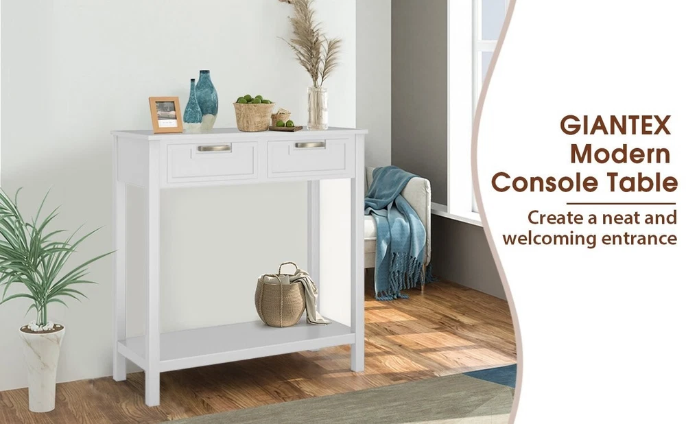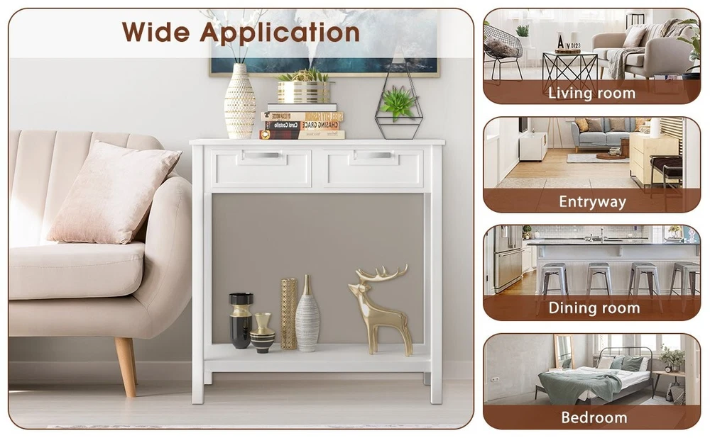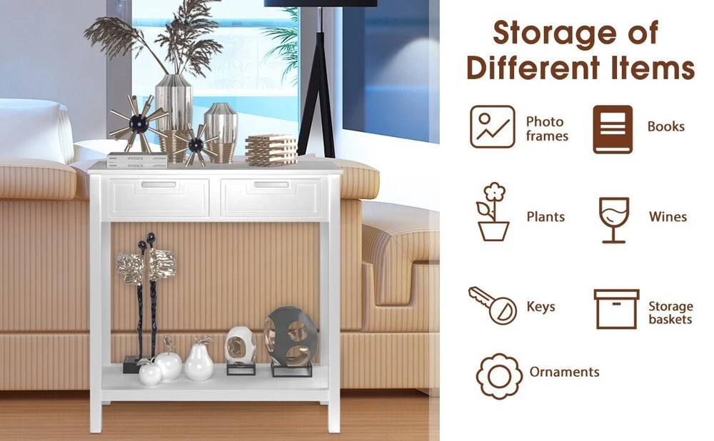 Entryway Narrow Console Wooden Table With Storage Drawers & Open Organizer Shelf ● Narrow Console Table with Storage: The 31.5"L x 14"W x 32"H console table fits limited room yet to bring ample storage space. It features a spacious tabletop, 2 pull-out drawers and a bottom storage shelf to meet storage or display needs. ● Sturdy Construction with Solid Wood Legs: Crafted with premium MDF panels and solid rubber wood legs, the entryway table has a strong bearing capacity and long lifespan. Plus, the adjustable foot pads further improve overall stability. ● Anti-tipping Device for Extra Security: Worried about mischievous kids or furry friends? Get relaxed! This accent table comes with anti-tipping device to prevent falling accidents. And the drawers are also equipped with stoppers to avoid sliding off. ● Elegant and Versatile Addition: The sofa table looks stylish and elegant. It comes to elevate your room decoration to the next level. Besides, with practicable functions, the table can serve well in entryway, living room, dining room, etc. ● Pre-installed Design for Quick Assembly: The foyer table comes partly pre-installed, leaving you some simple steps to finish assembly. Plus, the detailed instruction and labeled accessories will also be of great help. Color: White Material: MDF, Rubber Wood Overall Dimensions: 31.5" x 14" x 32" (L x W x H) Bottom Shelf Dimensions: 27.5" x 12" x 19" (L x W x H) Clearance Between Bottom Shelf and Ground: 4" Interior Dimensions of Drawer: 11"x 10" x 4" (L x W x H) Front Panel of Drawer: 12"x 4.5" (L x W) Weight Capacity of Tabletop: 110 lbs Weight Capacity of Bottom Shelf: 44 lbs Net Weight: 25 lbs