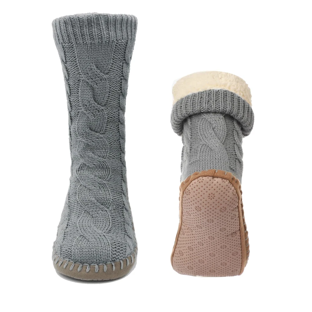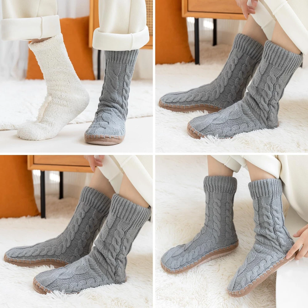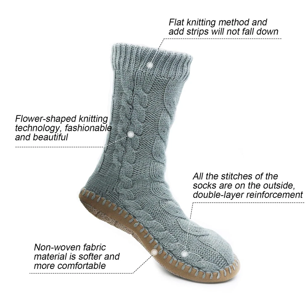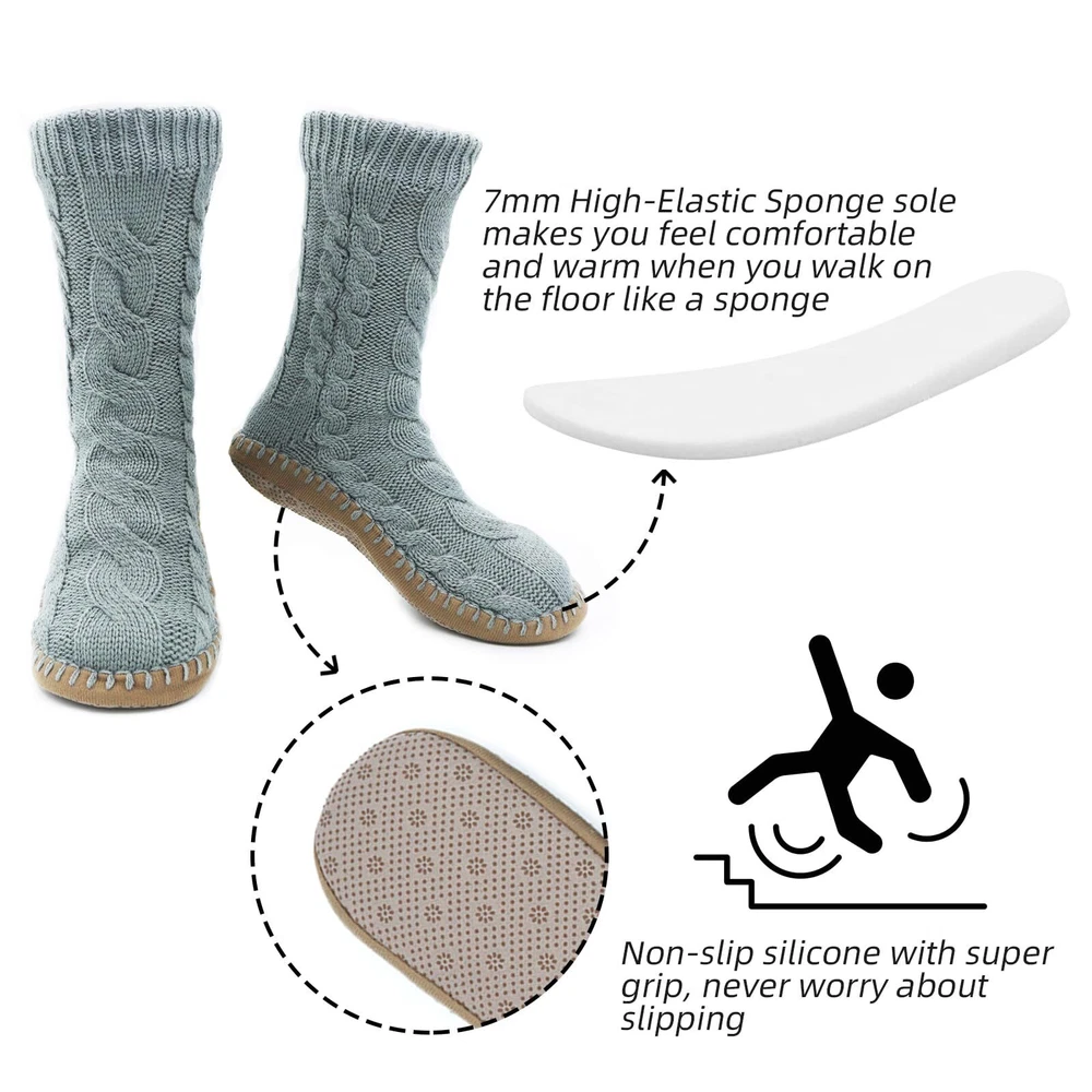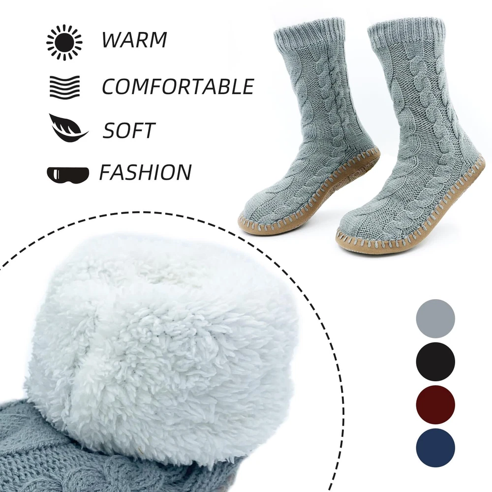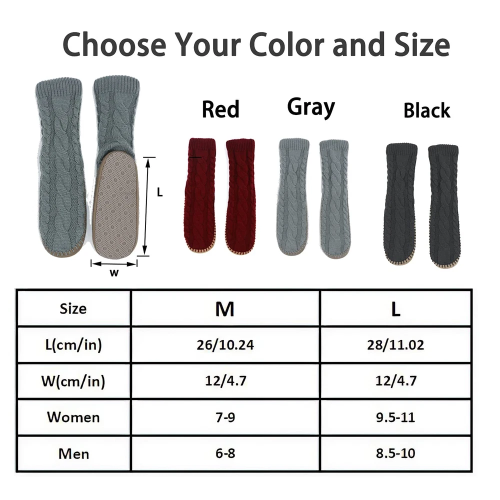 Description GETTING A HUG FOR YOUR FEET! These thick Slipper sock is great for the frosty evenings and mornings. Nice foot ware for wood floors. Soft cottony Lined is so comfortable against the skin. Once put on, your toes stay warm and cozy. If you have poor circulation or suffering with cold feet, this slipper socks for women would be a good choice.They are comfortable for him to wear around the house. Bring warmth to elderly feet and someone in the hospital,wears them on these cold winter days. Non Skid Knit Slipper Socks For Women Soft sponge sole is padded to the slipper sock. The rubber skid proof dots on the bottom are also very effective. No worries about slipping on the laminate floors in house. Very nice design for house use. Nice Color, Small and Large Size Gray, Red, Black, Navy, 4 color is available. M up to size 9 L up to size 11 1 Warm Slipper Socks - This thick lined slipper sock for women are light and warm. Super comfortable, especially when you have to walk around a cold house on a cold winters day. Our women’s slipper socks keep your feet warm. 2 Cozy Slipper Socks - Soft Sponge sole is padded on the Fuzzy Slipper Socks bottom. Soft and warm inside, like walking on a cloud. Toasty Toes in the Morning. Easy to put on and off. 3 Non Slip Slipper Socks - Our sock slippers for women is slid free. They have little grippers on the bottom,keep you safe. You are cozy and don't slip around on your feet or slip on the floor. 4 Washable Women Slipper Sock - They are washed up easily by hand or washed in laundry, but puts them into a mesh bag , then hangs them overnight to dry. 5 Christmas Go to Present - These are perfect for someone have sensitive cold feet Or elderly feet. Especially if it’s snowing, slipper sock would be cute holiday socks to give as a present , keeping their feet warm and comfy on a cold winters day.