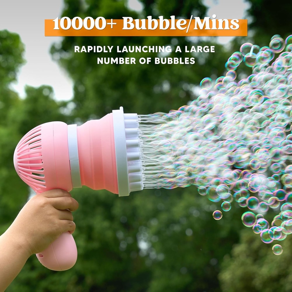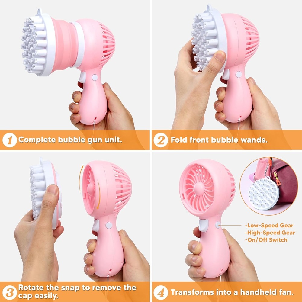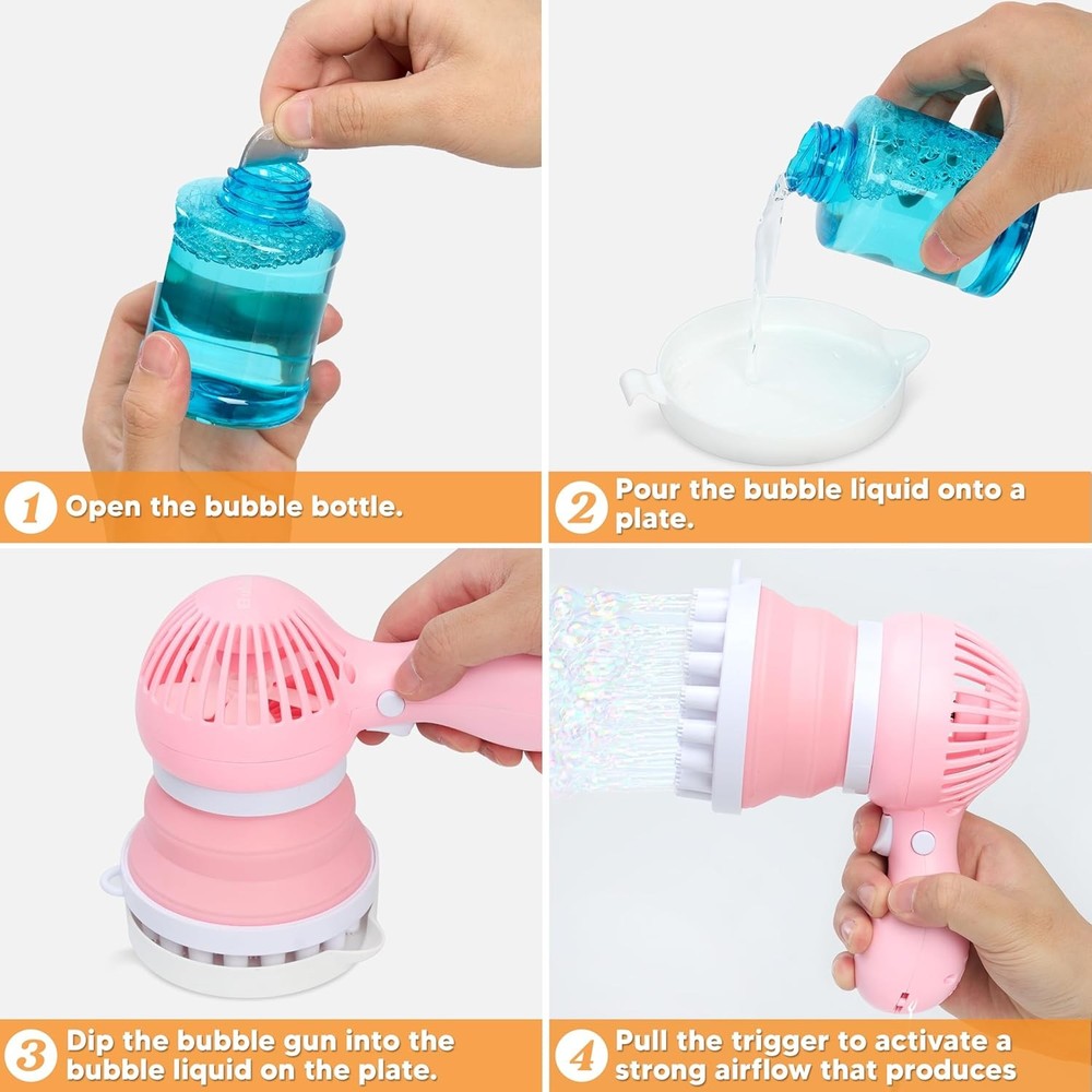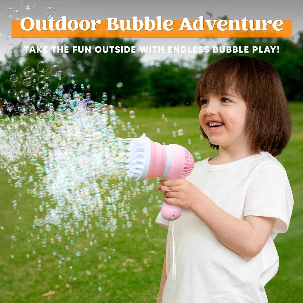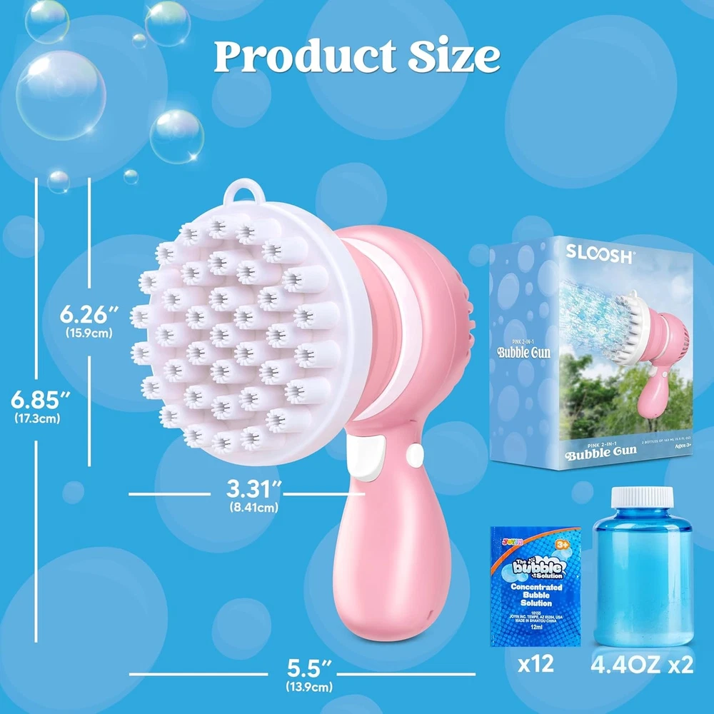 Sloosh Bubble Machine Gun with Solution Refill, Removable Fan, Rocket Pink LuxeFusion Product Description Features AWESOME SETS: Elevate the bubble fun with our bubble gun for toddlers, kids, adults featuring 1 bubble machine gun,1 water tray for dipping, 2 bottles of 140ml bubble liquid, 12 packs of concentrated bubble solution refills(12ml), 1 Tape-C charging cable, 1 lanyard and 1 hookthe, bubble guns for kids offering a awesome package for a bubbly extravaganza. Portable and entertaining bubble-blowing wherever you go. UNLEASH BUBBLE: Immerse yourself in a mesmerizing display of bubbles with the exceptional feature of producing more than thousands of bubbles per minute, creating a dazzling spectacle for endless enjoyment. Experience durability and reliability with our bubble machine, crafted from shatterproof ABS materials, ensuring a high-quality and long-lasting bubble-blowing experience. 2-IN-1 DESIGN: Our bubble machine gun combines blowing bubbles with a handheld fan. The bubble gun body is made of moldable rubber material. It can be folded by pressing. By rotating the bubble gun wand, the gun body and the handheld fan can be separated. You can enjoy the coolness brought by the fan at any time. The gun body can be hung on your backpack or anywhere you want with our included lanyard and hook. easy to carry. Tape-C Charging Cable: Are you still worried about the old-fashioned rechargeable batteries? Our sloosh bubble gun for kids has a brand new charging method, using a Tape-C charging interface, which does not require you to remove the rechargeable battery, making it convenient, fast and safe, ensuring a high-quality and long-lasting bubble-blowing experience. PERFECT FOR OUTDOOR FUN: Take the bubbles refill gun outdoors or party with our blue bubble guns for kids ages 4-8, creating an atmosphere of joy and playfulness for memorable moments. Prioritize safety and entertainment with our bubble gun, providing a safe and engaging activity that captivates children's imaginations and enhances outdoor play. making them great for bubbles party favors, summer, outdoor toy, Easter, Wedding, Birthday and everyday entertainment. Product Details Product Dimensions: 5.5 x 3.86 x 6.85 inches Item Weight: 1.83 pounds Country of Origin: China Manufacturer recommended age: 3 years and up Manufacturer: Joyin US Corp. Free Shipping All orders ship free and fast to your doorstep. Easy Returns Satisfaction guaranteed. 30-day returns, no questions asked. 24/7 Support Contact us anytime; we’re here to help, day or night. Brought to you by LuxeFusion – Quality you can trust.