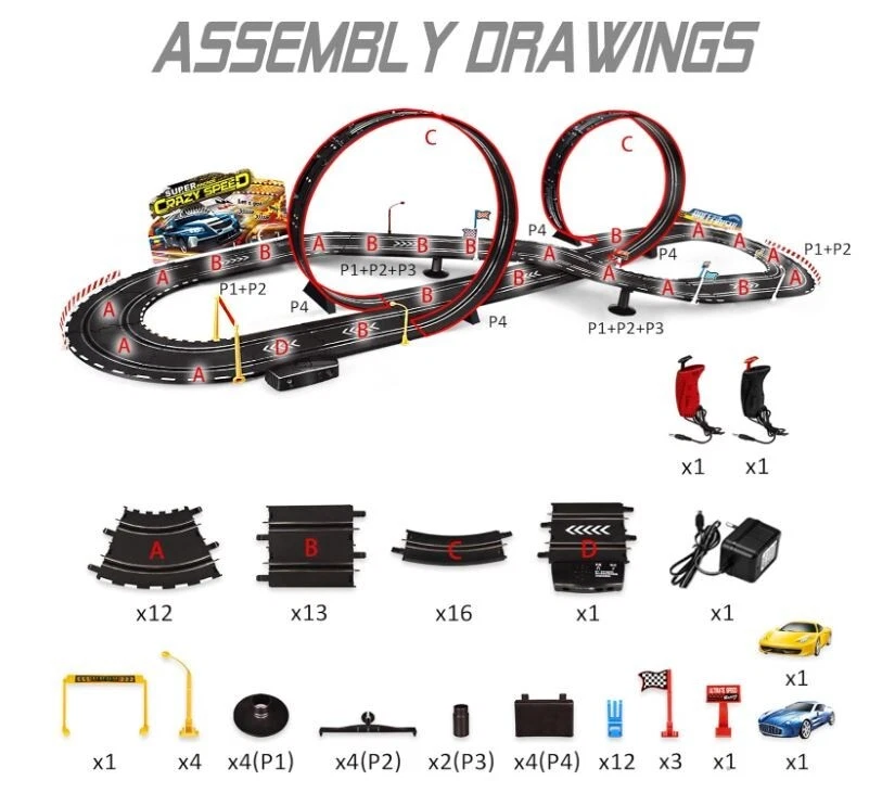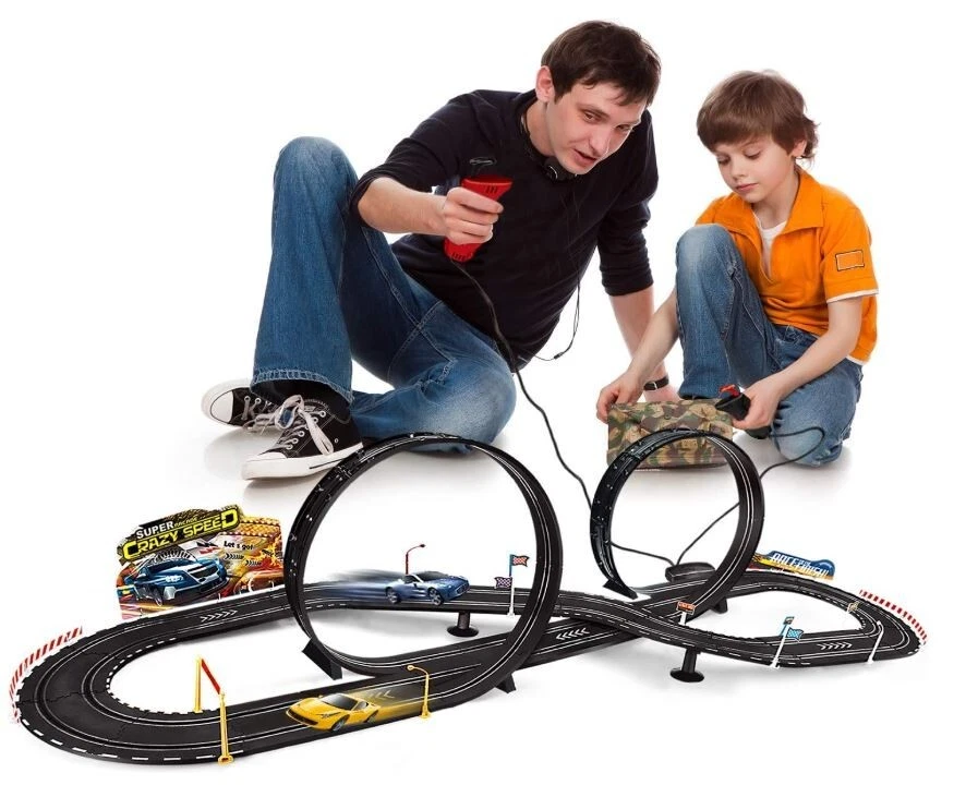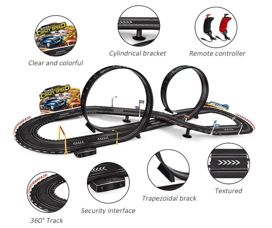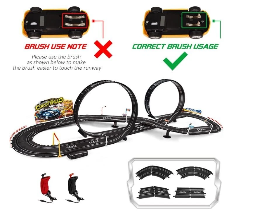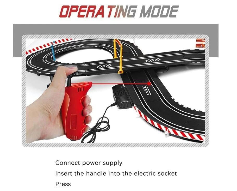 About this item Electric Powered Slot Car Race Track Set - 2 cars of different colors - A perfect slot car set for beginner Racers,for younger kids to learn and develop racing skills at a slower speed! The loop and fly-over turn are both sturdy and easy to put together.includes a number of foundation pieces that help steady the track, along with walls for the turns to prevent the cars from flying off the track. The track goes together well, the cars are nicely detailed and substantial enough that children can handle them easily when putting them on the track. 3 types operation method - Electric - Manual.all are very use friendly.The speed restrictor maintains a prefect speed to complete the loop and not go too fast on the curves. The electric booster button is fun too because you can add a little more push on the straights. Exciting two-player activity-enjoying the fast-paced head-to-head driving action - race to win and then do it again!Expand your racing options for hours of fun,use track expansion sets, accessories, and a wide selection of additional cars to create challenging new races!