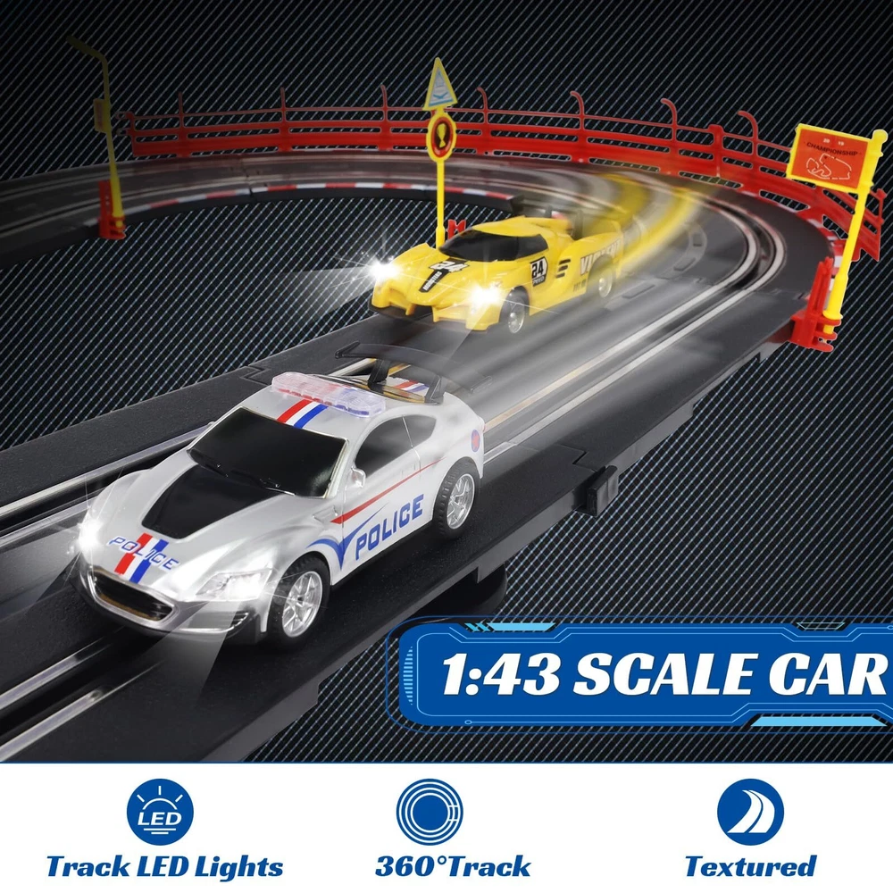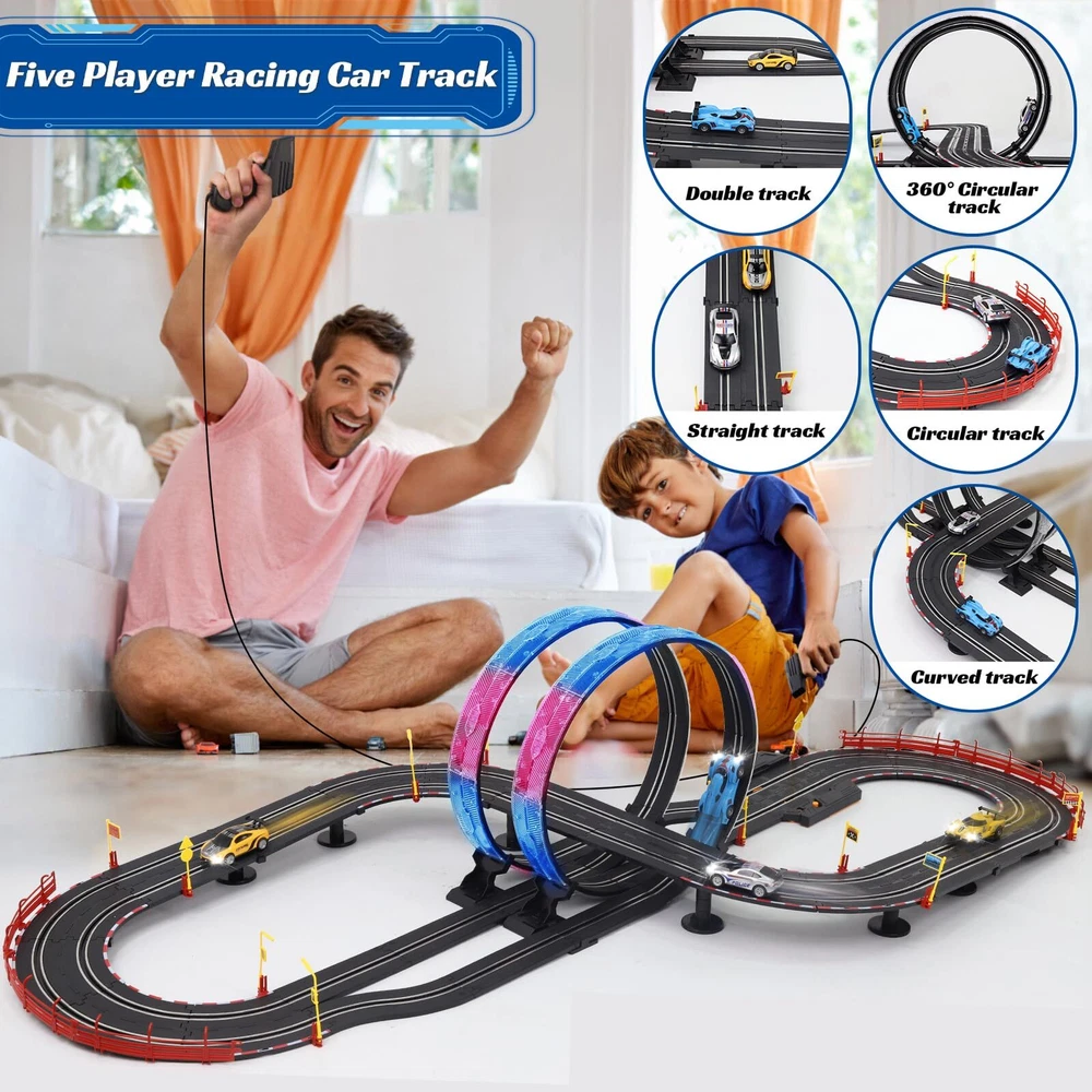 Slot Car Race Track Set Electric Powered Race Track Dual Racing Car Track Set Electric Track with LED Lights: Fast-paced racing action on over 20-FT of track with realistic cars that reach scale speeds.Slot race track set truly restores all kinds of racing tracks, including simple straight track, curved track, 360°circular track and exciting two-lane track.The two 360° loops are equipped with LED lights, giving players a cooler racing experience. 4 Slot Cars with Lights: Feel the power and the speed of the 1:43 scale cars racing on the track at the speed up to about 300-380 mph! The headlights of the four slot cars will all light up while driving. This allows multiple players to engage in thrilling races simultaneously, fostering friendly competition and excitement. The variety of cars adds an extra layer of fun, letting each kids choose their favorite vehicle for the race. Exciting Lap Counter Feature: Race track has the lap counter adds an element of competition and strategy to the races. Tracking laps enhances the overall gaming experience. The lap counter feature adds an extra layer of engagement and competitiveness. 3 Ways or DIY to Assemble: Track playset is easy to assemble and take apart to store. The flexible tracks can be DIY, turned, flexed to layout shapes to inspire your child’s creativity & imagination and exercise hand-eye coordination.In order to keep the car on the track better, we have enhanced the magnetism. Twice the Fun for Two Players: Our race car track for boys age 4-7 8-12 is car toy for two racers, it comes with four 1:43 scale slot cars, two durable remote controls. The flexibility in speed settings accommodates a range of age groups, making it suitable for various skill levels.Where every race is a journey of fun and excitement. Perfect Gift for Kids: Made of environmental abs plastic materials, safe, high quality and durable. No harmful to kids. It is a good choice toys gifts for kids on Easter, Christmas, Halloween, Thanksgiving Day, New Year, etc. Also the best choice for kids Birthday and Christmas gift. It's also be a great race car toys for kids 4 5 6 7 8 9 10 11 12 years old. slot car race track sets Shipping We offer FREE shipping on all orders! We ship within Three business days of payment, usually sooner. We use a selection of shipping services such as UPS, FedEx, USPS etc. We only ship to the lower 48 states, no APO/FPO addresses or PO Boxes allowed. Local pickups and combined shipping options are not provided at this time. Return You can return a product for up to 30 days from the date you purchased it. Any product you return must be in the same condition you received it and in the original packaging. Please keep the receipt. Payment We accept payment by any of the following methods: PayPal Please pay as soon as possible after winning an auction, as that will allow us to post your item to you sooner! Feedback Customer satisfaction is very important to us. If you have any problem with your order, please contact us and we will do our best to make you satisfied. Contact Us If you have any queries, please contact us via ebay. We usually respond within 24 hours on weekdays. Please visit our eBay store to check out other items for sale! Thank you for shopping at our store.